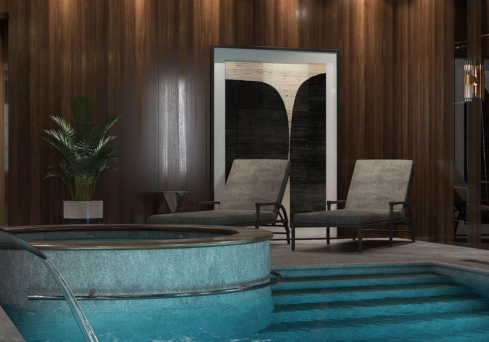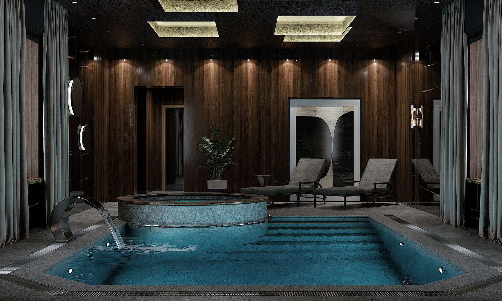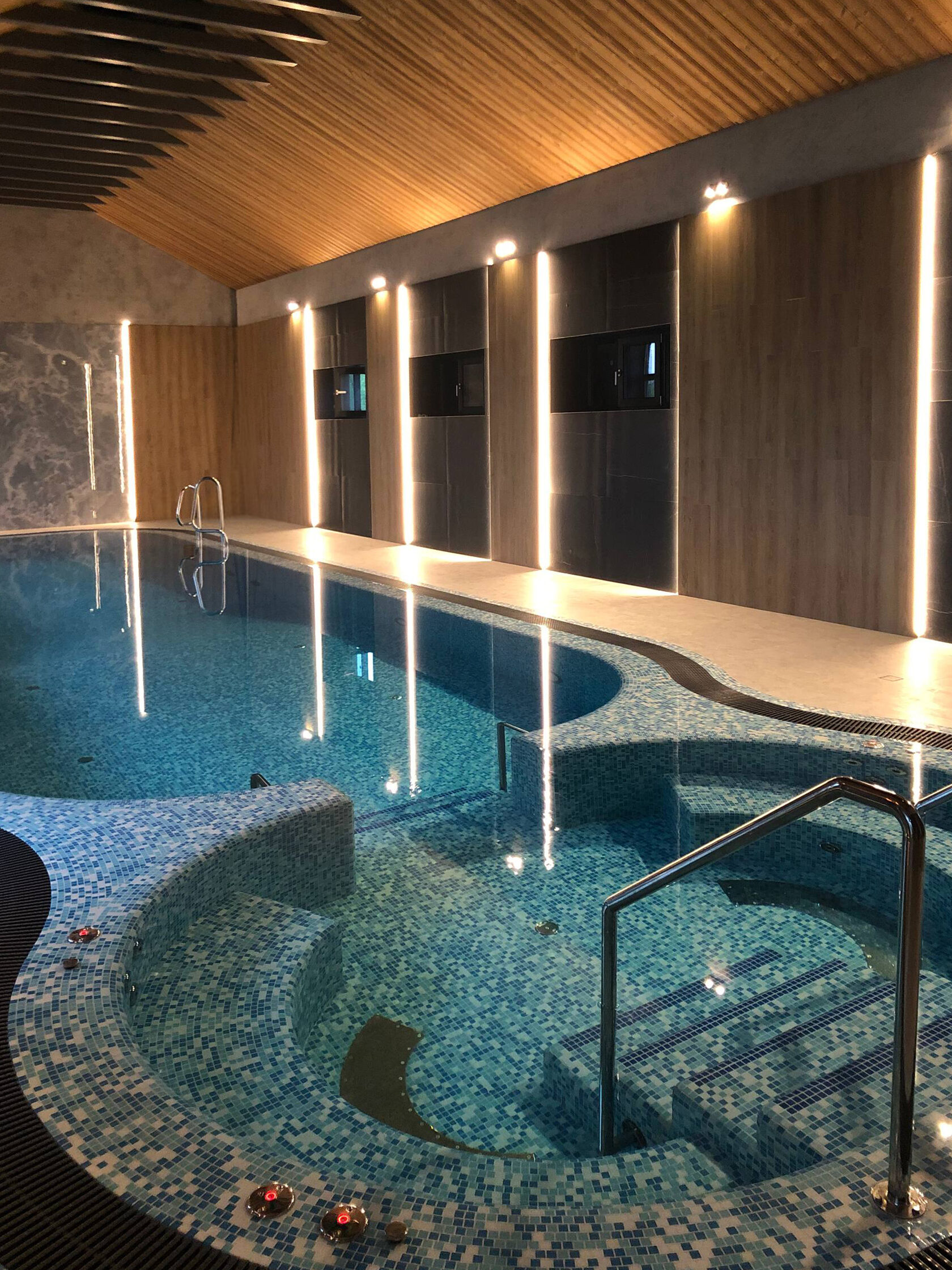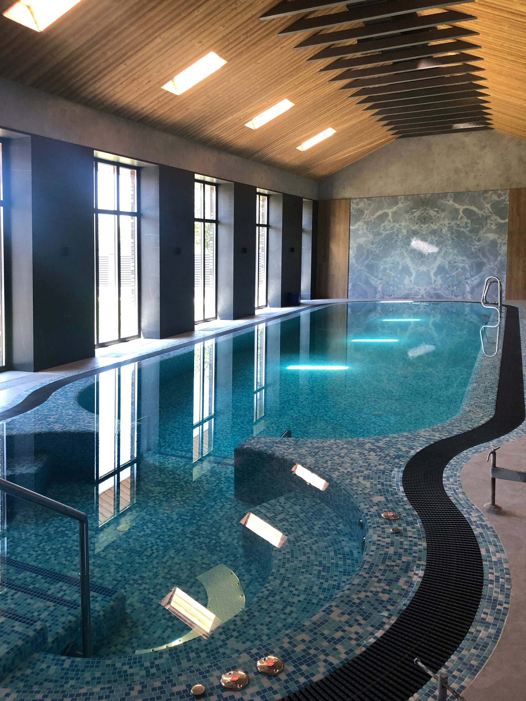 Идея нашего проекта — выйти за рамки традиционного представления о бассейне, превратив его в многослойное эстетическое переживание. Мы создали не просто пространство для плавания, а динамичную среду, где вода, свет и тактильные поверхности вступают в диалог, рождая уникальную атмосферу гармонии и роскоши.