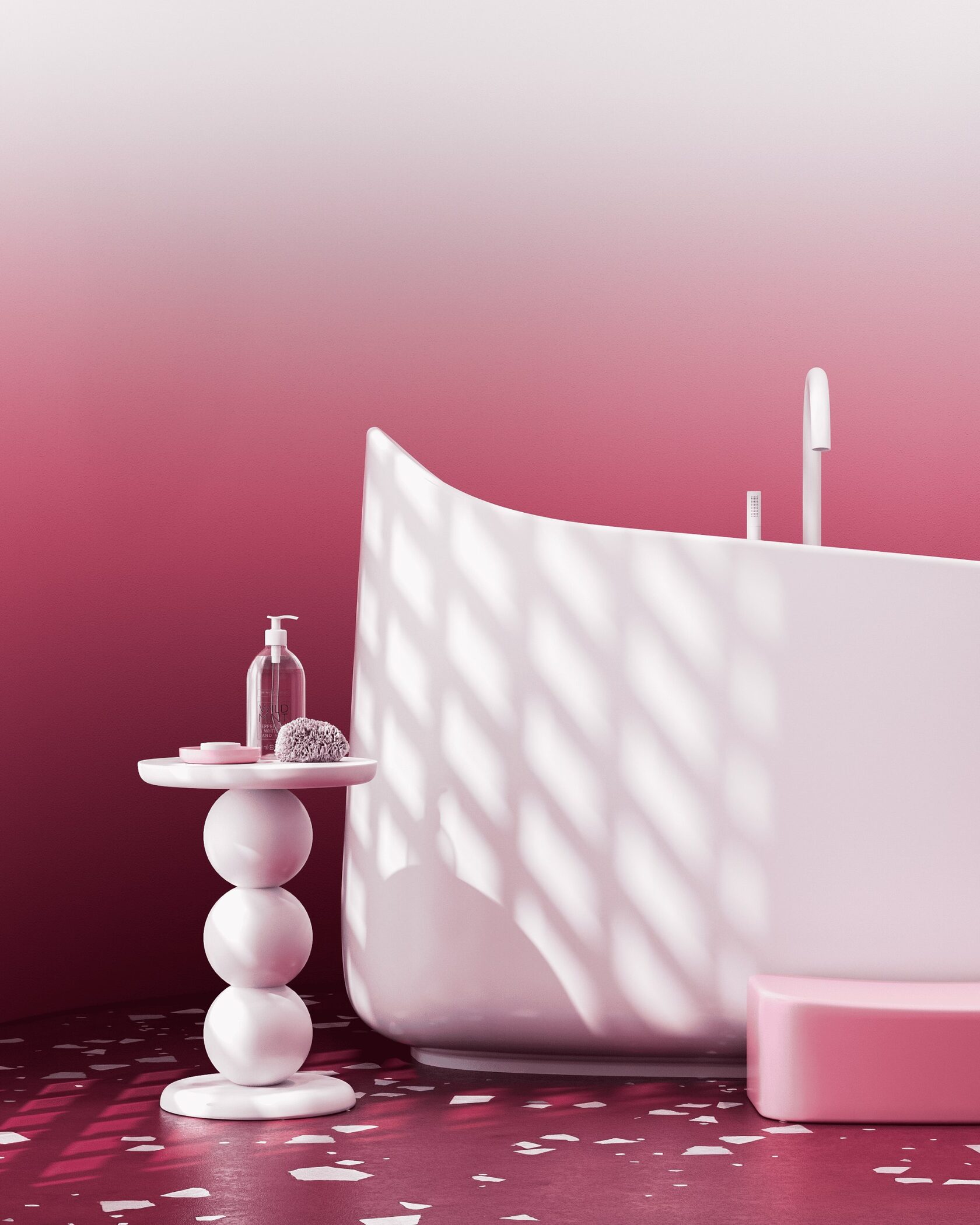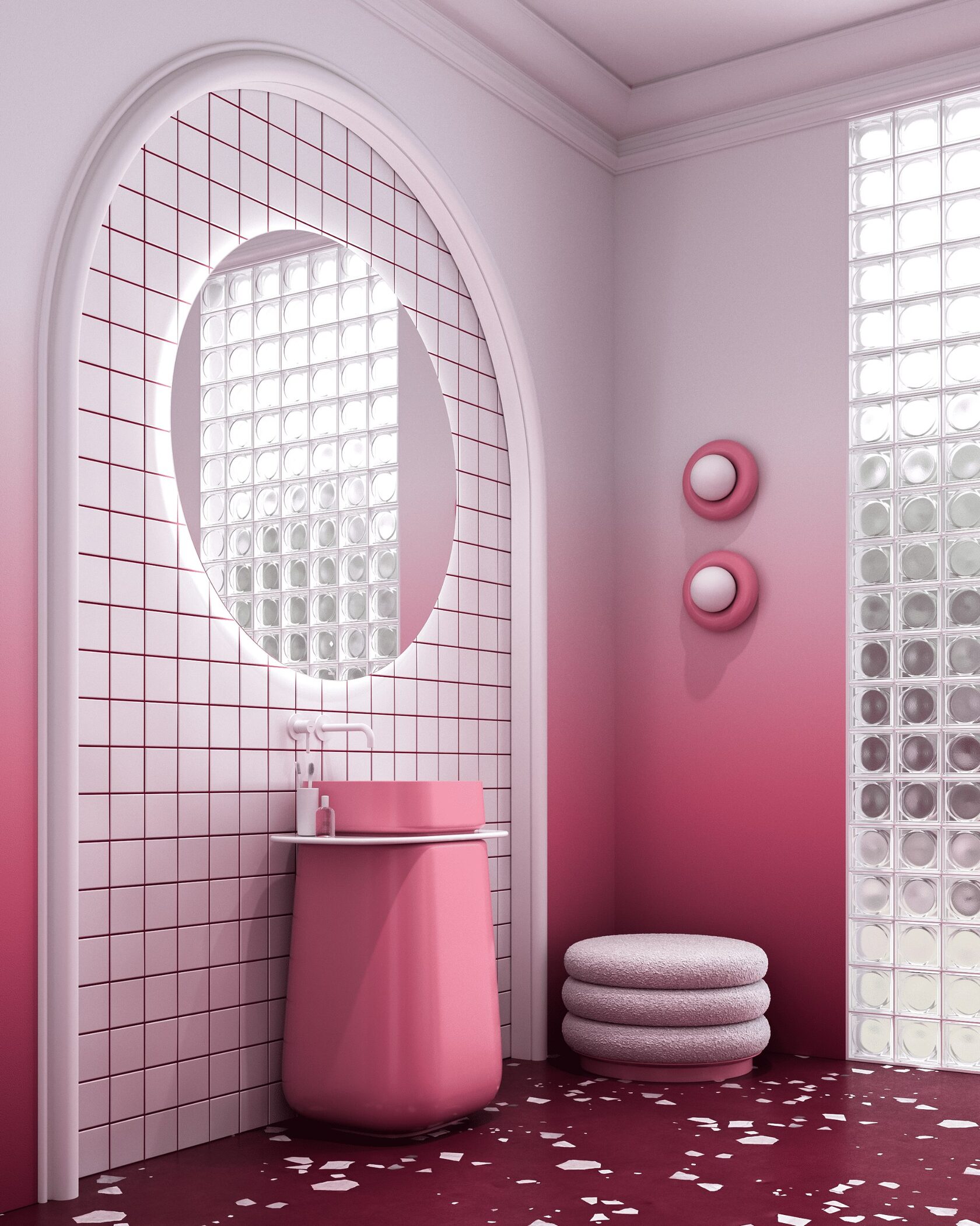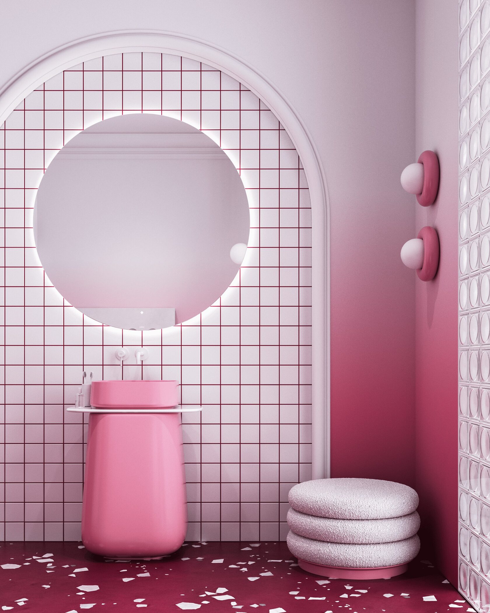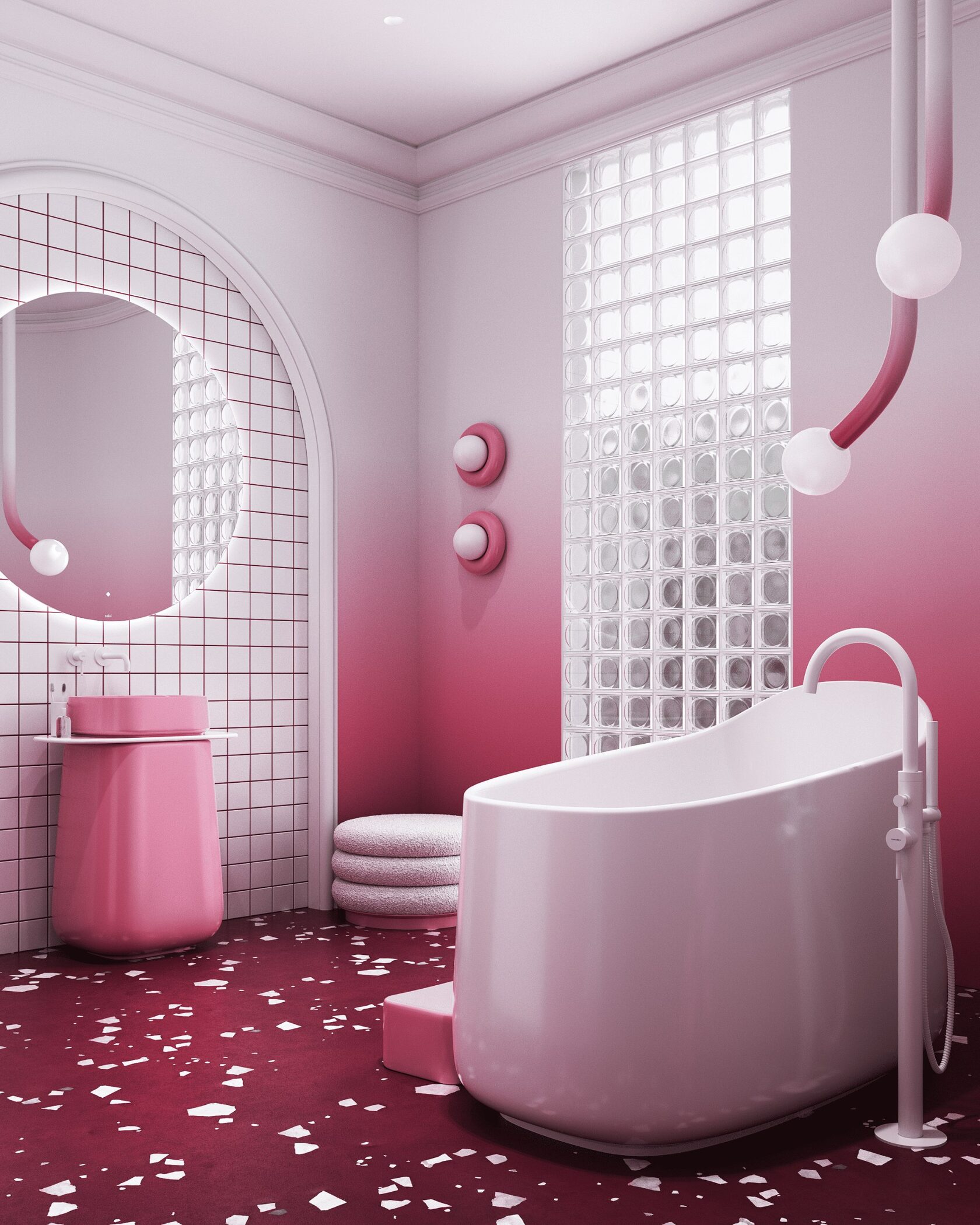 Концепция: Основная концепция проекта — создание интерьера, вдохновленного образом десерта. Пол из терраццо имитирует брусничную основу с сахарной посыпкой, плавно переходя в воздушные белые стены. Центральное место занимает скульптурная ванна, напоминающая взбитые сливки, дополненная нежно-розовой раковиной в форме ягоды. Лепная арка и круглое зеркало добавляют архитектурной лёгкости, а игривые детали, такие как бра-пончики и гипсовое панно, усиливают сладкую метафору, обеспечивая гармонию и оригинальность.