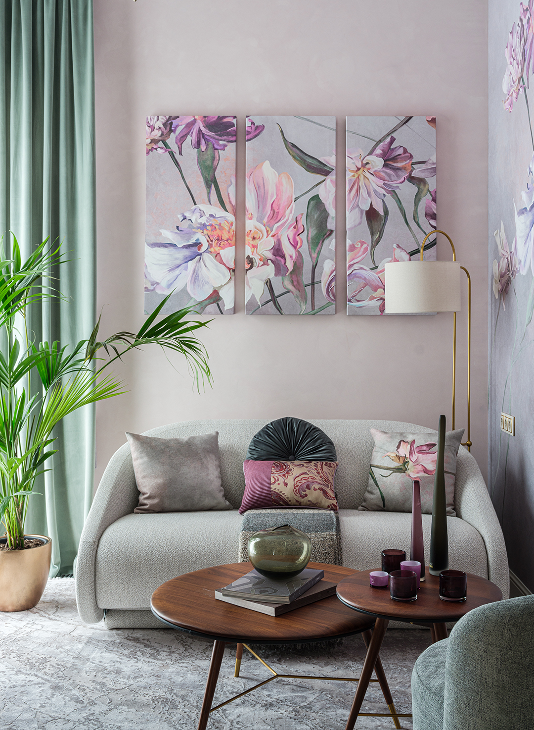 Концепция: Центральная идея проекта — создание вдохновляющей и функциональной среды, где искусство танца органично вписывается в повседневную жизнь. Гостиная трансформируется в профессиональную тренировочную зону благодаря интегрированному станку и панорамным зеркалам. Цветовая палитра основана на спокойных, нежных и глубоких оттенках, дополненных свежими зелеными акцентами, символизирующими молодость, весеннее обновление и женственность. Это создает атмосферу умиротворения и творческого подъема.