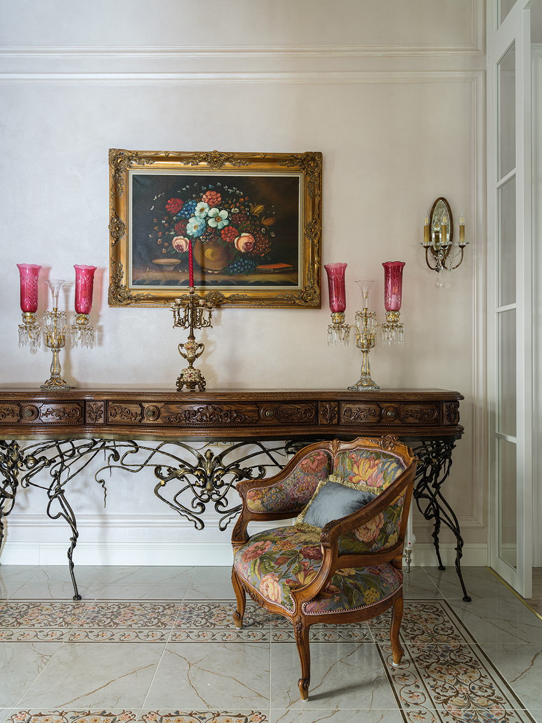 3. Иллюзия и целостность: Скрытая дверь как часть арта Одной из самых изящных деталей проекта стало решение с дверью в санузел. Мы не просто спрятали ее — мы полностью интегрировали в художественное пространство стены. Дверной проем был облицован плиткой, идентичной основной, а затем мастерами-декораторами вручную была нанесена декоративная штукатурка, которая точно повторяет рисунок и стыки плитки.