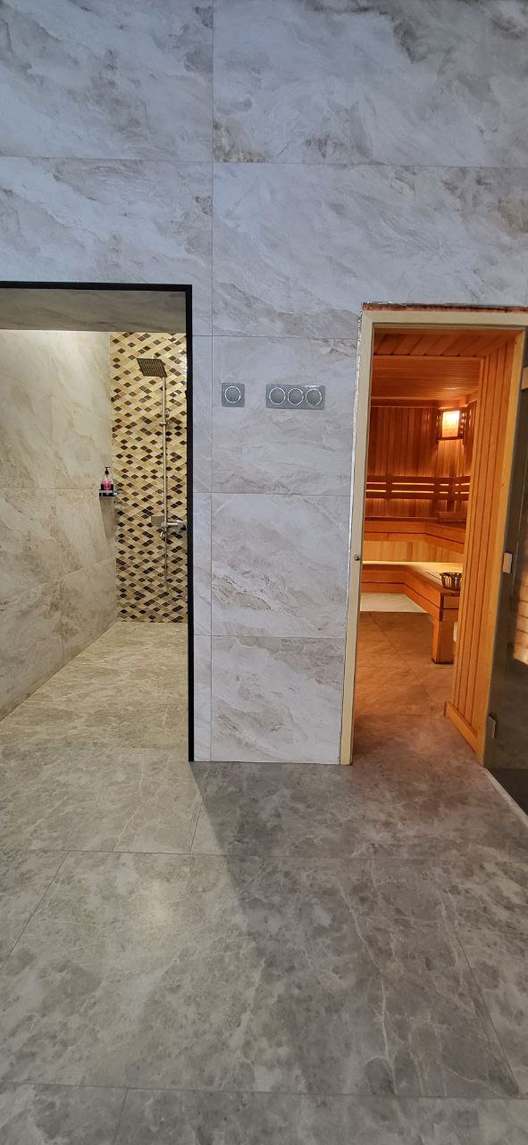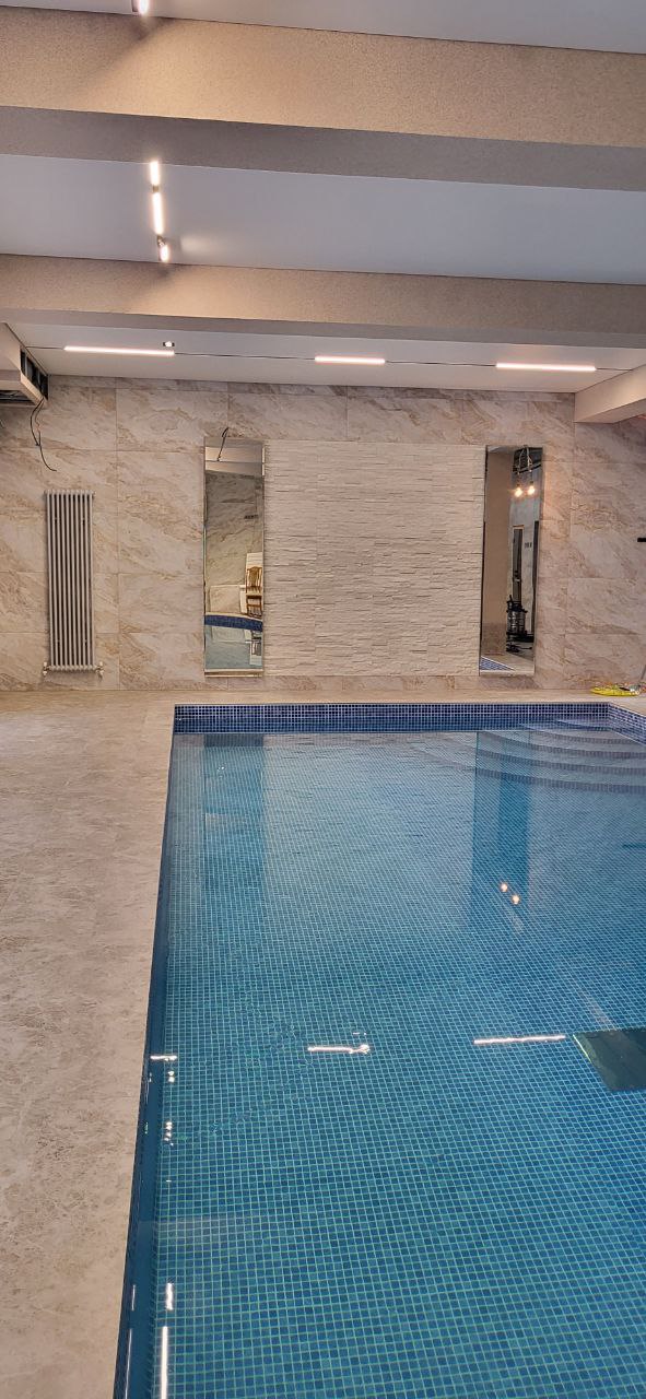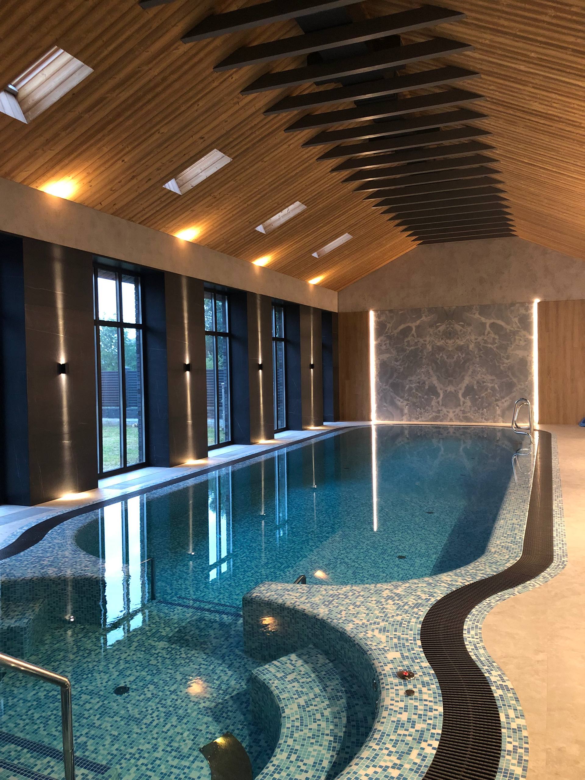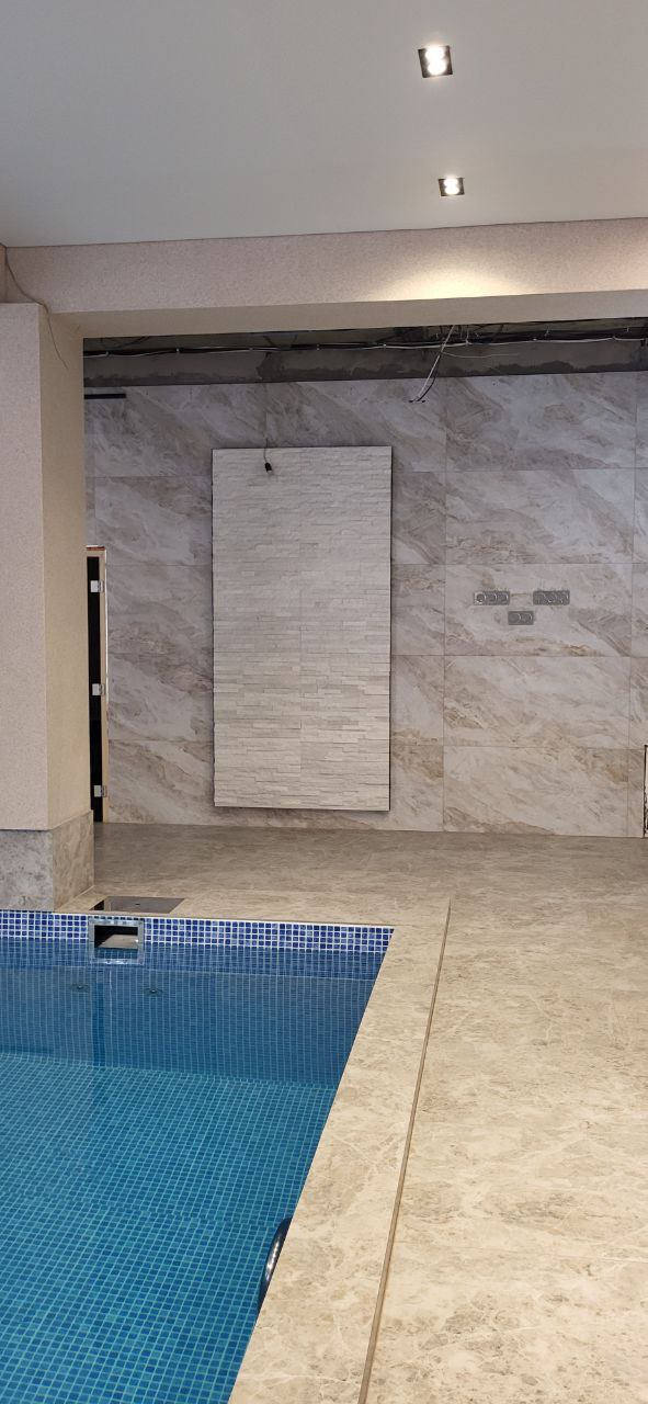 Отделка крупногабаритная плитка 1200х600 на стене и полу, на колоннах, балках используется мраморная крошка без блесток. потолок натяжной белый сатин. осветительные приборы: точечные парные Майтони и магнитный шинопровод. на стенах конструкция из гклв со стеновыми панелями из натурального камня с подсветкой и зеркалами. проект 136 кв м. бассейн 10 м. уровень влажности предельно высокий. также в этой зоне имеется финская парная с солью.Проект реализован самостоятельно заказчиком на 60%. Производители отделочных материалов мне, как дизайнеру интерьера, неизвестны, т.к. авторский надзор не велся