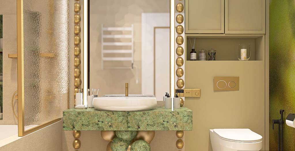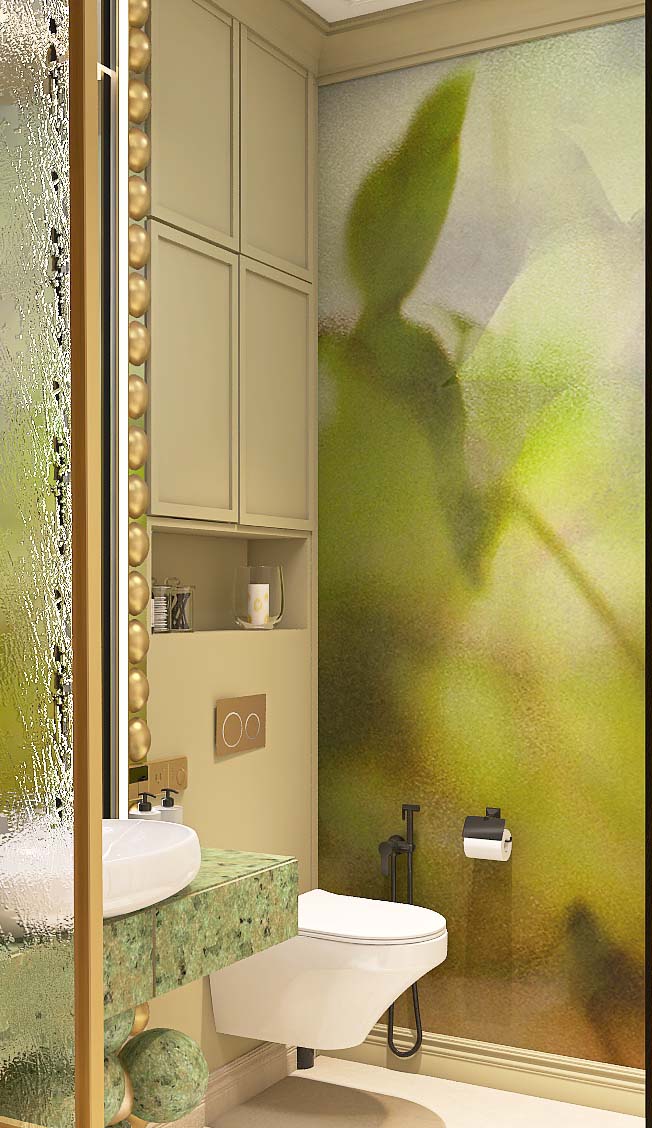 Концепция: Дизайн построен на идее создания индивидуального характера для каждого пространства при сохранении общей стилевой связи. Женственная и воздушная ванная комната воплощает изысканность через широкоформатный керамогранит Italon и утонченную мебель. Санузел с прачечной, решенный более функционально, обогащен декоративной штукатуркой оттенка 'бежевого песка' и зелёными акцентами, отсылающими к марокканским традициям. Зеркала и подсветка добавляют глубины, подчеркивая слияние французской утонченности и современного комфорта.