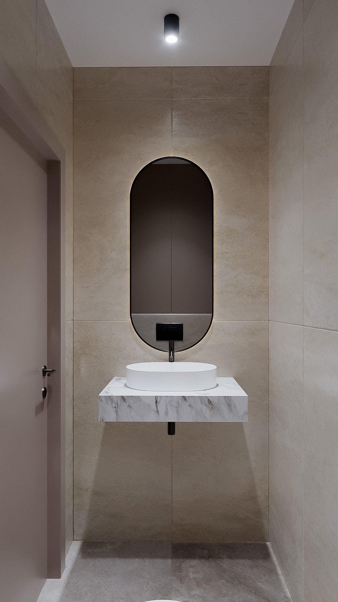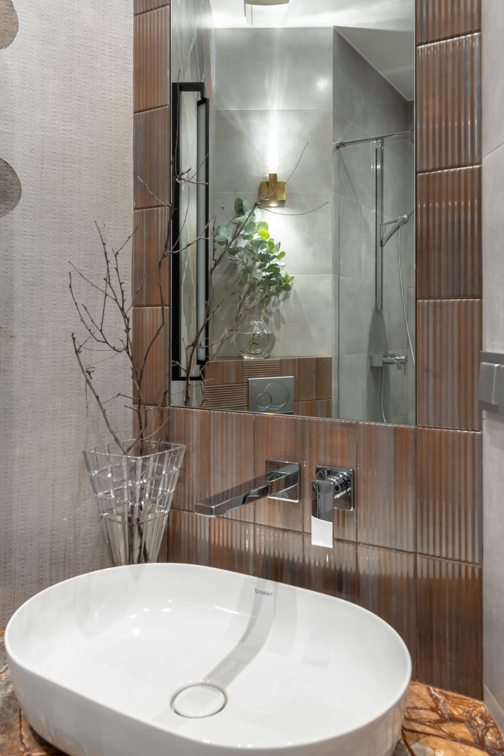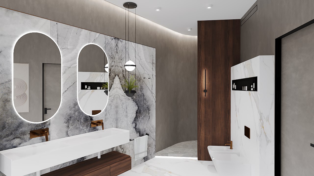 Концепция: Основная концепция проекта — гармоничное сочетание разнообразия настроений в едином доме. Санузел первого этажа черпает вдохновение в балийской эстетике, используя декоративную штукатурку с природной фактурой, керамогранит Italon, мебель Egger и массивное деревянное зеркало. Центральным элементом стал эксклюзивный керамогранитный умывальник, создающий баланс между современностью и этническими мотивами. Ванная комната второго этажа — это композиционный центр с доминирующей колонной из крупноформатного итальянского керамогранита REX, создающей эффект монолитной скульптуры. Зеркала с бронзовым затемнением и встроенная подсветка подчеркивают архитектурность и глубину пространства, формируя целостный, благородный образ.