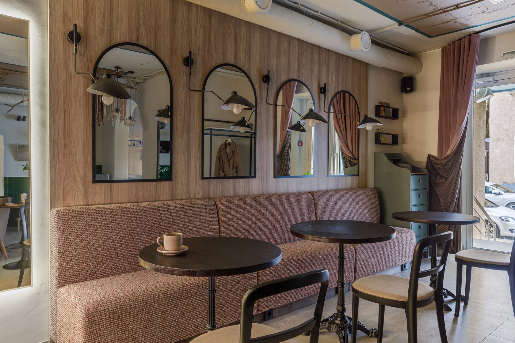 Концепция: Основная идея – создание пространства, где гастрономические референсы органично переплетаются с изысканным дизайном. Палитра, вдохновленная ягодными десертами, природой за окном и фасадом здания, создает согревающую и аппетитную атмосферу. Дизайнер искусно интегрировал элементы прошлой жизни, такие как объемная бархатная штора-плиссе, напоминающая подол платья, и зеркало из бывшей примерочной. Функциональность и эстетика объединены в выборе материалов, включая декоративное покрытие под замшу для санузла и раковину, отлитую из бетона.