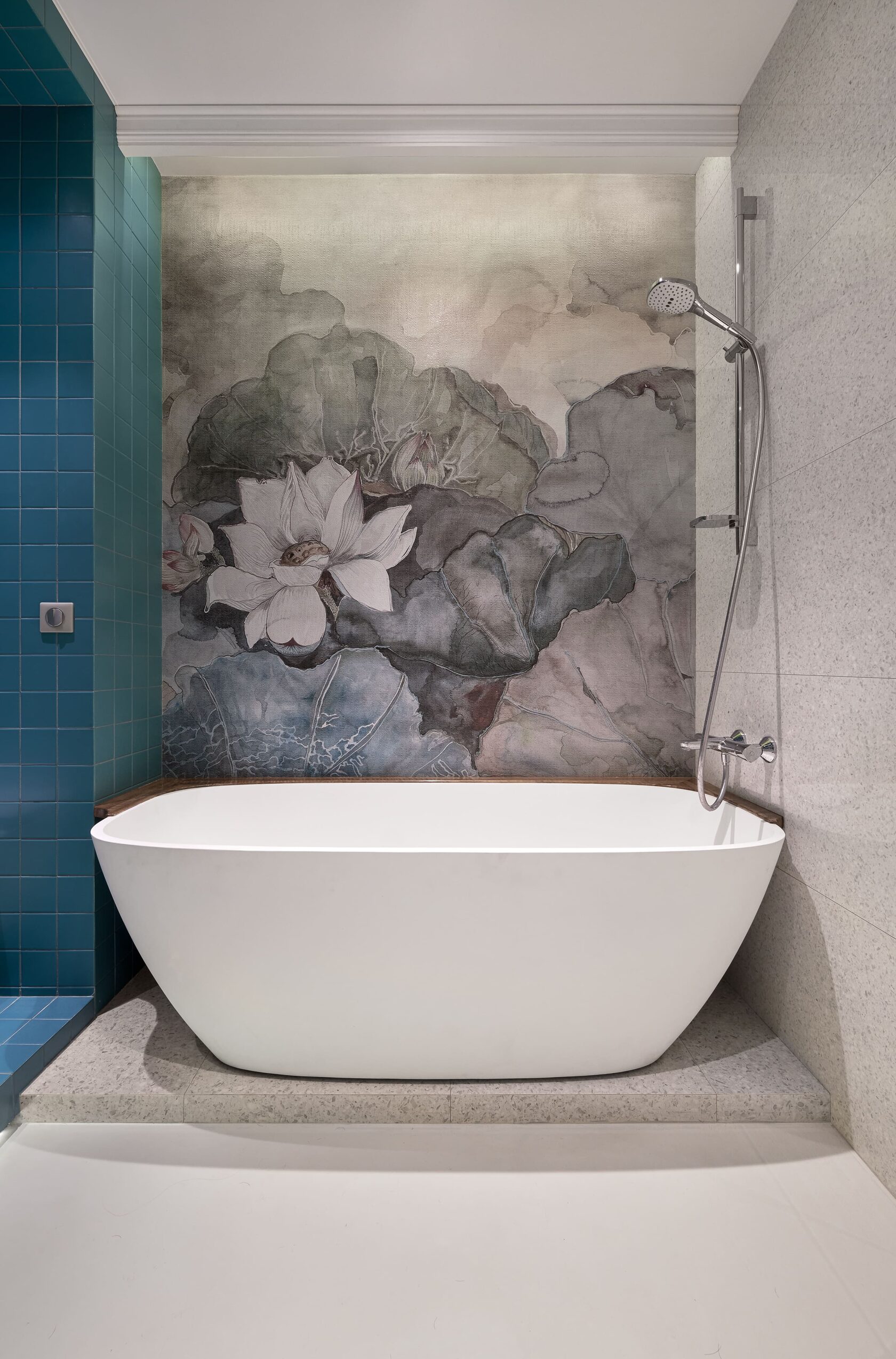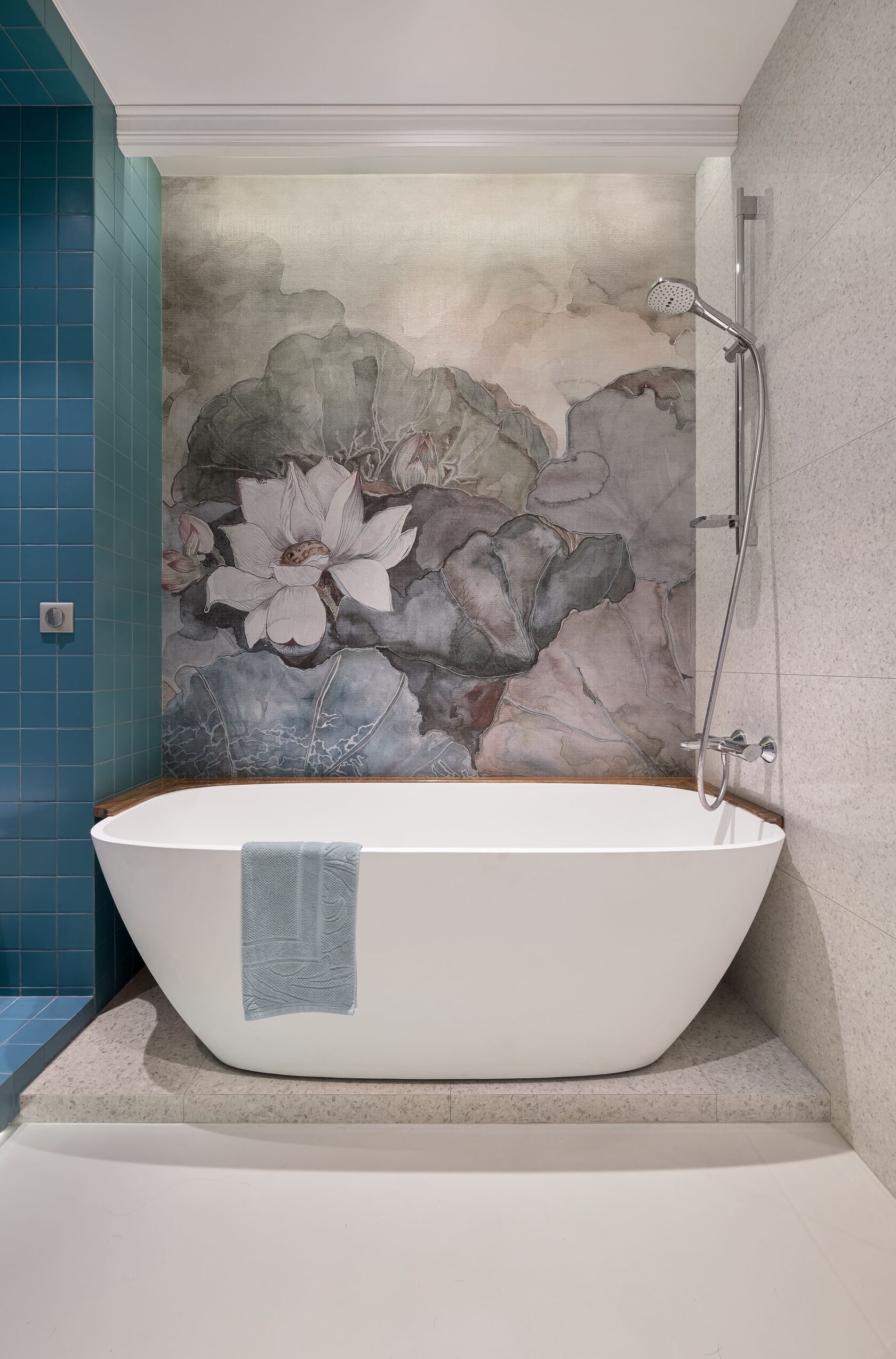 Концепция: Проект на Мичуринском проспекте: обои Wall&Deco + плитка Diesel Living with Iris — сдержанный, но выразительный дуэт. Проект в г. Александров: душ целиком облицован VOGUE IN Turchese — бирюзовой плиткой «в клеточку» (пол, стены, потолок). Фон — Atlas Concorde Marvel Gems Terrazzo White, добавляющий текстурную глубину. Итог: Влагостойкие обои — не только про функциональность, но и про эстетику. Когда рисунок и плитка работают в тандеме, даже душевая становится арт-объектом.