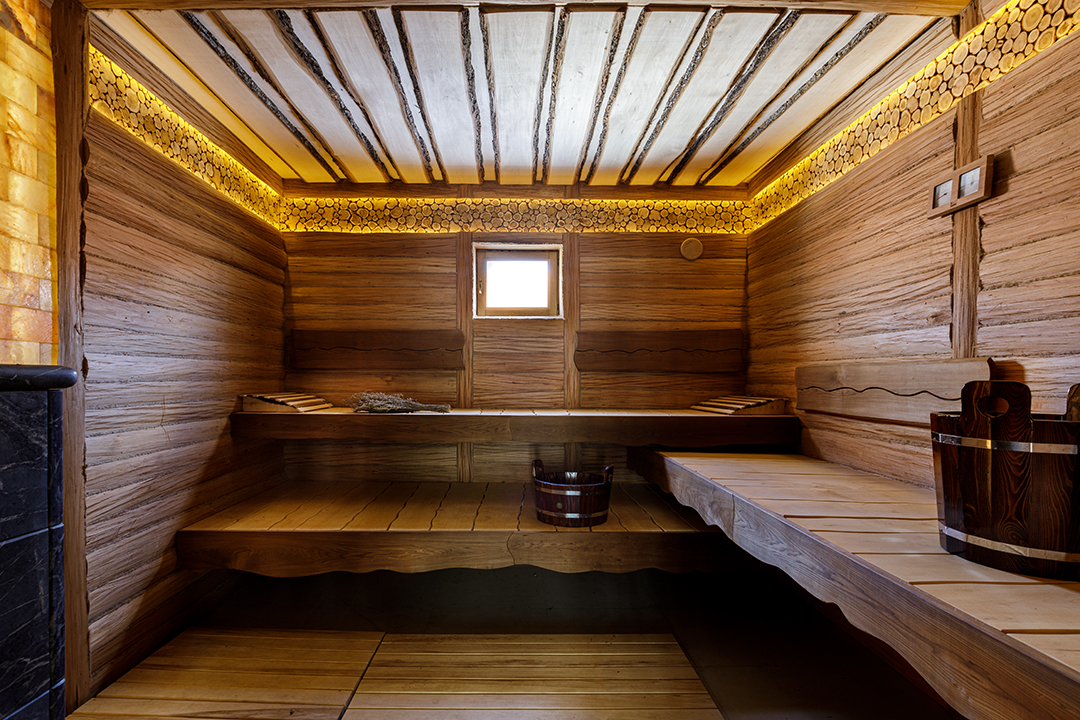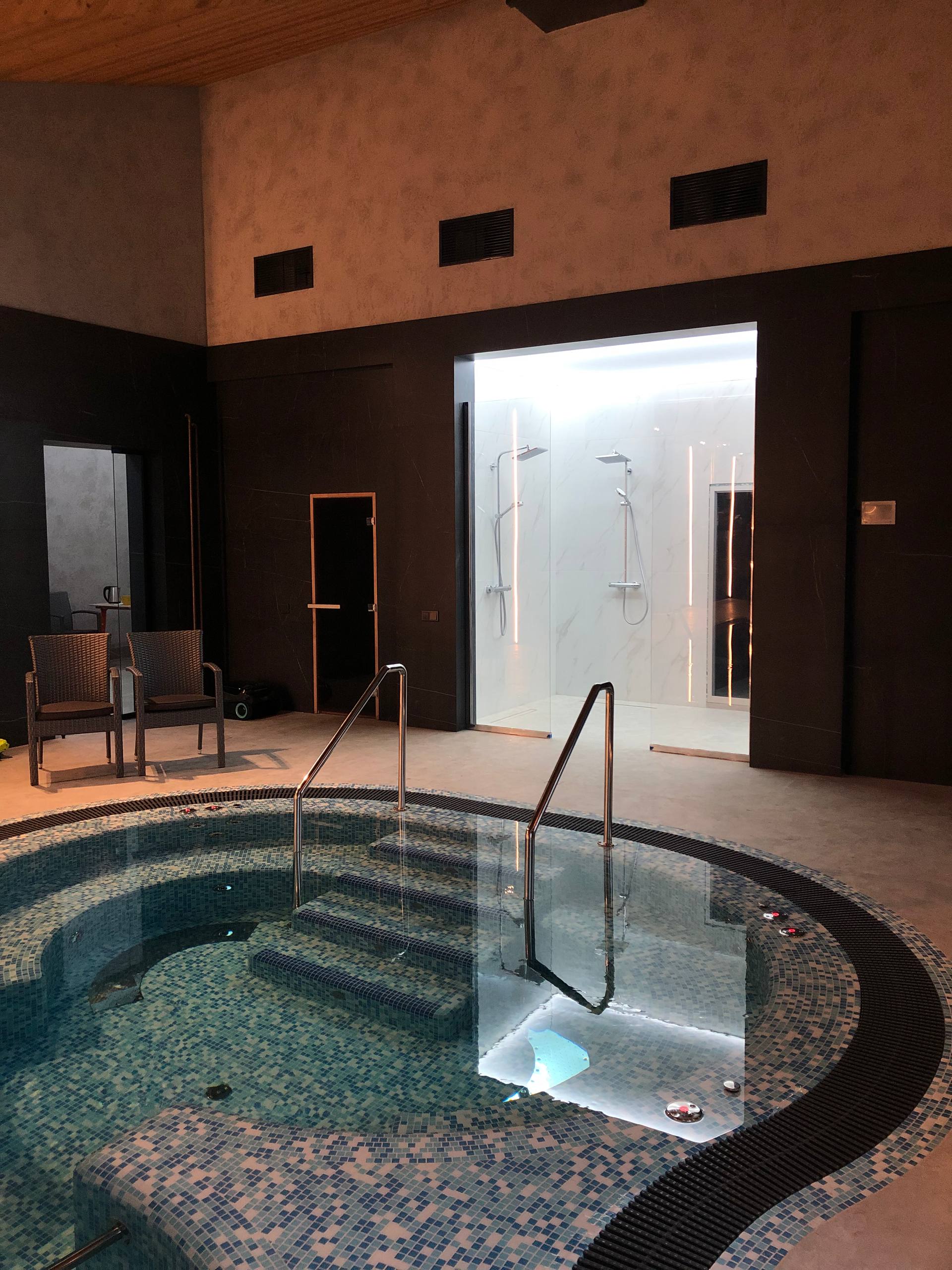 Сауна для частного использования. Джакузи после сауны. Лежишь и смотришь на лес в огромные панорамные окна. Окна с двух сторон помещения до потолка до 5 м. Помещение залито дневным светом, что благоприятно влияет на оздоровление организма и самочувствия.