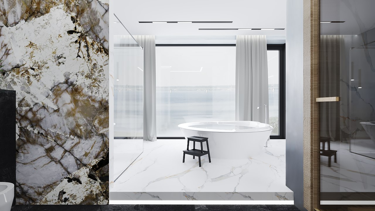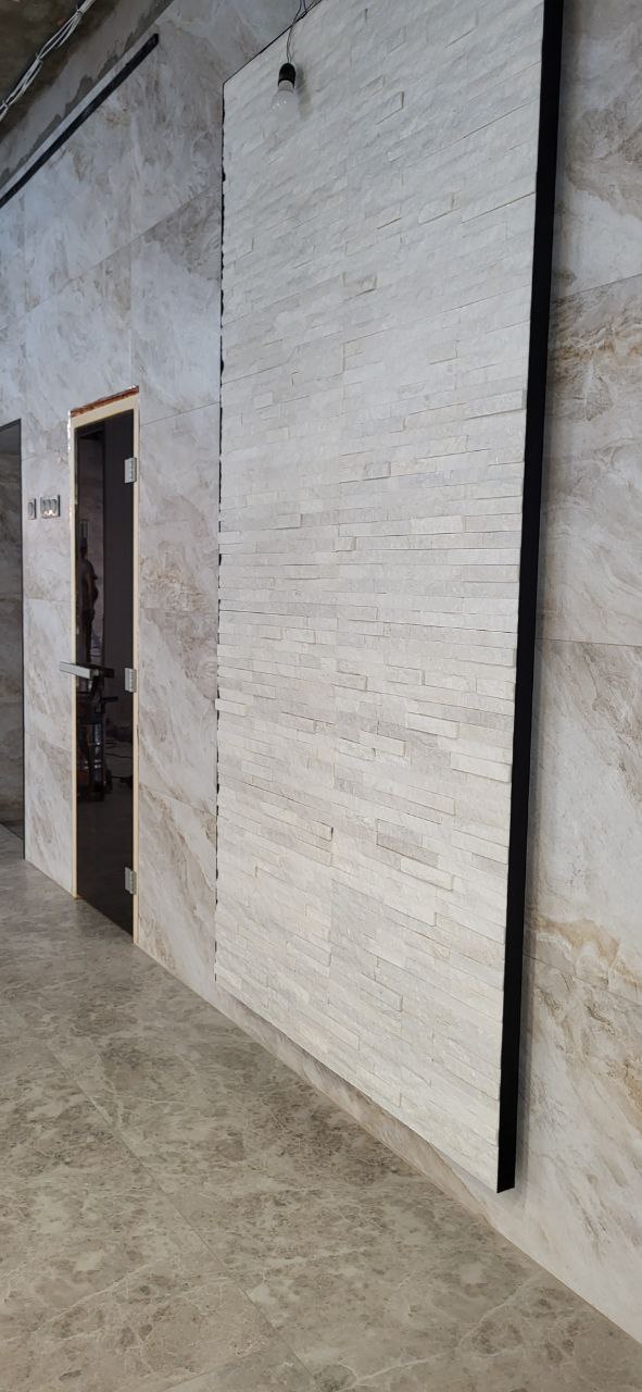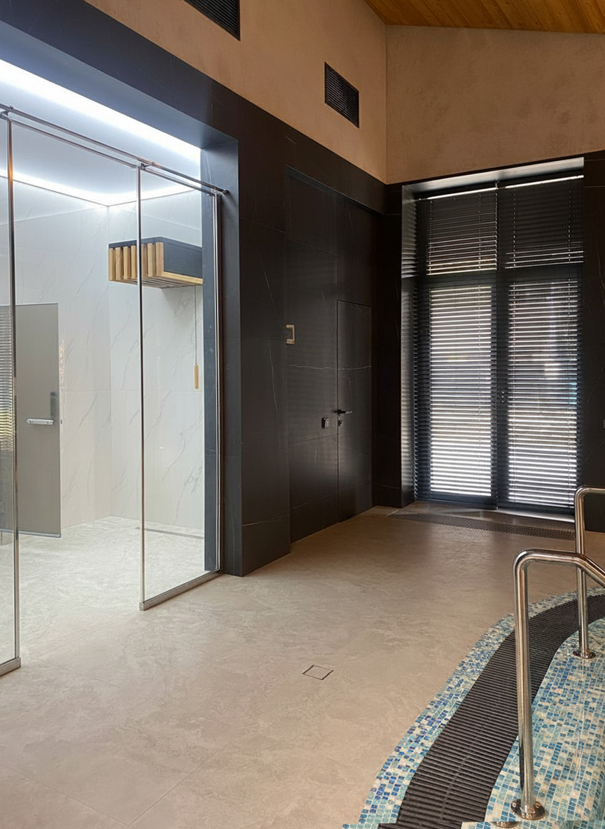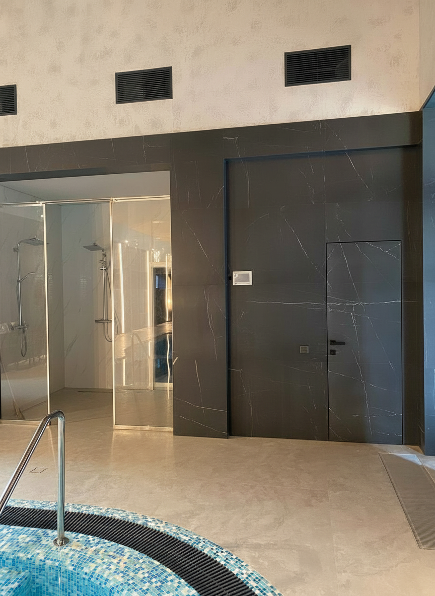 Заключение Наш проект — это синтез современных технологий и художественного мастерства. Используя керамогранит как надежную основу, мы привнесли в пространство душу с помощью крупноформатного оникса, подарили ему характер и масштаб с помощью штукатурки «под бетон» и достигли совершенства в деталях с помощью уникальной скрытой двери. Это пространство, где каждый материал говорит на своем языке, но вместе они создают единую, проникновенную поэму о воде, свете и камне.