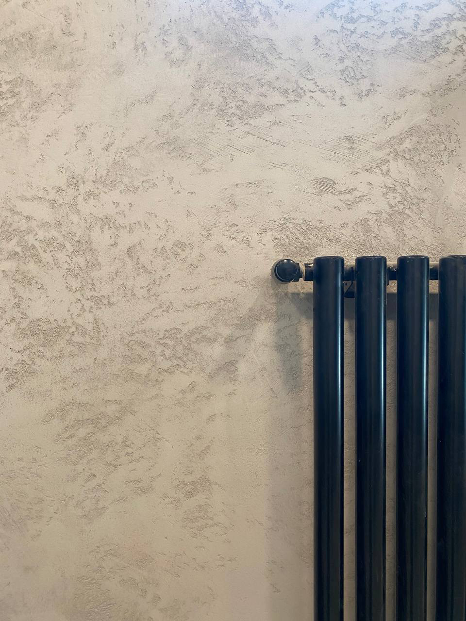 2. Воздушность и глобальный масштаб: Декоративная штукатурка Чтобы уравновесить яркую доминанту оникса и придать интерьеру целостность, мы использовали декоративную штукатурку под бетон с узором «Карта мира».