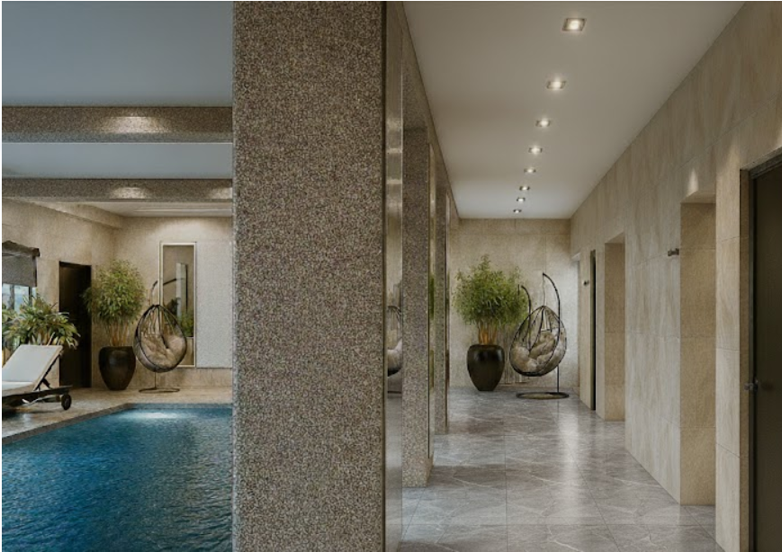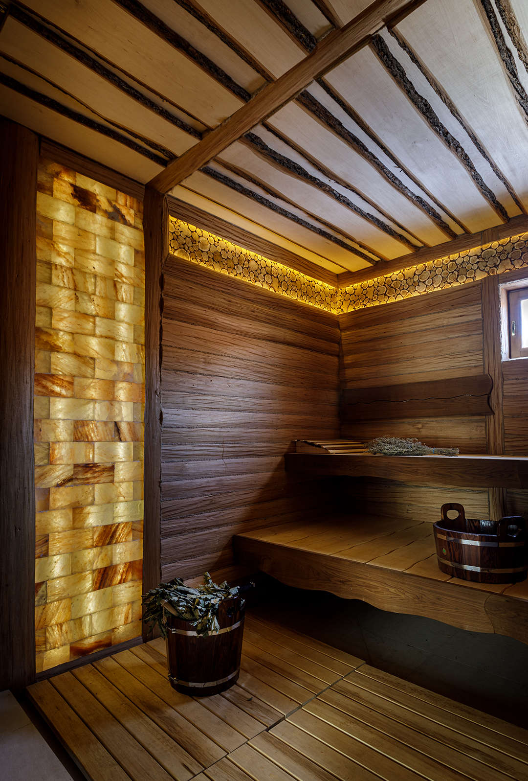 · На стенах под потолком эта штукатурка создает эффект «парящего» верха, визуально увеличивая высоту помещения. Глубокий, тактильно ощутимый рельеф «карты мира» отсылает к идеям путешествий и открытий, добавляя интеллектуальной глубины и индивидуальности. · В комнате отдыха та же штукатурка формирует лаконичный и элегантный фон. Она служит идеальным контрастом для мягкой мебели и деревянных элементов, создавая спокойную, почти медитативную обстановку для релаксации после водных процедур.