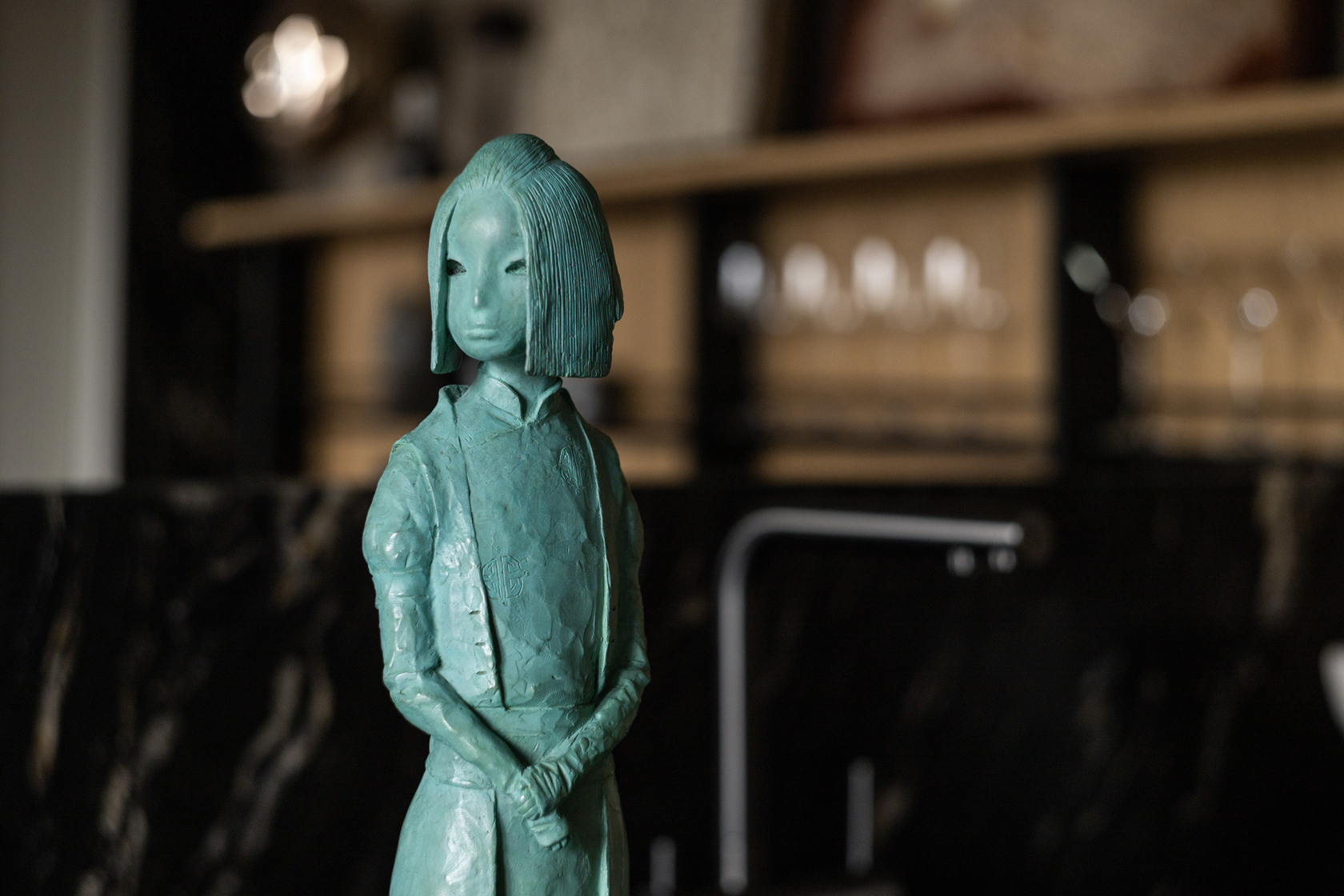 Женский бюст — главная фишка, делающая проект по-настоящему уникальным, — гипсовый бюст нашей заказчицы, созданный специально для этой квартиры. Мы назвали его «Нежность» — ведь в его плавных линиях отразилась и женственность, и глубокая личная история.