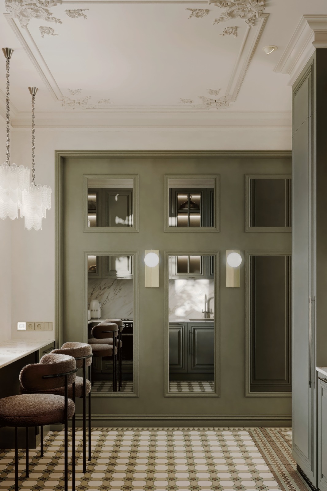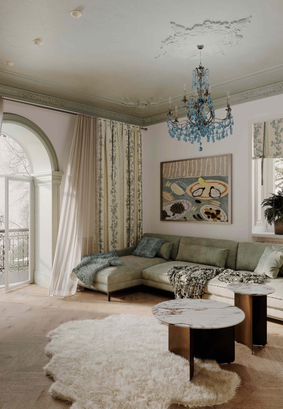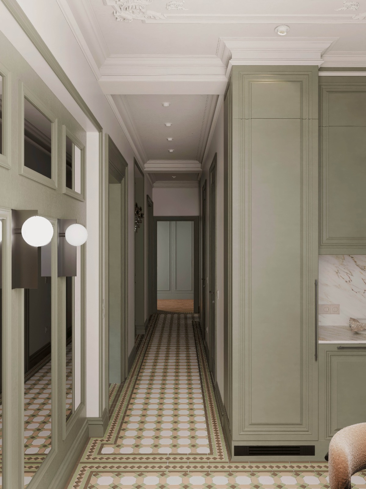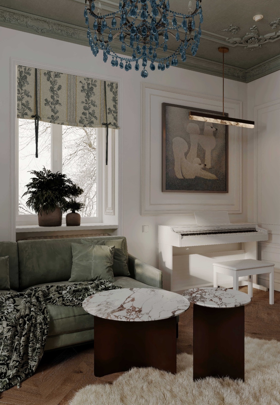 Концепция: Центральным стержнем интерьера является тщательно подобранная коллекция произведений искусства. Главная картина над диваном задает основной колорит гостиной — палитру мягких зеленых и бежевых тонов, которая филигранно поддерживается в отделке, текстиле и мебели. Вторая работа у пианино служит камерным акцентом, а люстра цвета морской стали с бирюзовыми подвесами добавляет вертикальный акцент и французскую легкость. Мозаичная плитка пола на кухне объединяет функциональные зоны, а фактурный текстиль в спальне выступает как финальный штрих, курирующий свет и цвет. Даже в гардеробной тщательно подобранное трио из цвета, шторы и светильника формирует единую эстетику.