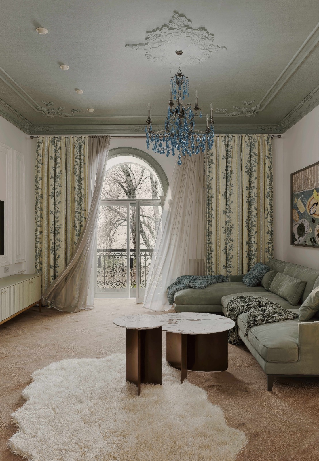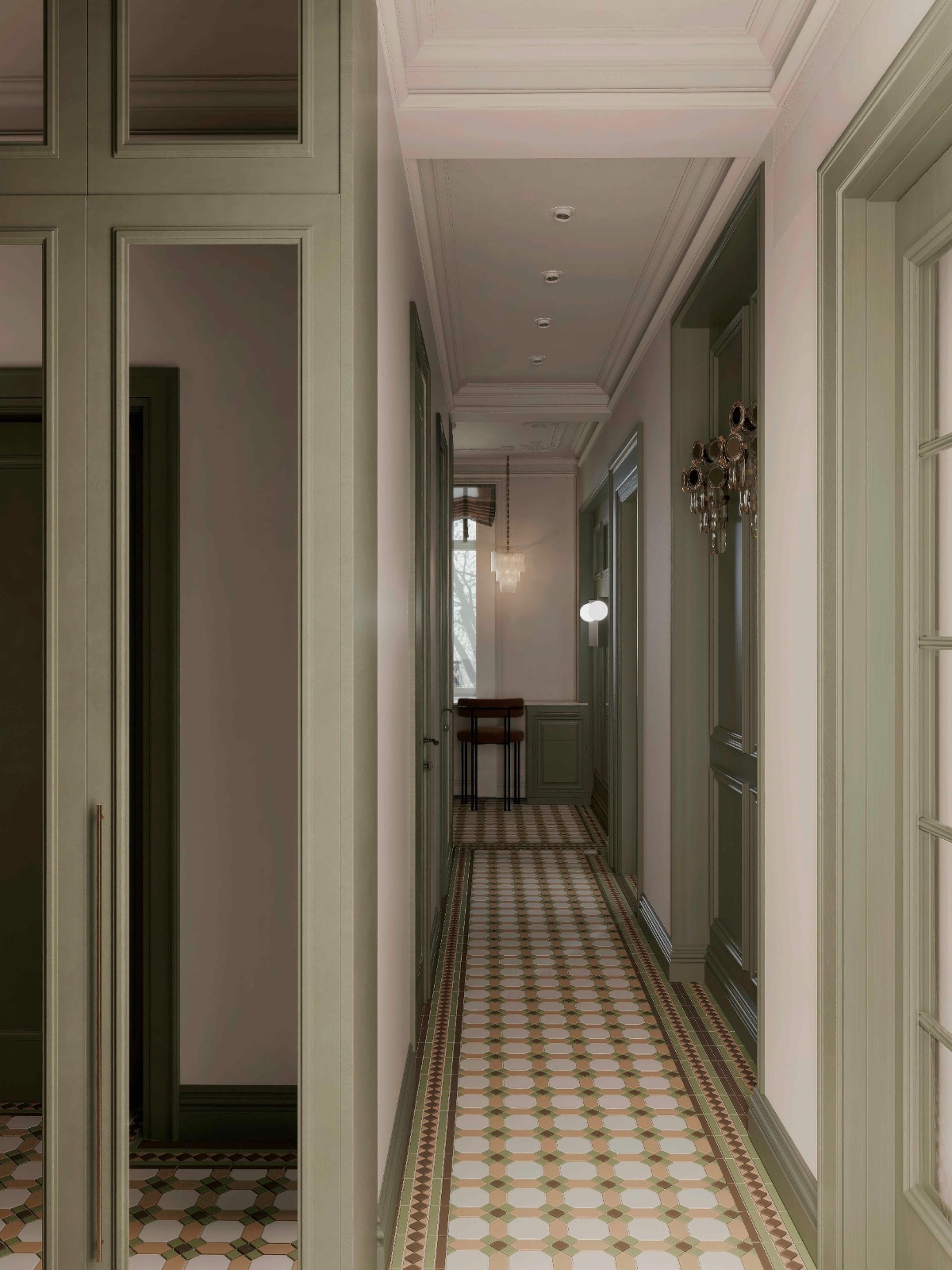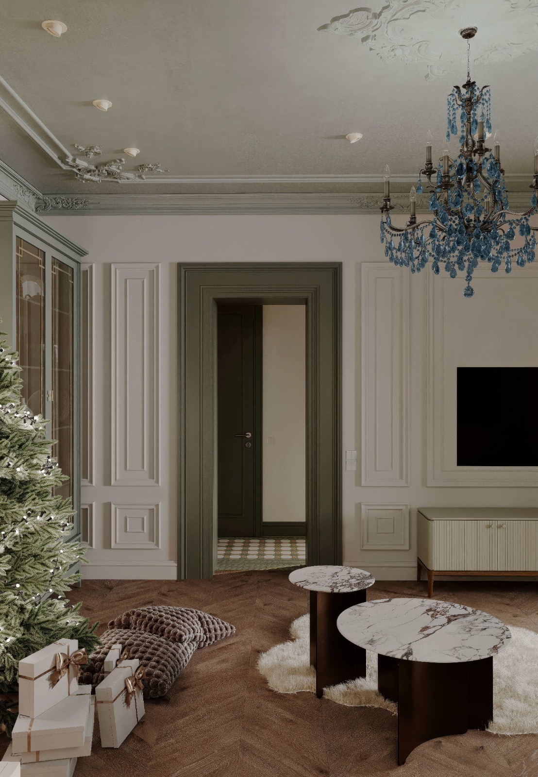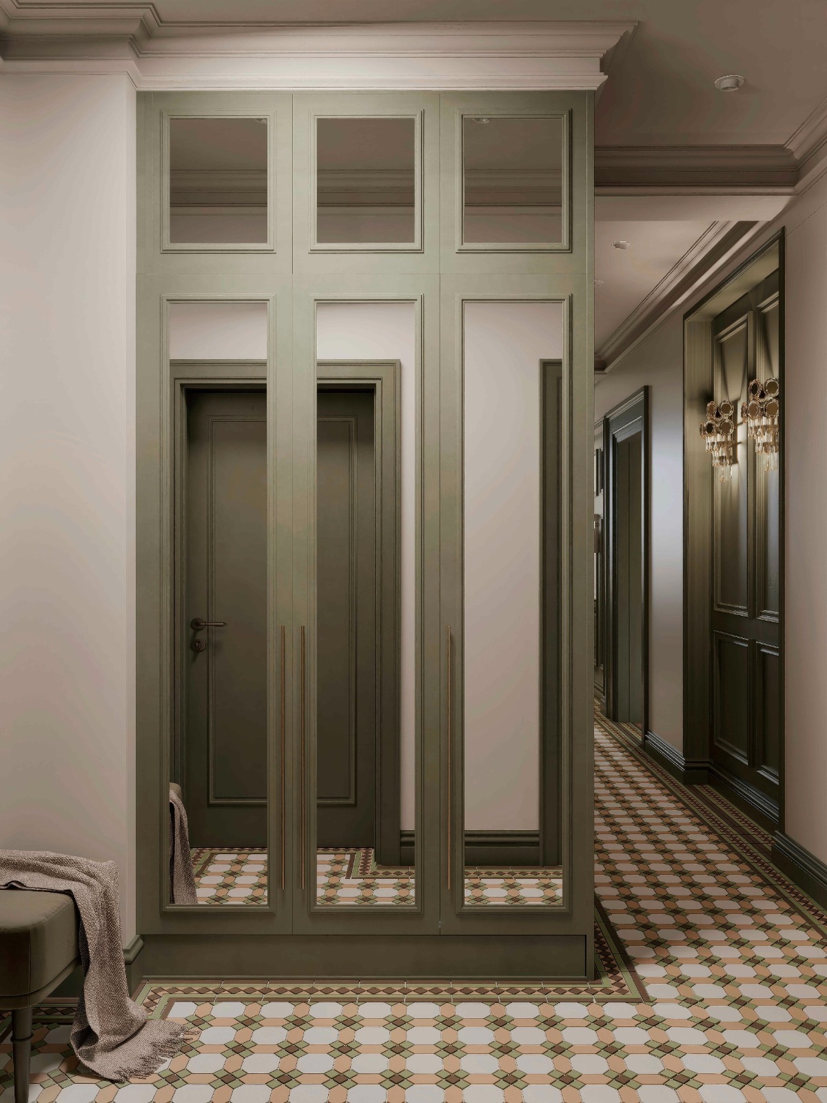 Концепция: Центральным стержнем интерьера является тщательно подобранная коллекция произведений искусства. Главная картина над диваном задает основной колорит гостиной — палитру мягких зеленых и бежевых тонов, которая филигранно поддерживается в отделке, текстиле и мебели. Вторая работа у пианино служит камерным акцентом, а люстра цвета морской стали с бирюзовыми подвесами добавляет вертикальный акцент и французскую легкость. Мозаичная плитка пола на кухне объединяет функциональные зоны, а фактурный текстиль в спальне выступает как финальный штрих, курирующий свет и цвет. Даже в гардеробной тщательно подобранное трио из цвета, шторы и светильника формирует единую эстетику.