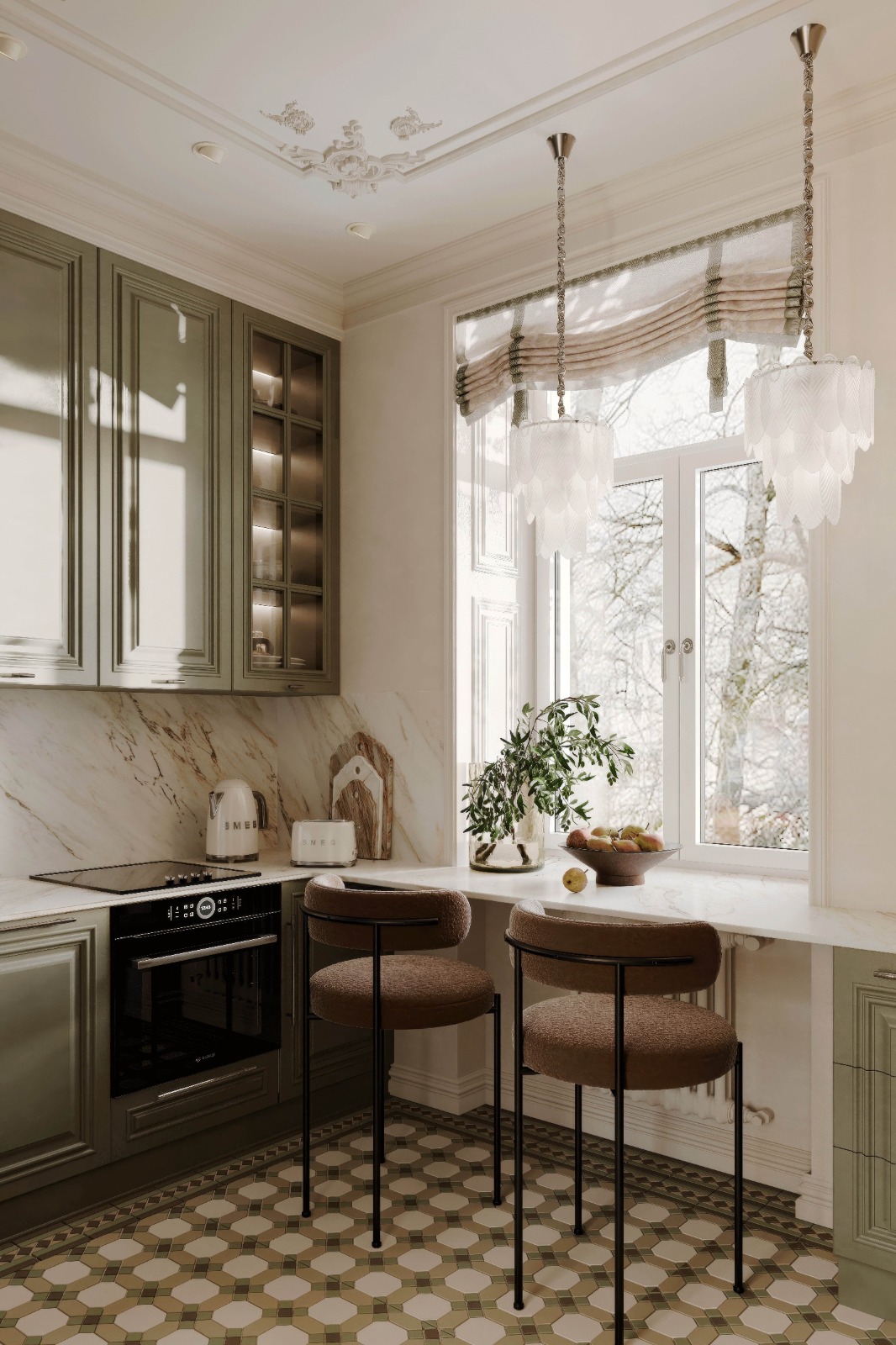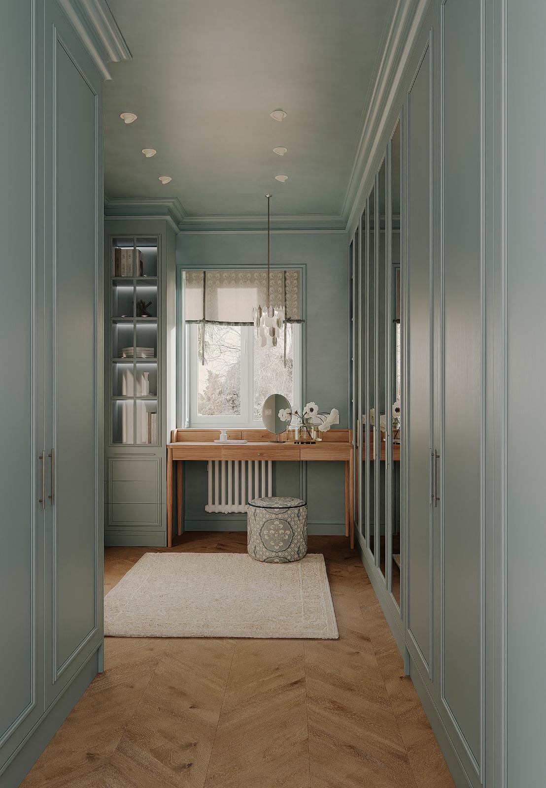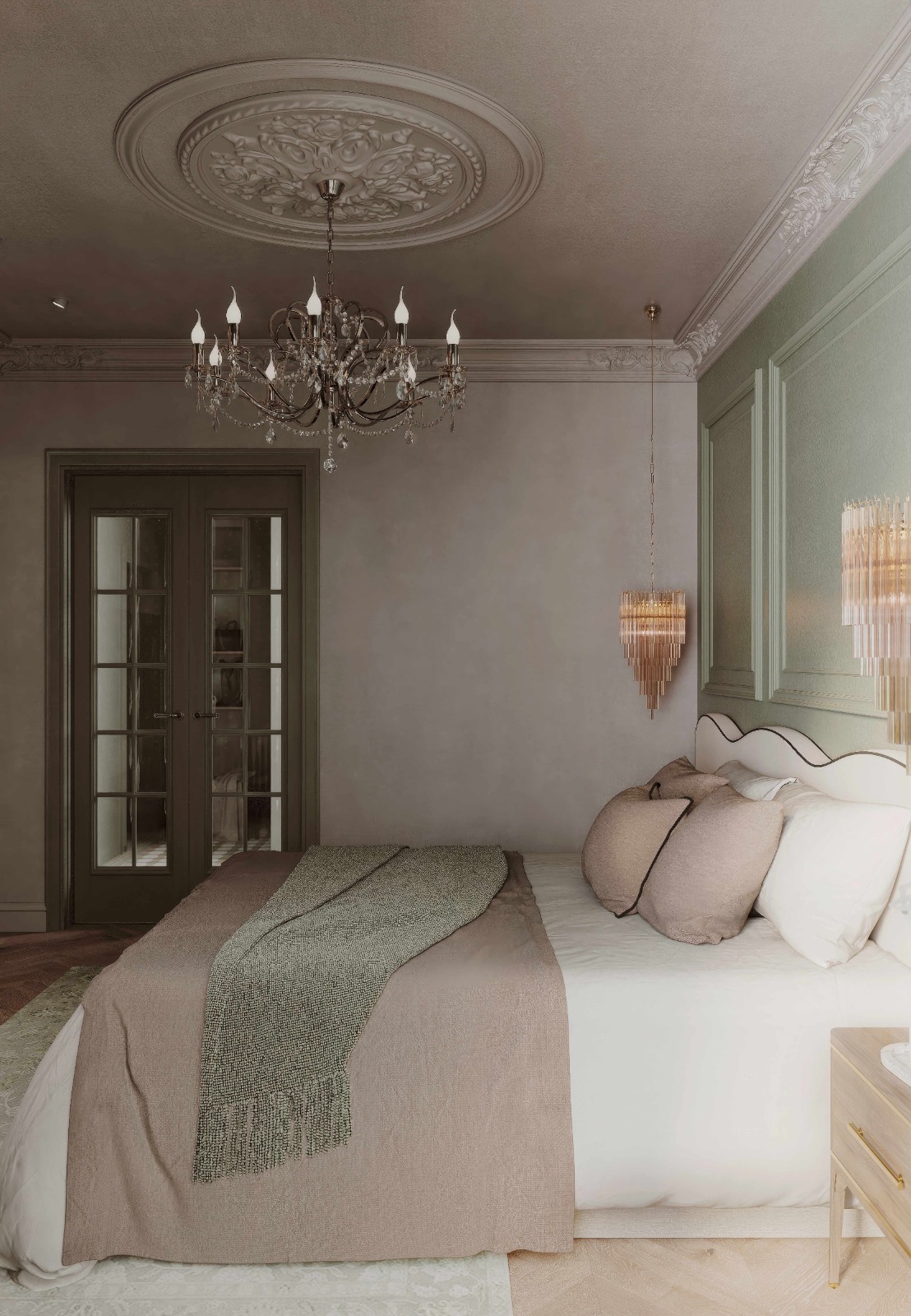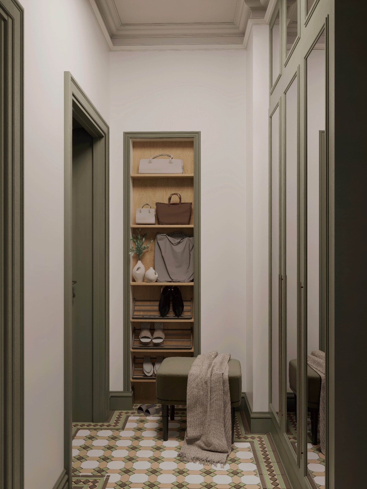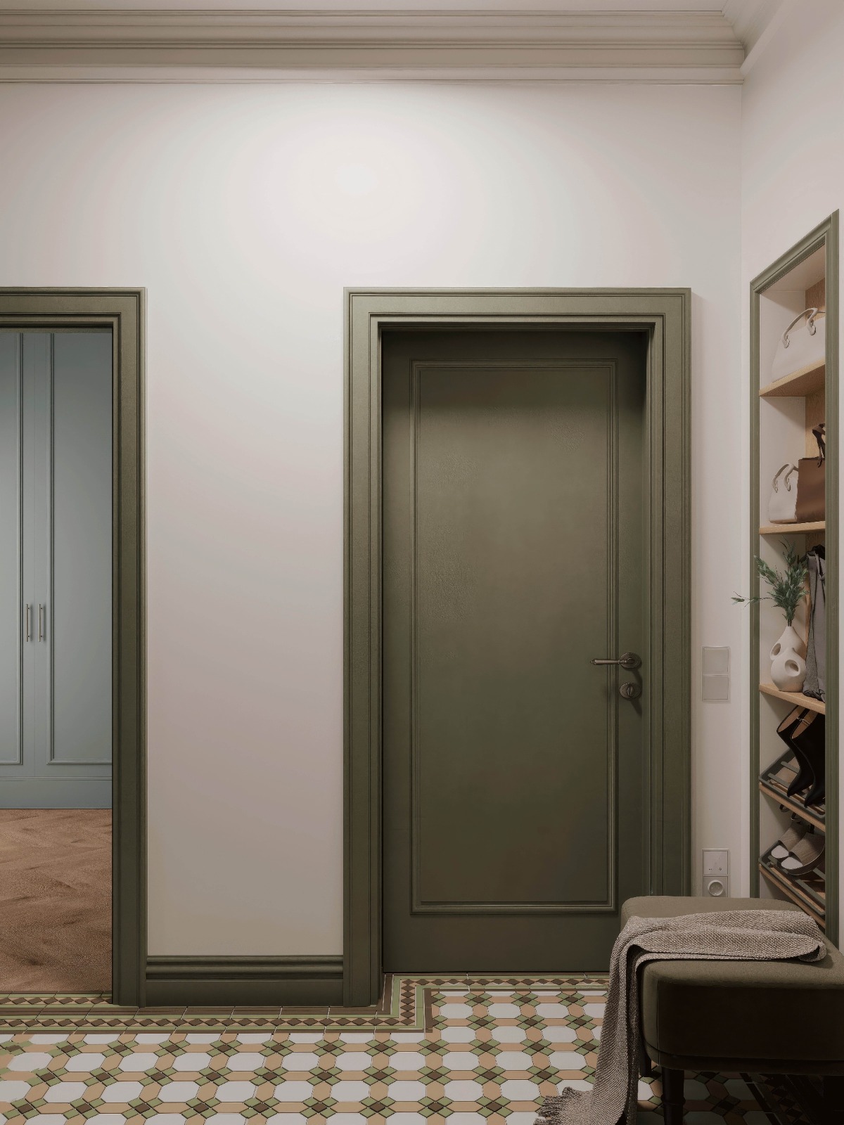 Концепция: Центральным стержнем интерьера является тщательно подобранная коллекция произведений искусства. Главная картина над диваном задает основной колорит гостиной — палитру мягких зеленых и бежевых тонов, которая филигранно поддерживается в отделке, текстиле и мебели. Вторая работа у пианино служит камерным акцентом, а люстра цвета морской стали с бирюзовыми подвесами добавляет вертикальный акцент и французскую легкость. Мозаичная плитка пола на кухне объединяет функциональные зоны, а фактурный текстиль в спальне выступает как финальный штрих, курирующий свет и цвет. Даже в гардеробной тщательно подобранное трио из цвета, шторы и светильника формирует единую эстетику.