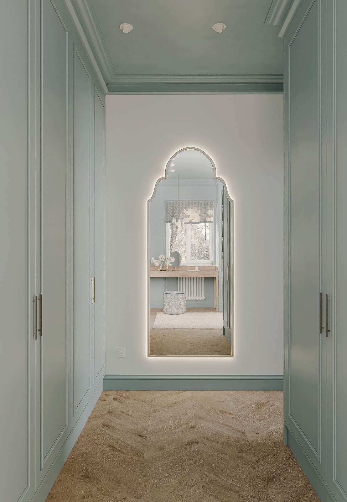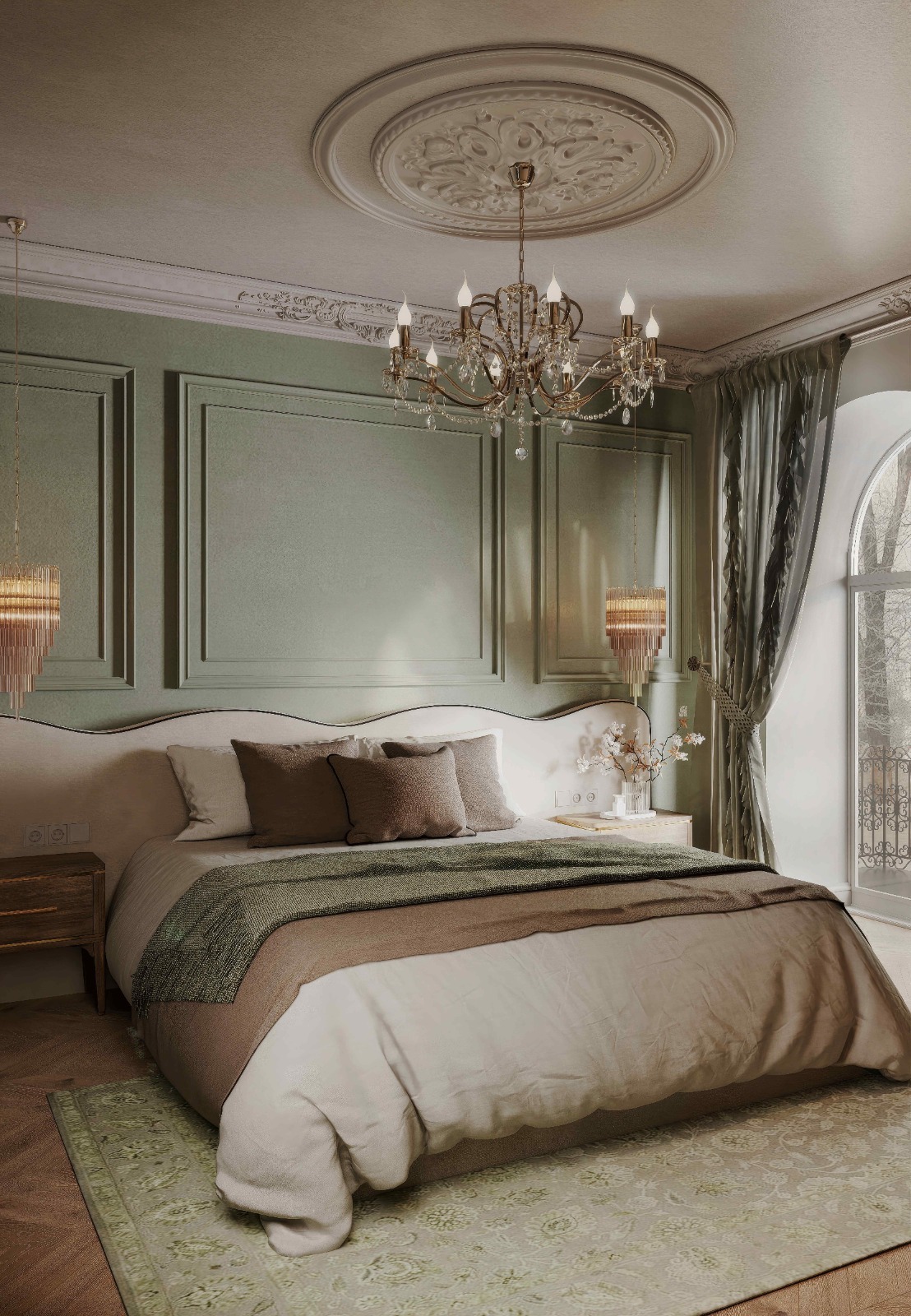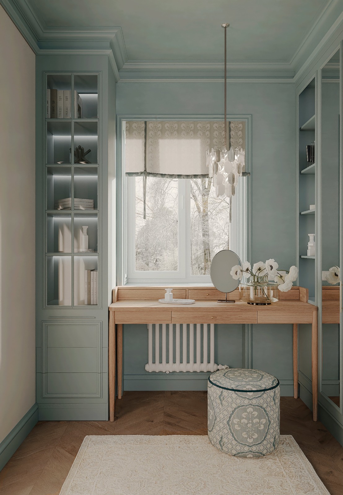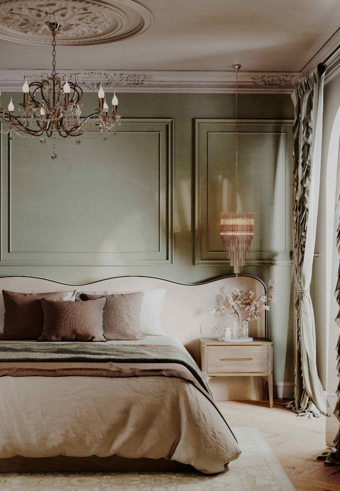 Концепция: Центральным стержнем интерьера является тщательно подобранная коллекция произведений искусства. Главная картина над диваном задает основной колорит гостиной — палитру мягких зеленых и бежевых тонов, которая филигранно поддерживается в отделке, текстиле и мебели. Вторая работа у пианино служит камерным акцентом, а люстра цвета морской стали с бирюзовыми подвесами добавляет вертикальный акцент и французскую легкость. Мозаичная плитка пола на кухне объединяет функциональные зоны, а фактурный текстиль в спальне выступает как финальный штрих, курирующий свет и цвет. Даже в гардеробной тщательно подобранное трио из цвета, шторы и светильника формирует единую эстетику.
