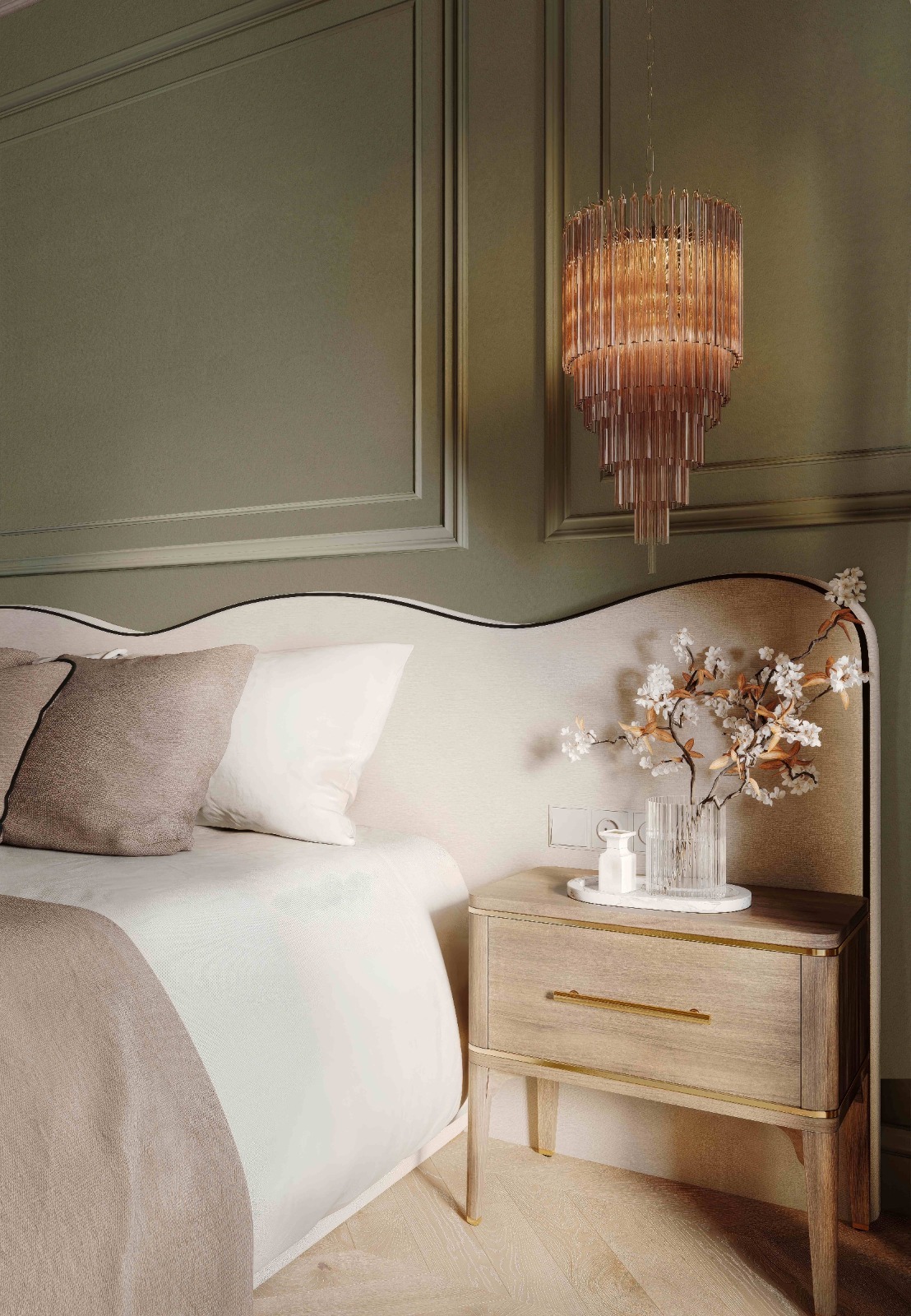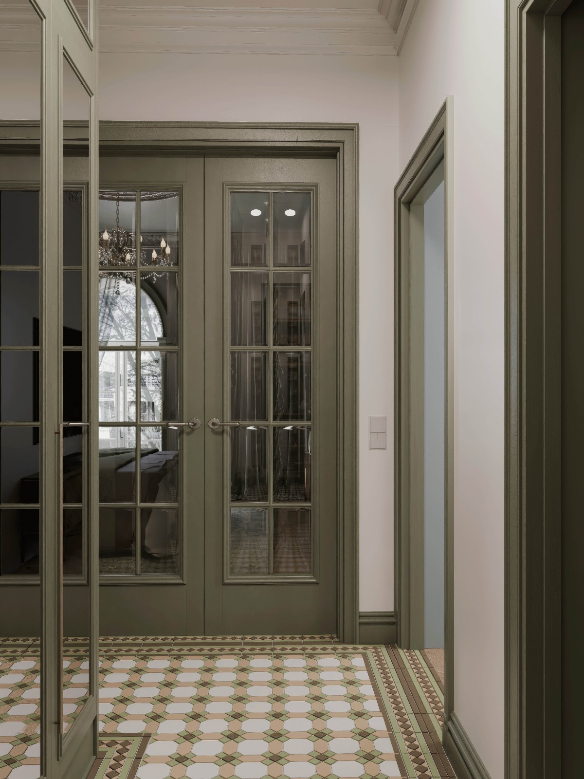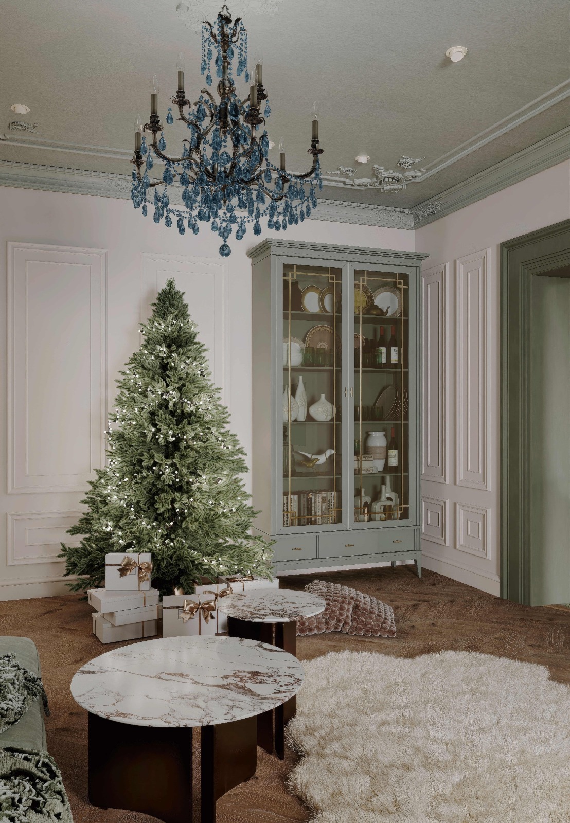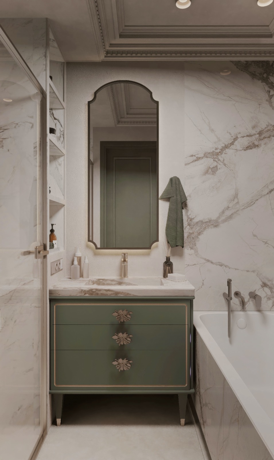 Концепция: Центральным стержнем интерьера является тщательно подобранная коллекция произведений искусства. Главная картина над диваном задает основной колорит гостиной — палитру мягких зеленых и бежевых тонов, которая филигранно поддерживается в отделке, текстиле и мебели. Вторая работа у пианино служит камерным акцентом, а люстра цвета морской стали с бирюзовыми подвесами добавляет вертикальный акцент и французскую легкость. Мозаичная плитка пола на кухне объединяет функциональные зоны, а фактурный текстиль в спальне выступает как финальный штрих, курирующий свет и цвет. Даже в гардеробной тщательно подобранное трио из цвета, шторы и светильника формирует единую эстетику.