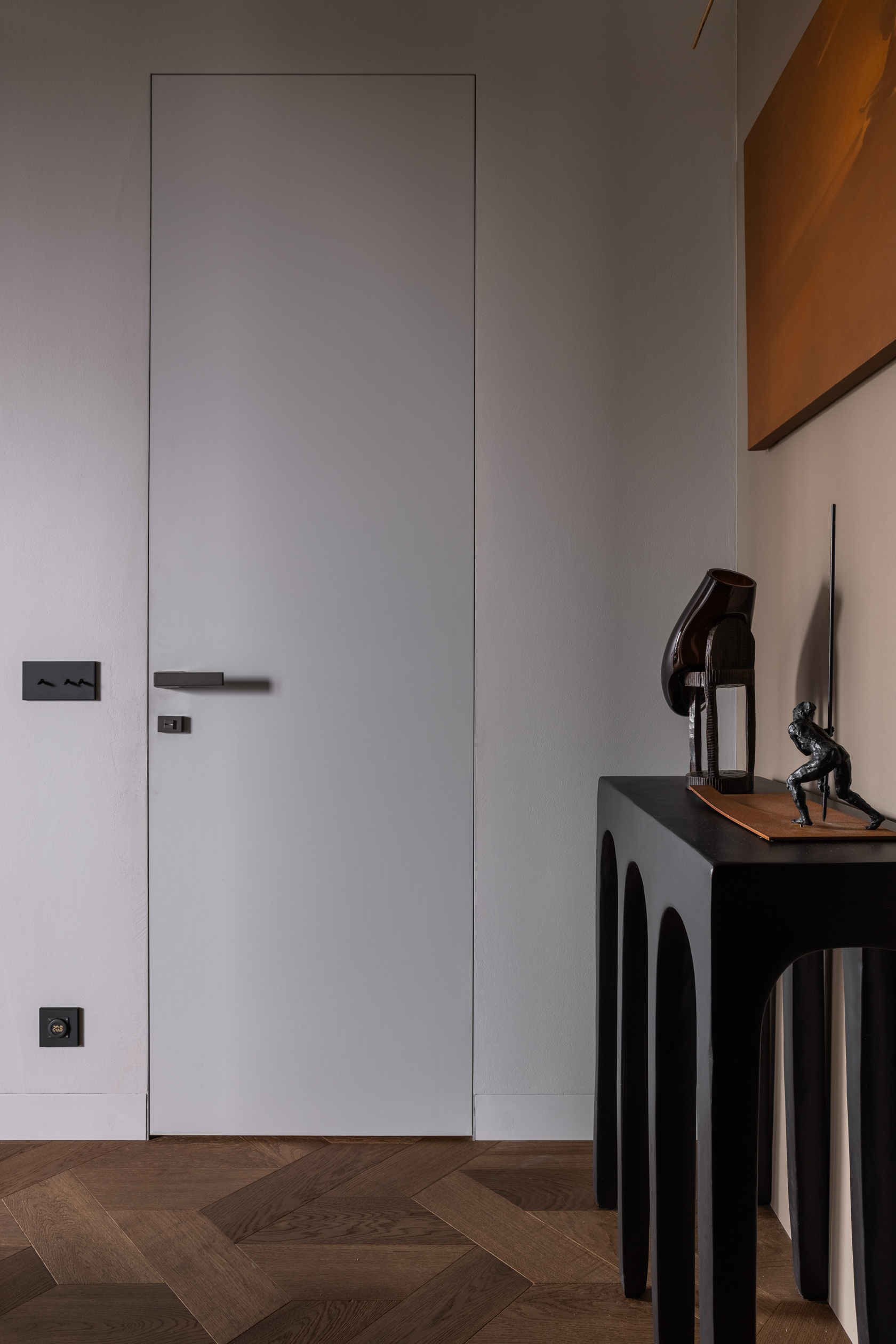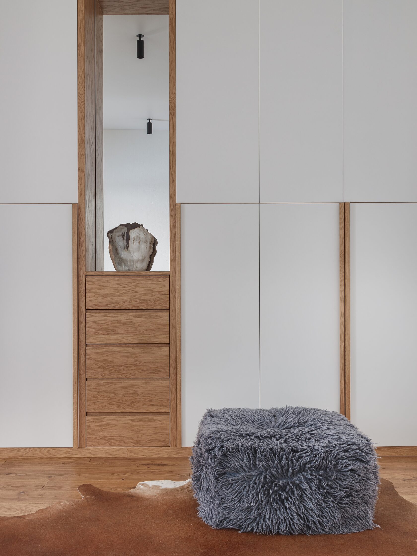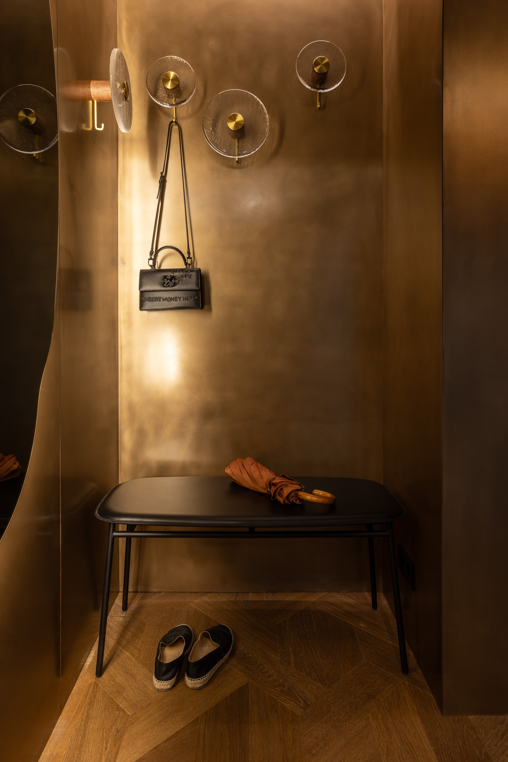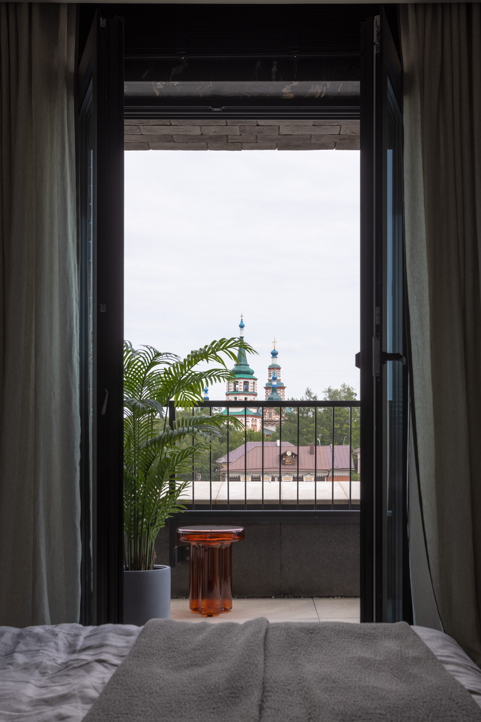 Концепция: Металл и стекло: при входе встречают металлизированные панели с крючками из плавленого стекла на ножках из шпонированного массива. Они напоминают драгоценные камни и перекликаются с фасадным элементом жилого комплекса — чешуей. Природный камень: натуральный гранит у порога дарит ощущение силы и вечности, отсылая к сибирским традициям. Тепло и уют: паркет нежного миндального оттенка, уложенный оригинальным способом, ломает классические каноны и наполняет пространство теплом. Вид и история: панорамные окна открывают живописный пейзаж Иркутска и Крестовоздвиженскую церковь, вплетая городской контекст в интерьер. Современные акценты: потолок из фактурного бетона и открытая проводка подчеркивают минимализм и технологичность. Свет и атмосфера: декоративное освещение — люстры, торшеры, бра — создают мягкий свет и акцентируют внимание на предметах искусства, дорогих владельцу.