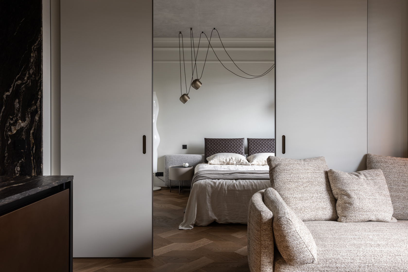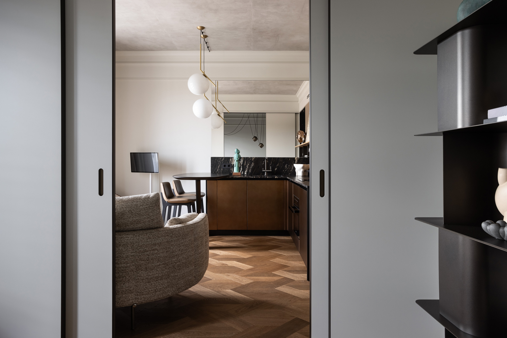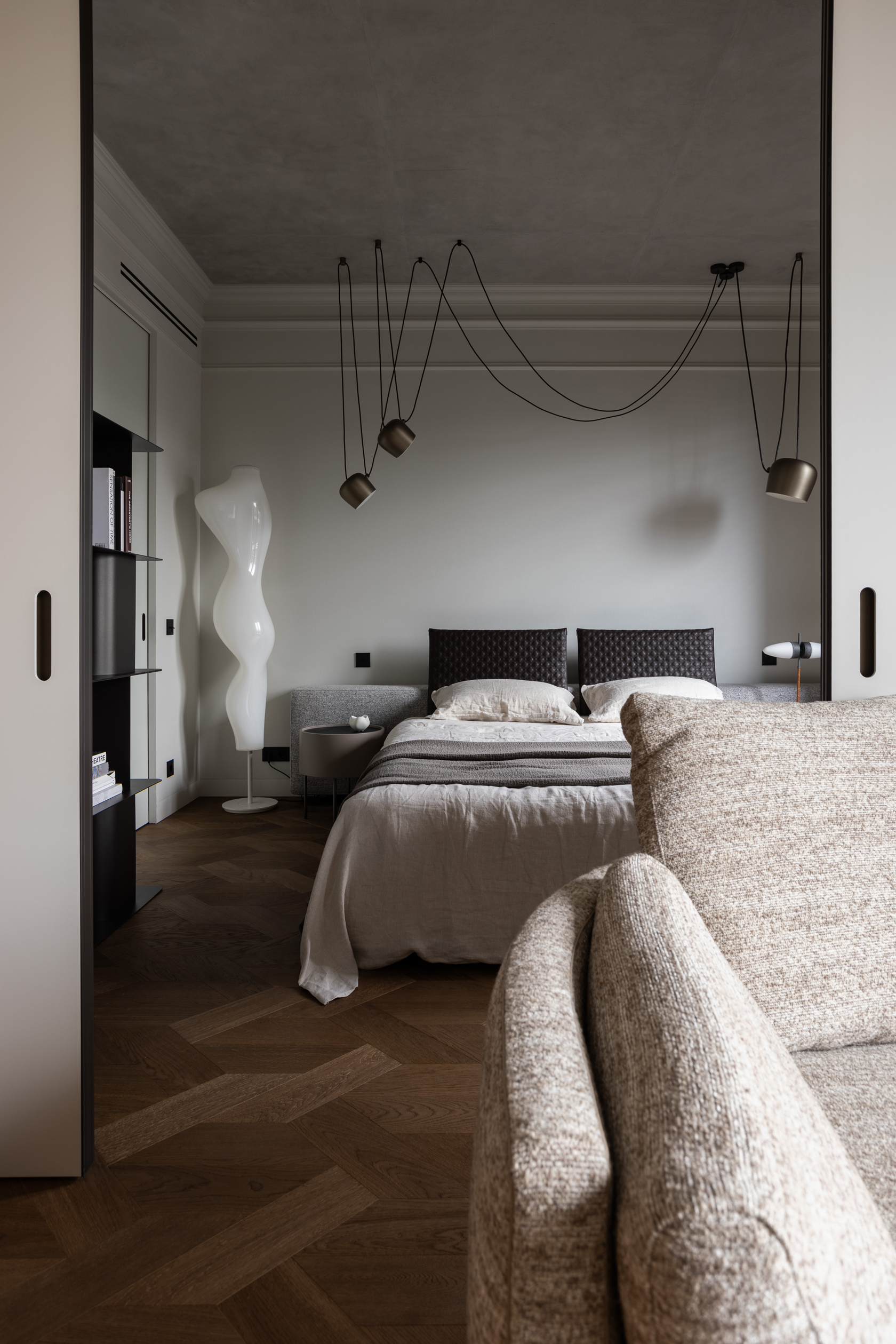 Концепция: Металл и стекло: при входе встречают металлизированные панели с крючками из плавленого стекла на ножках из шпонированного массива. Они напоминают драгоценные камни и перекликаются с фасадным элементом жилого комплекса — чешуей. Природный камень: натуральный гранит у порога дарит ощущение силы и вечности, отсылая к сибирским традициям. Тепло и уют: паркет нежного миндального оттенка, уложенный оригинальным способом, ломает классические каноны и наполняет пространство теплом. Вид и история: панорамные окна открывают живописный пейзаж Иркутска и Крестовоздвиженскую церковь, вплетая городской контекст в интерьер. Современные акценты: потолок из фактурного бетона и открытая проводка подчеркивают минимализм и технологичность. Свет и атмосфера: декоративное освещение — люстры, торшеры, бра — создают мягкий свет и акцентируют внимание на предметах искусства, дорогих владельцу.