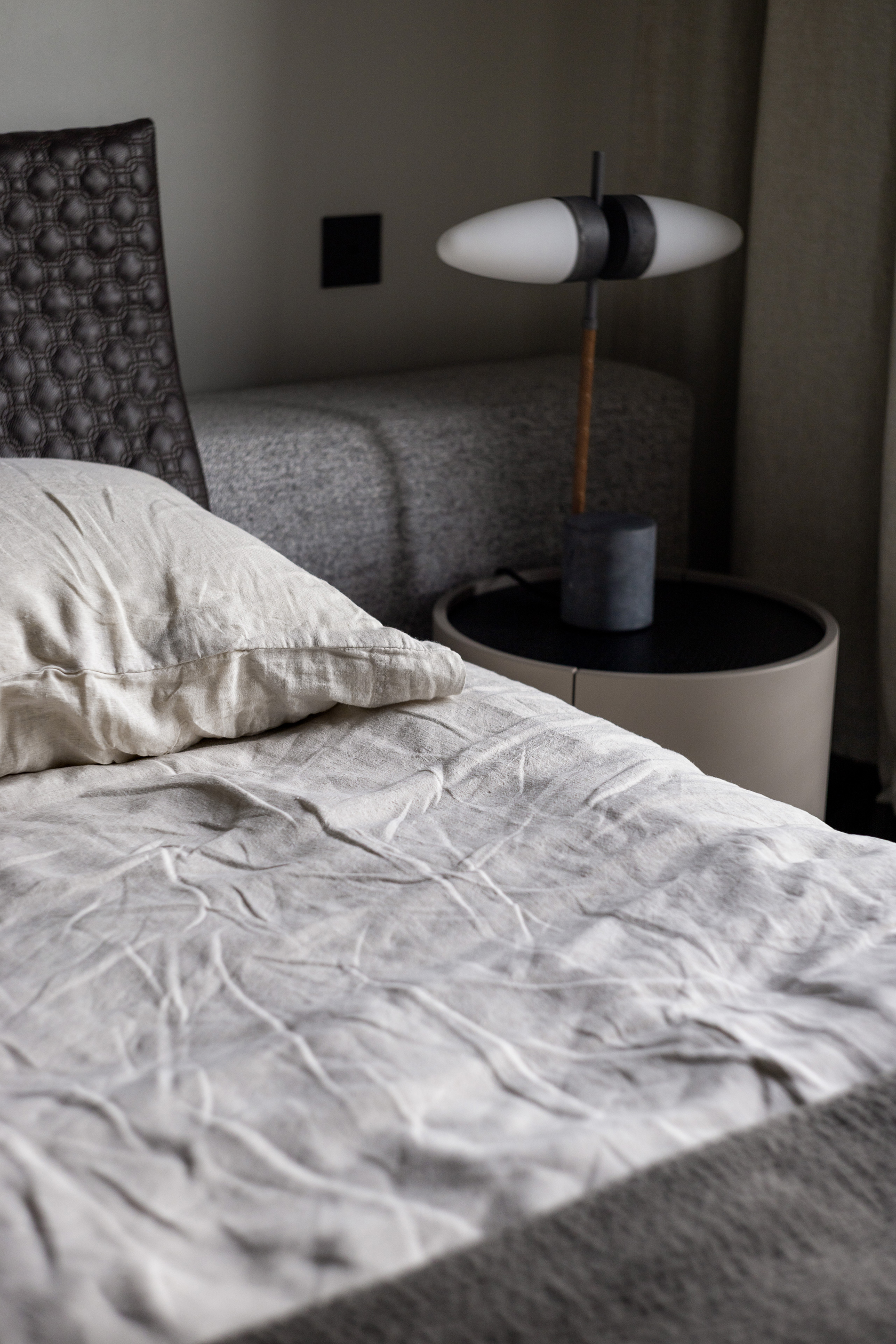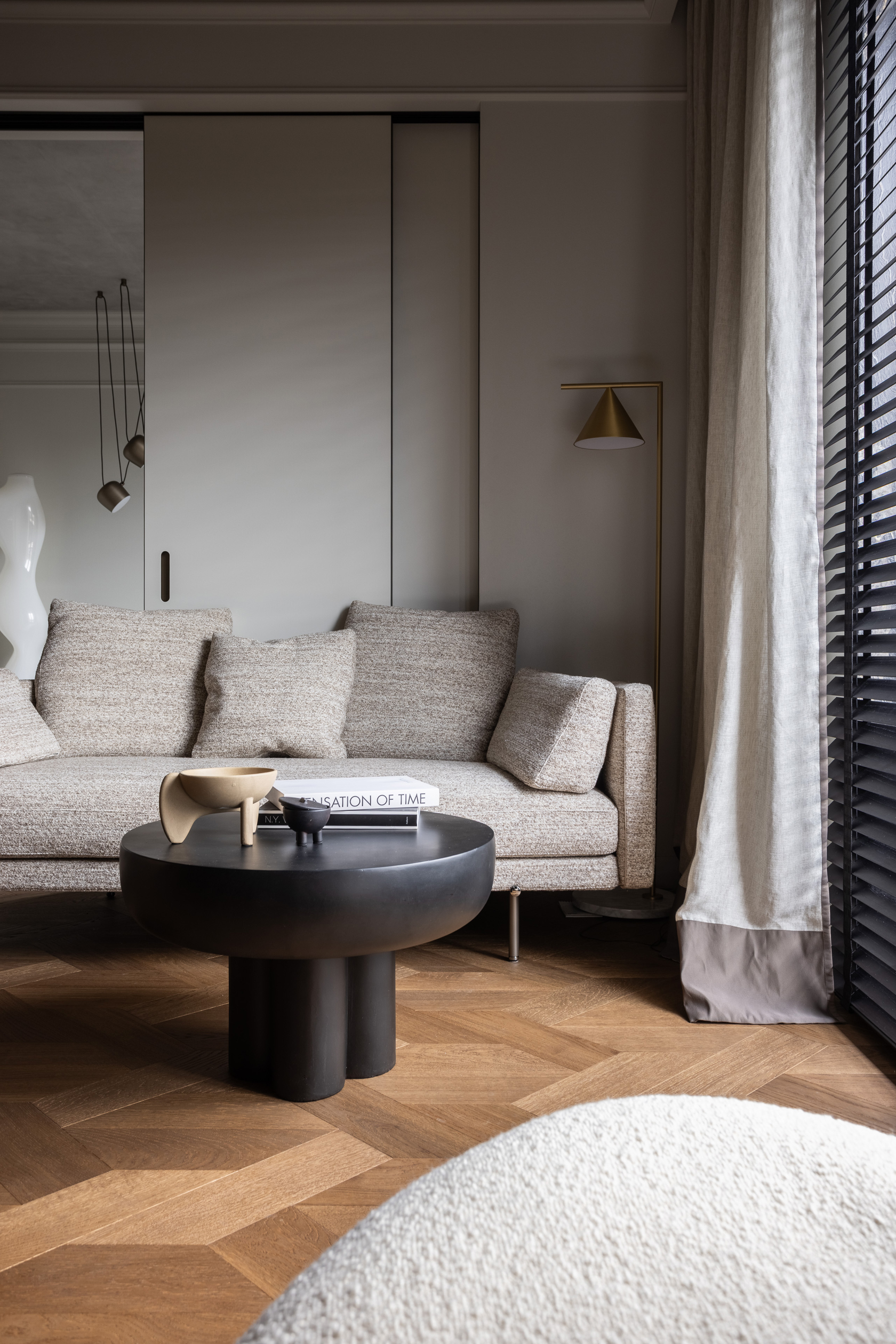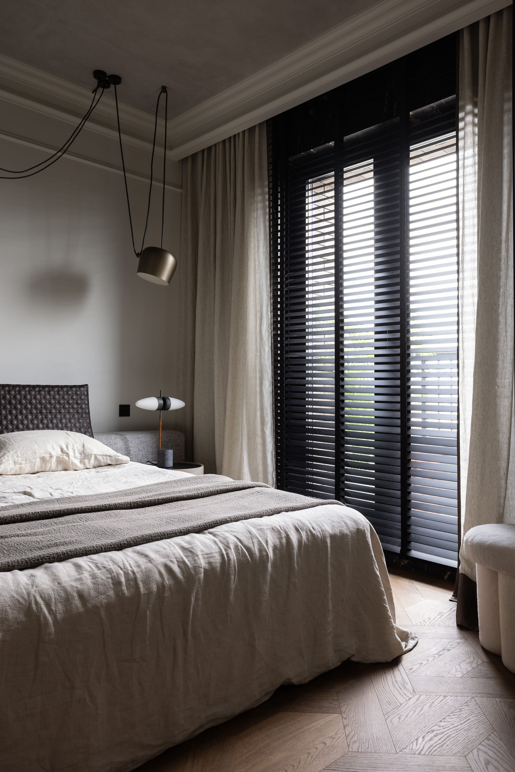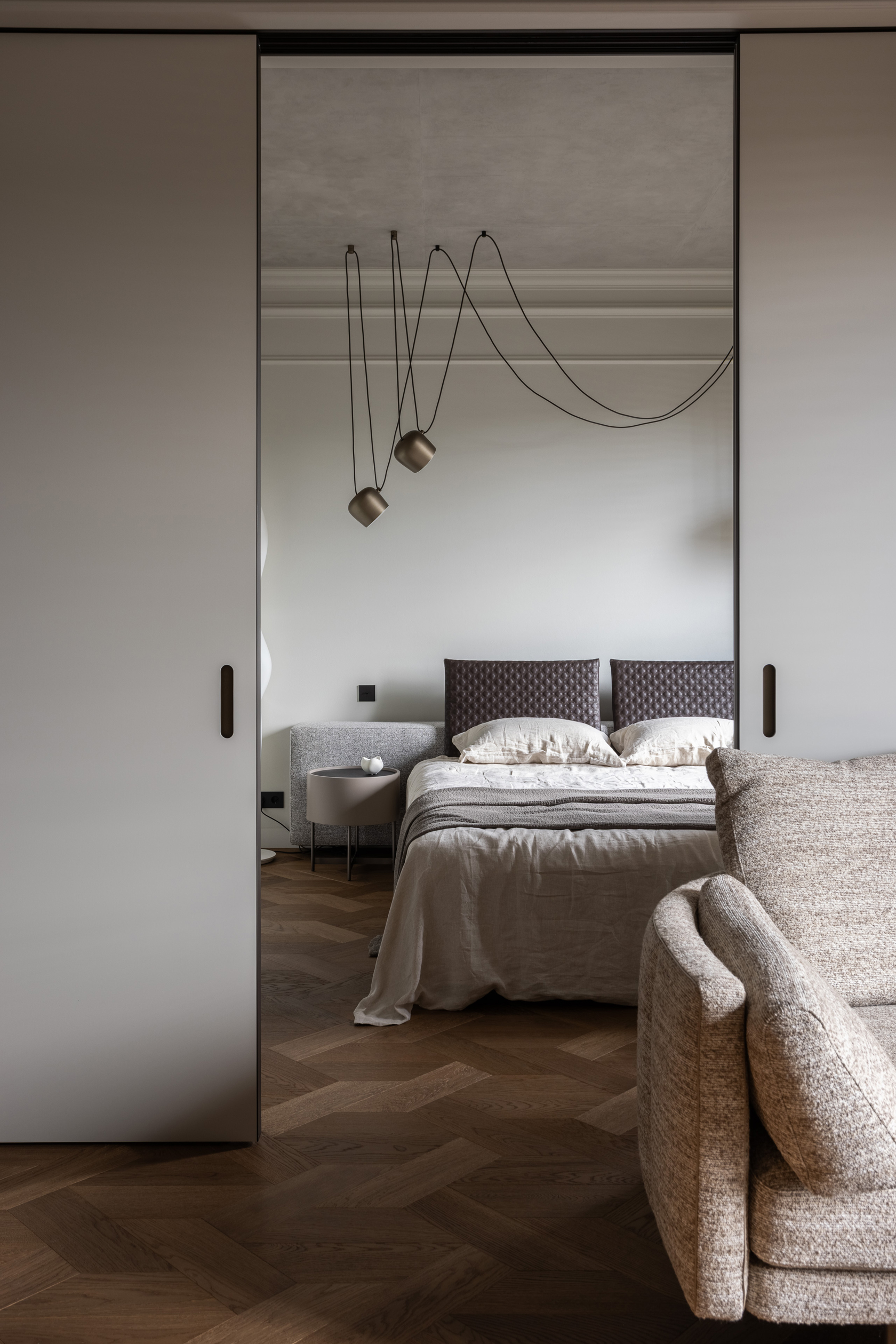 Концепция: Металл и стекло: при входе встречают металлизированные панели с крючками из плавленого стекла на ножках из шпонированного массива. Они напоминают драгоценные камни и перекликаются с фасадным элементом жилого комплекса — чешуей. Природный камень: натуральный гранит у порога дарит ощущение силы и вечности, отсылая к сибирским традициям. Тепло и уют: паркет нежного миндального оттенка, уложенный оригинальным способом, ломает классические каноны и наполняет пространство теплом. Вид и история: панорамные окна открывают живописный пейзаж Иркутска и Крестовоздвиженскую церковь, вплетая городской контекст в интерьер. Современные акценты: потолок из фактурного бетона и открытая проводка подчеркивают минимализм и технологичность. Свет и атмосфера: декоративное освещение — люстры, торшеры, бра — создают мягкий свет и акцентируют внимание на предметах искусства, дорогих владельцу.
