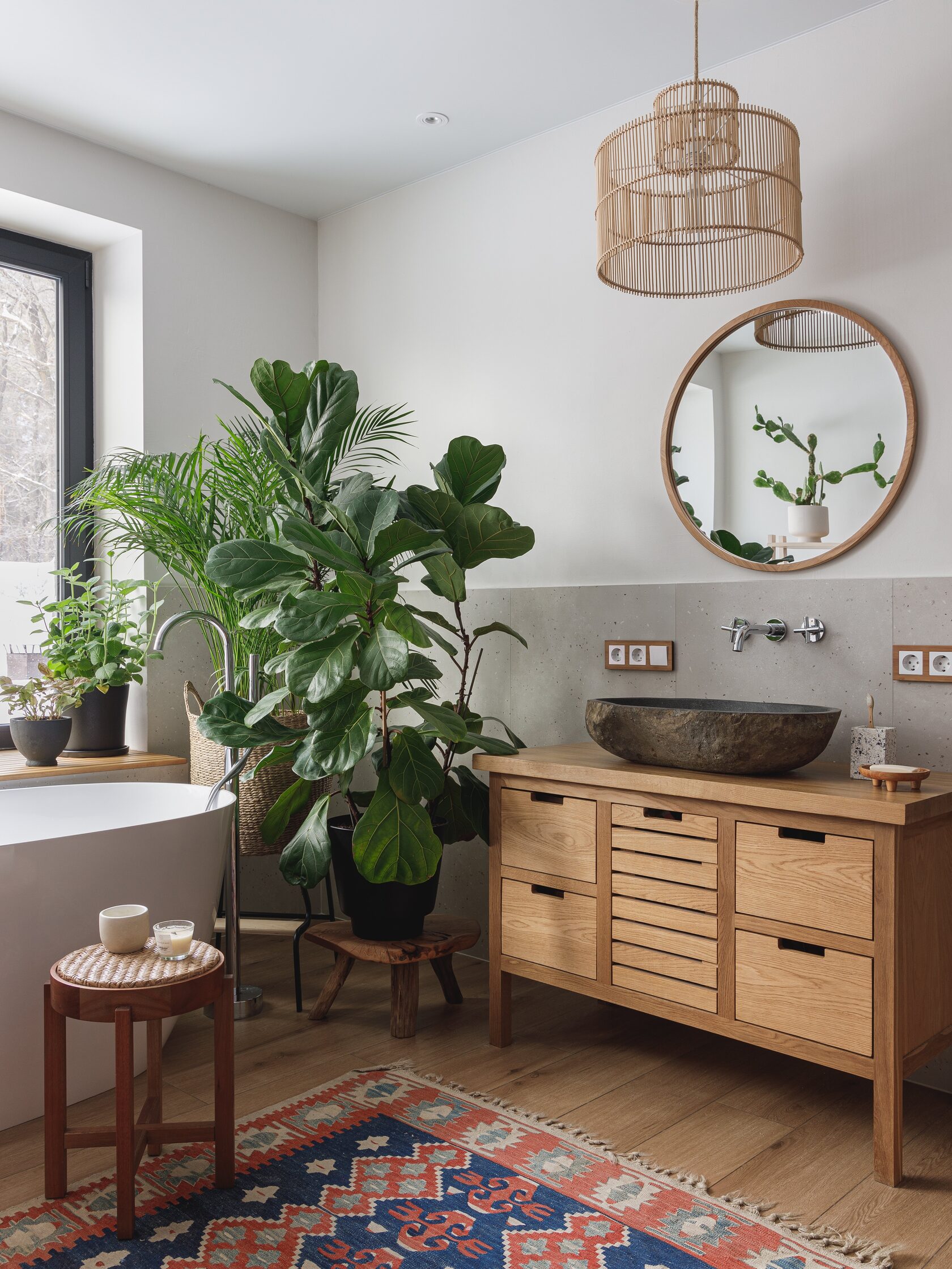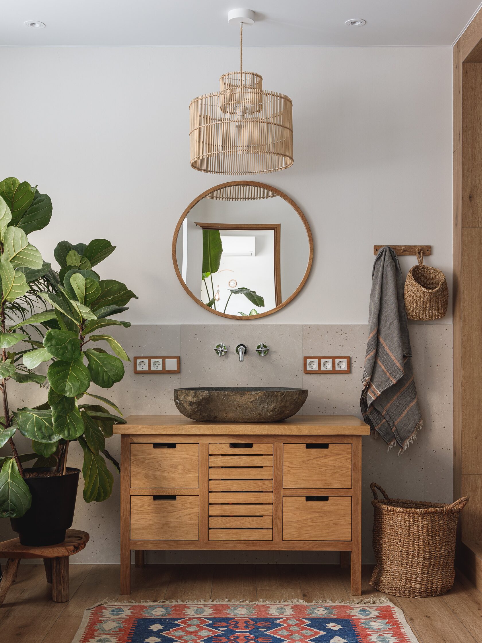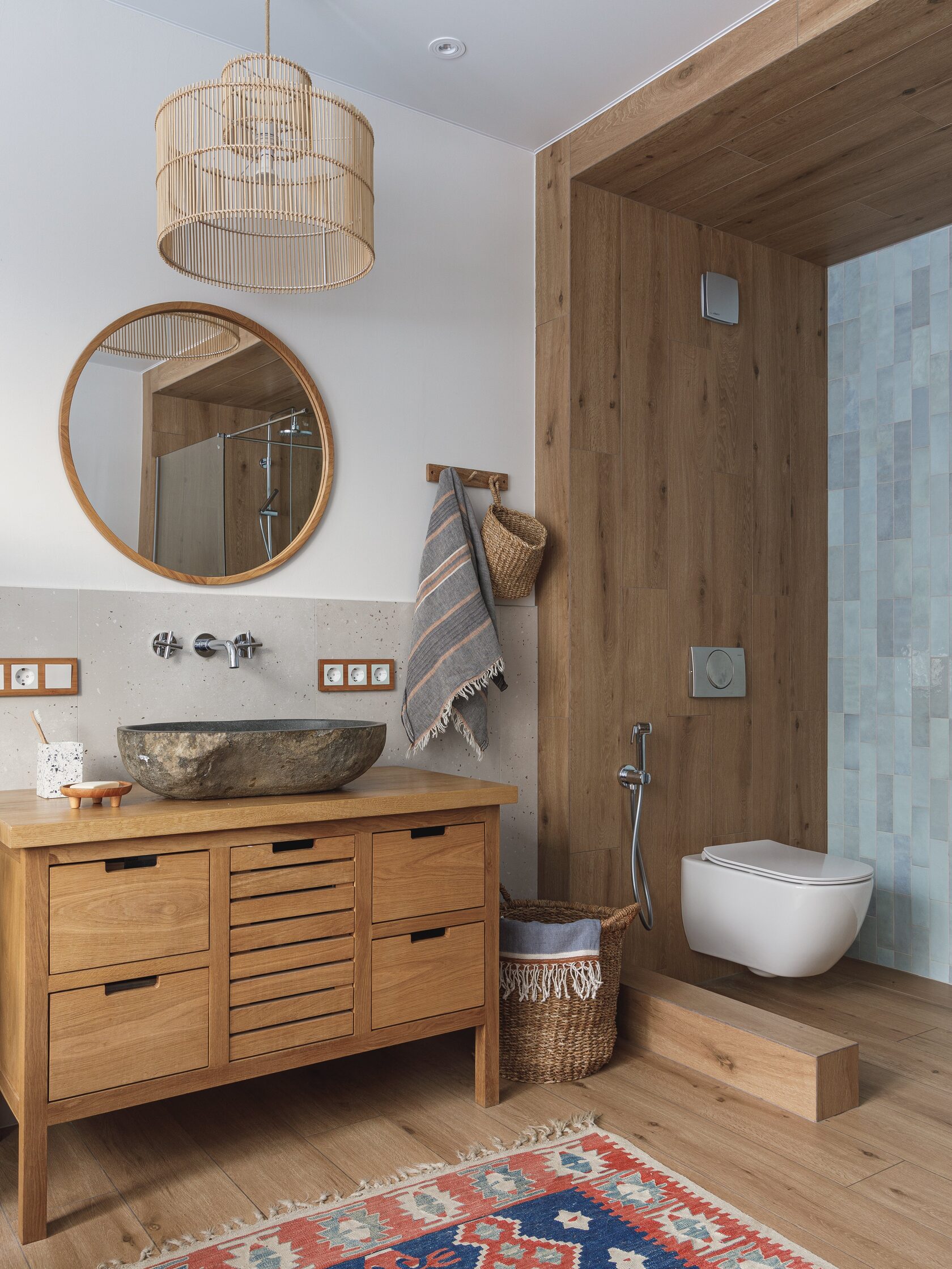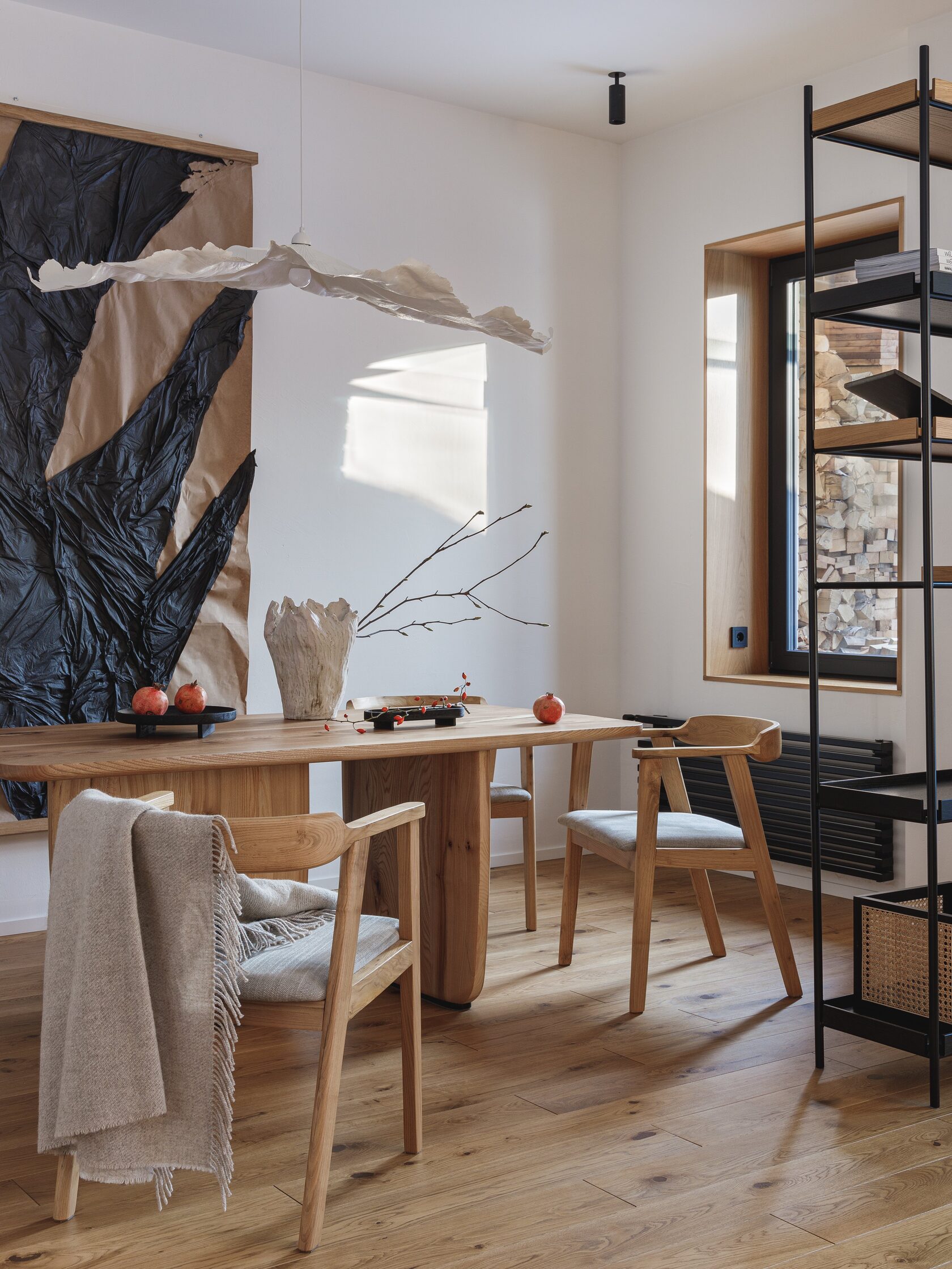 Концепция: Заказчики пришли с ясным пониманием желаемого интерьера. Основные ориентиры: Натуральные материалы: дерево, светлые тона, живая зелень. Акценты: грузинский ковер из путешествий и две картины, ставшие смысловыми центрами интерьера. Этнические мотивы: наполняют пространство цветом, орнаментом и глубиной. Индивидуальность: многие детали выполнены на заказ, а часть предметов сделана руками хозяйки. Особая атмосфера: в доме нет телевизоров — вместо этого внимание гостей приковывают предметы искусства и их истории.