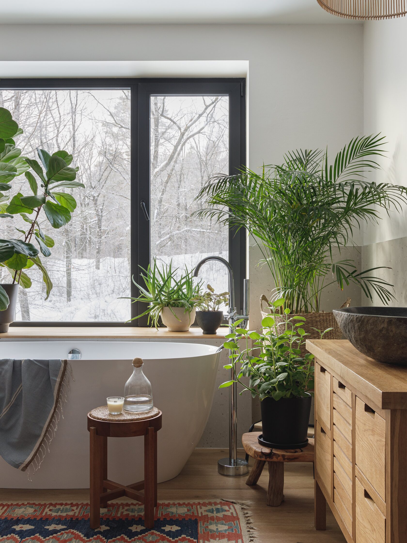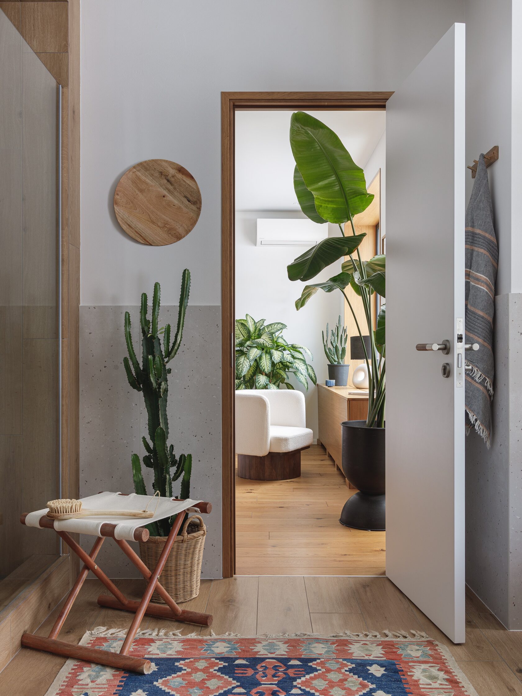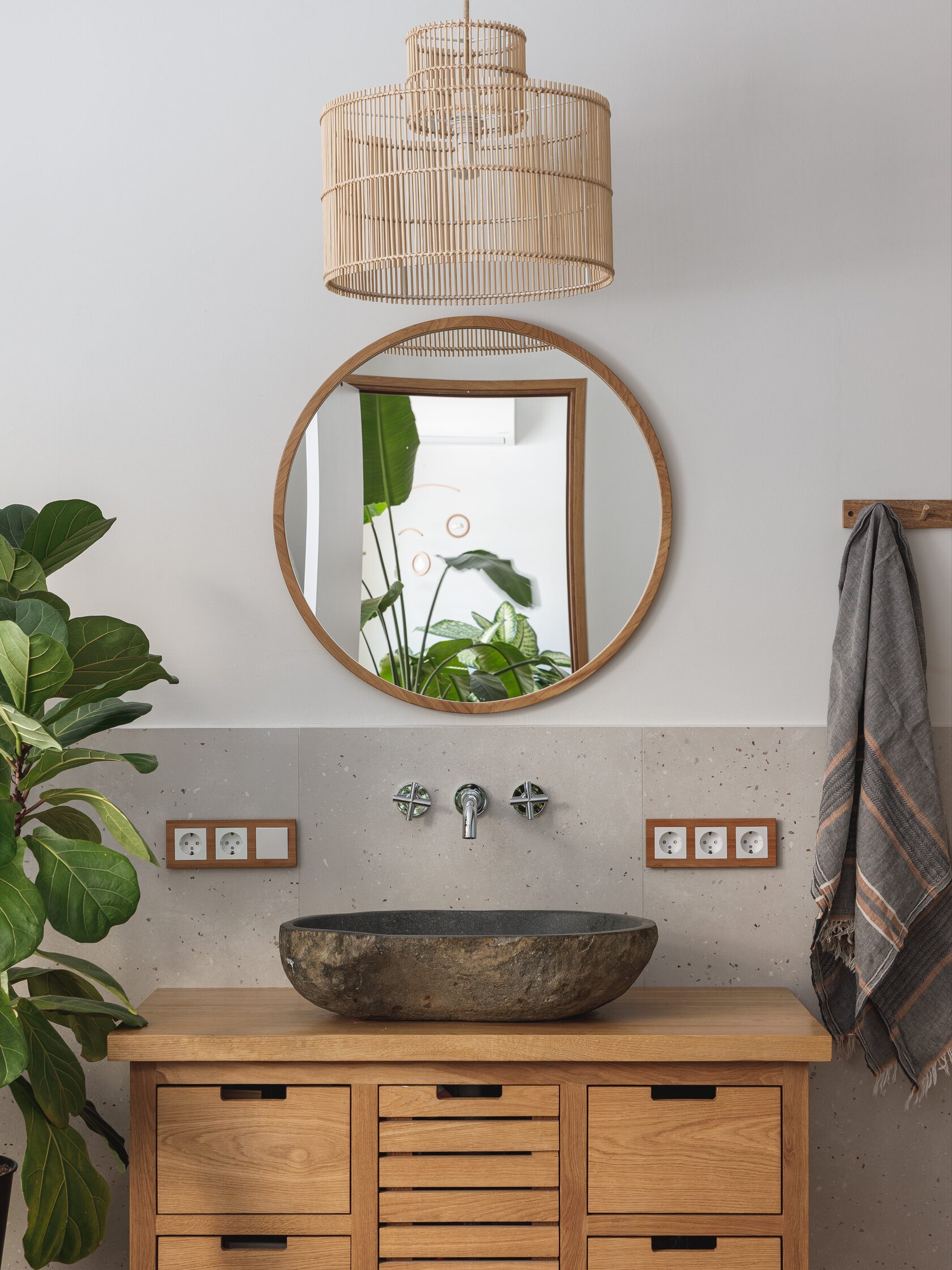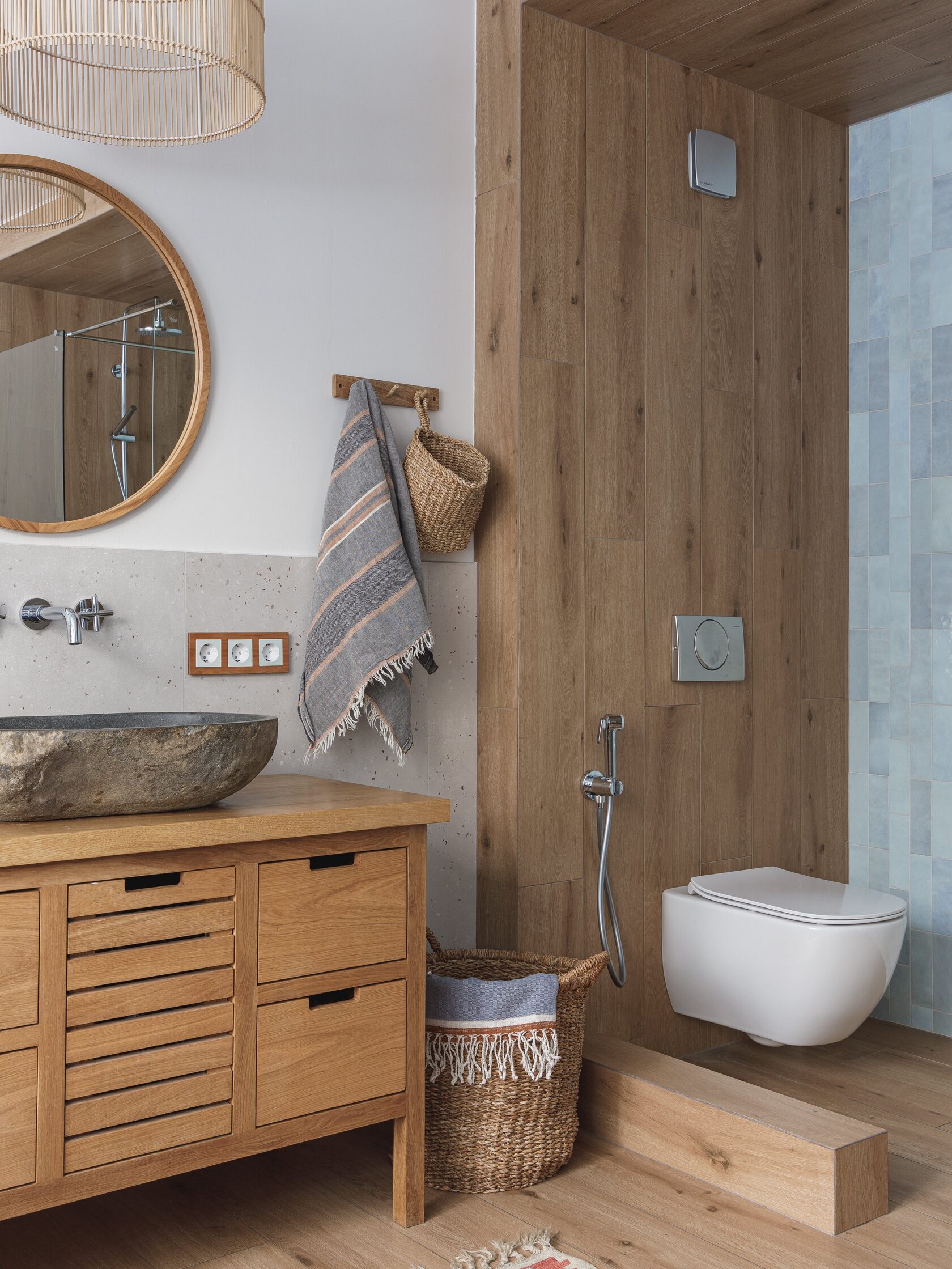 Концепция: Заказчики пришли с ясным пониманием желаемого интерьера. Основные ориентиры: Натуральные материалы: дерево, светлые тона, живая зелень. Акценты: грузинский ковер из путешествий и две картины, ставшие смысловыми центрами интерьера. Этнические мотивы: наполняют пространство цветом, орнаментом и глубиной. Индивидуальность: многие детали выполнены на заказ, а часть предметов сделана руками хозяйки. Особая атмосфера: в доме нет телевизоров — вместо этого внимание гостей приковывают предметы искусства и их истории.