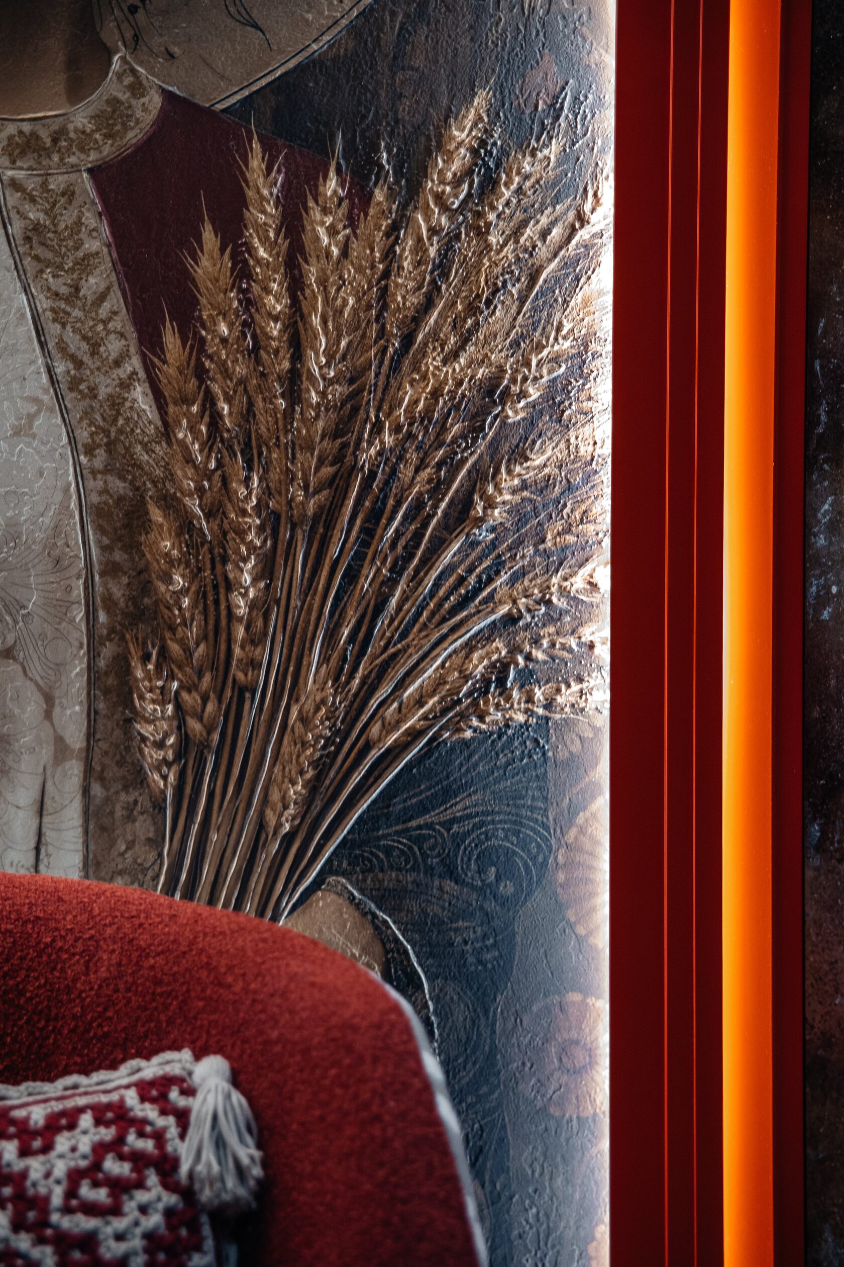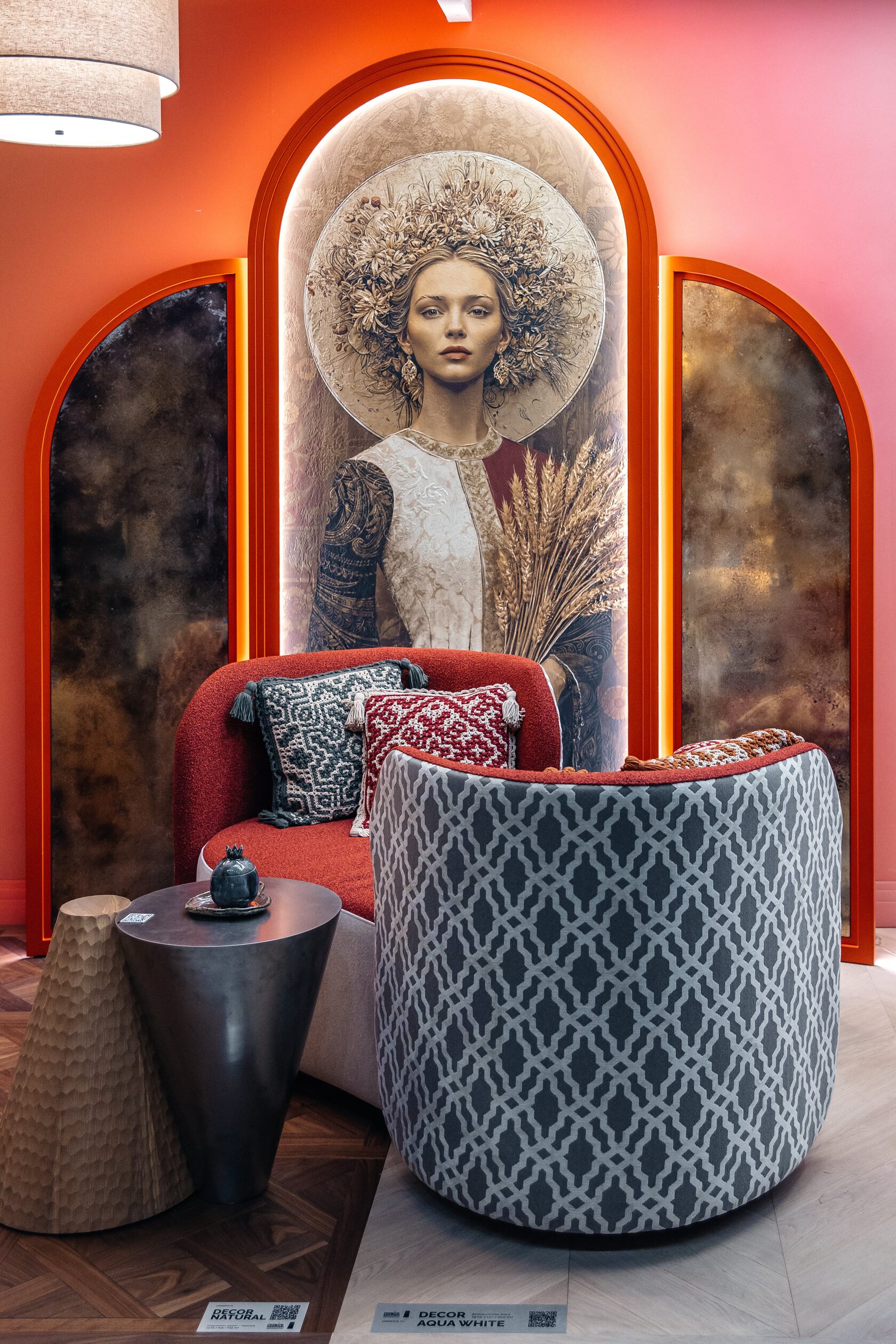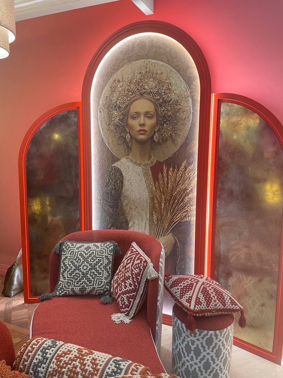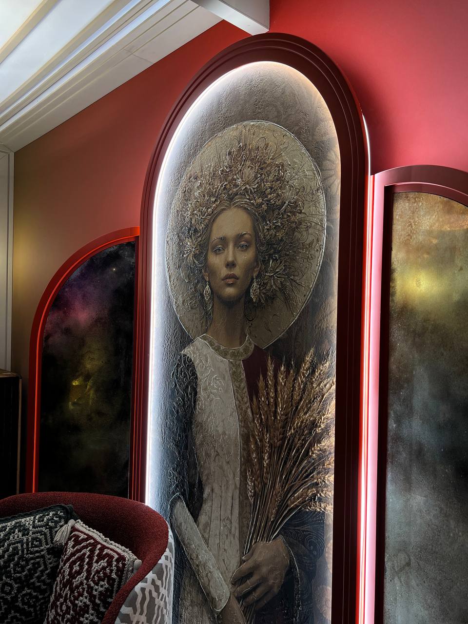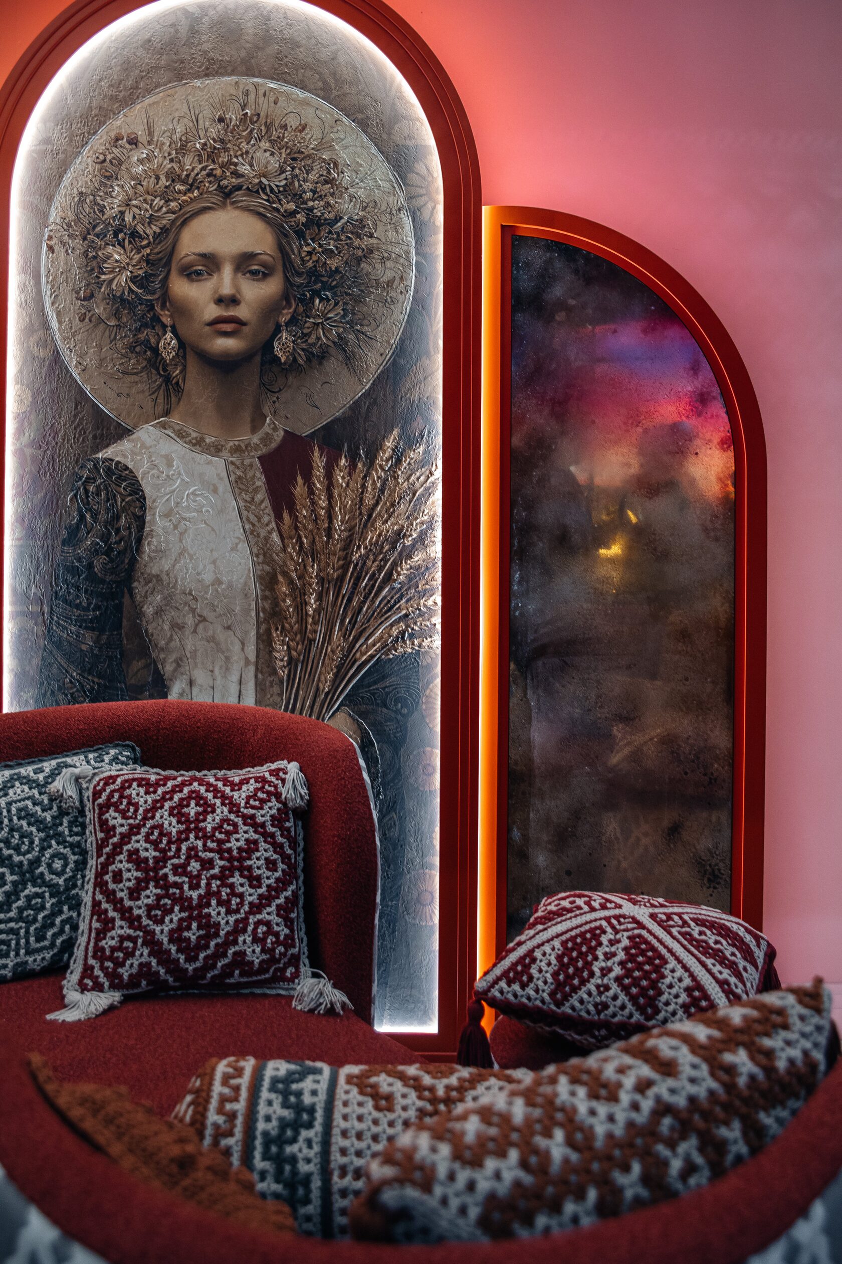 Капсула представляет собой художественное пространство, где историческое наследие встречается с современными формами, цветами и материалами. Центральный образ — Берегиня, древнеславянская покровительница рода и семьи, расположена в стилизованном трельяже с зеркалами с эффектом состаривания, создающими ощущение глубины времени.