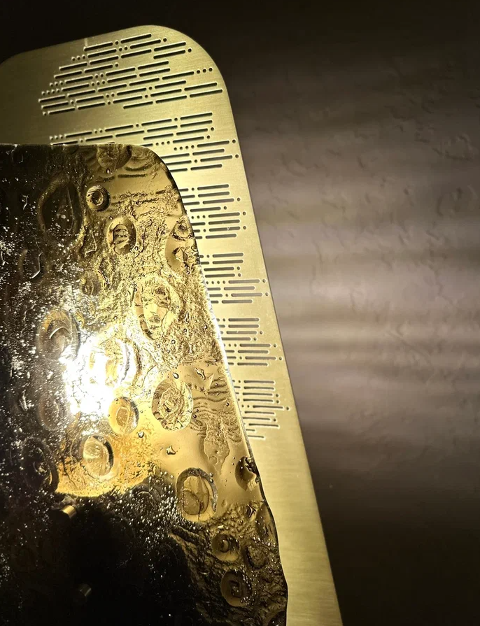 Форма: латунный абажур с перфорацией, где зашифрована фраза «Красота в глазах смотрящего» — знаменитое высказывание Оскара Уайльда.