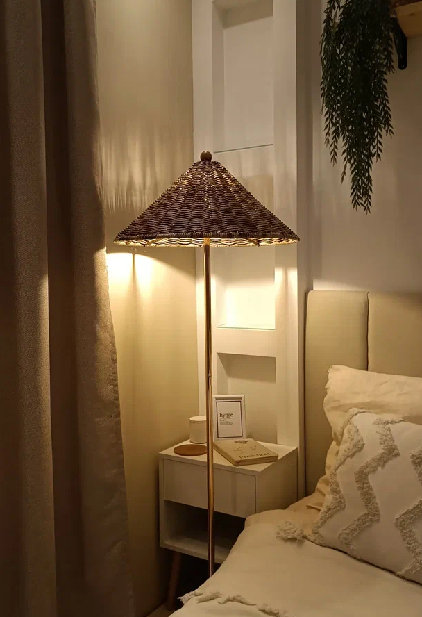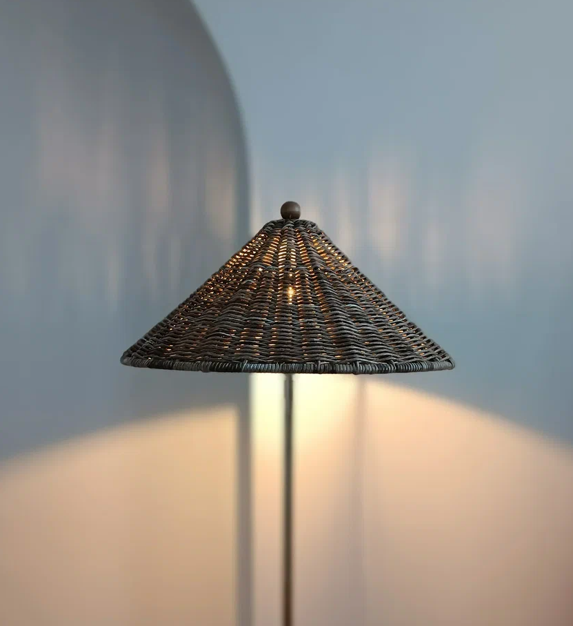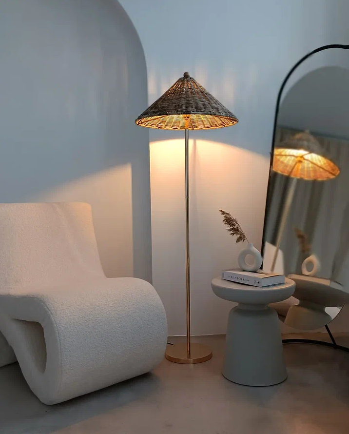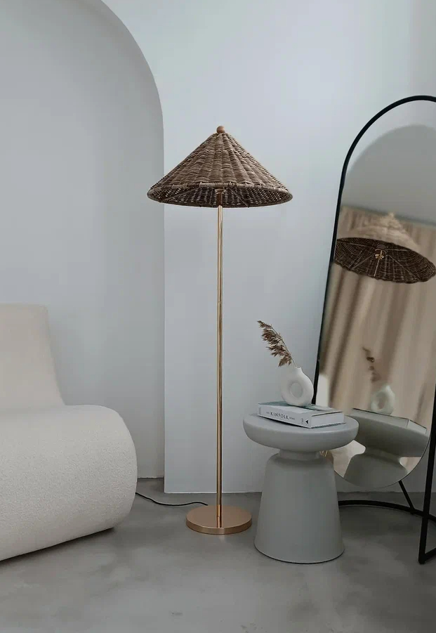 Торшер «Гриб» — это уникальный светильник, вдохновленный изящными формами грибов, особенно поганок. Его дизайн сочетает широкий плетеный абажур и тонкую ножку, создавая легкий и изысканный образ.
