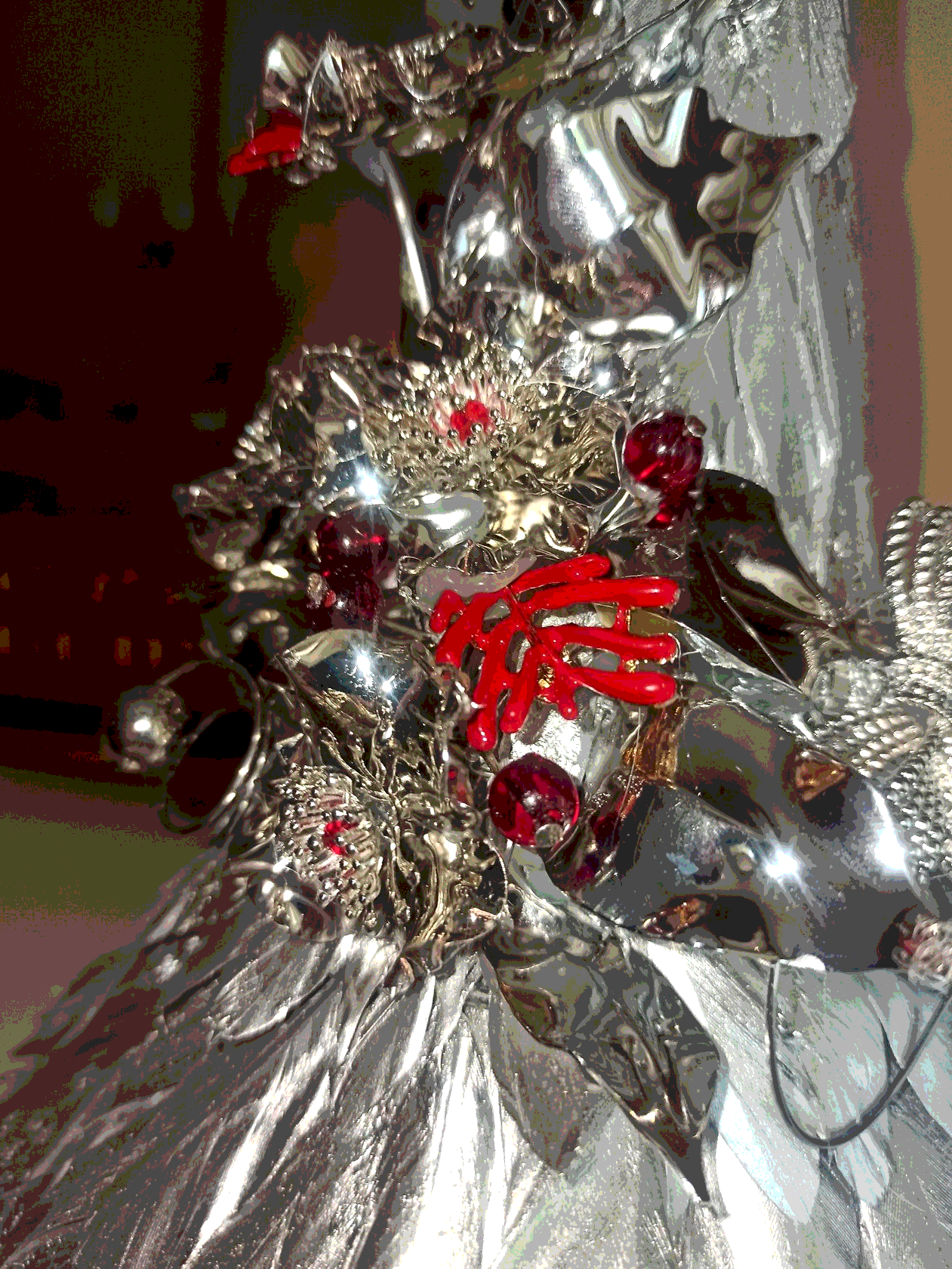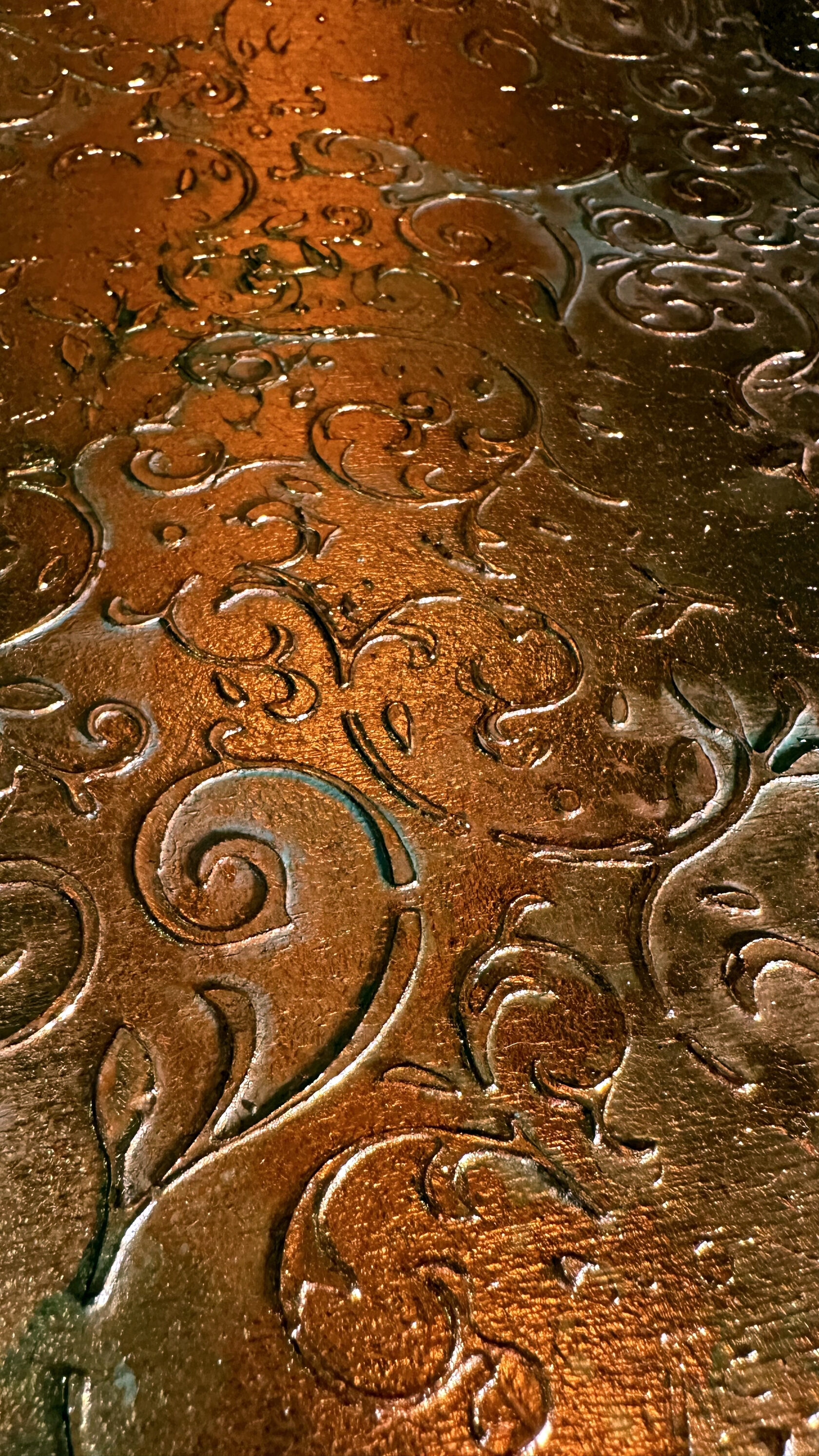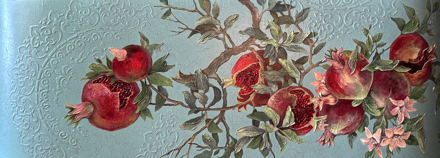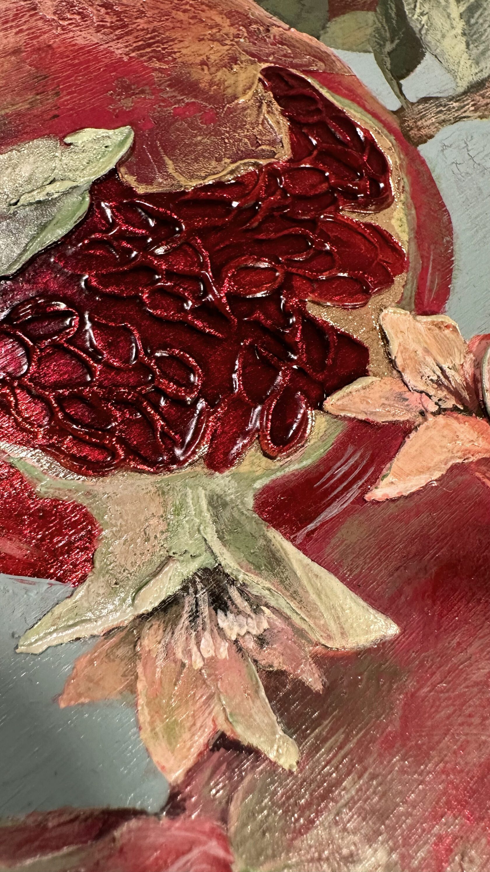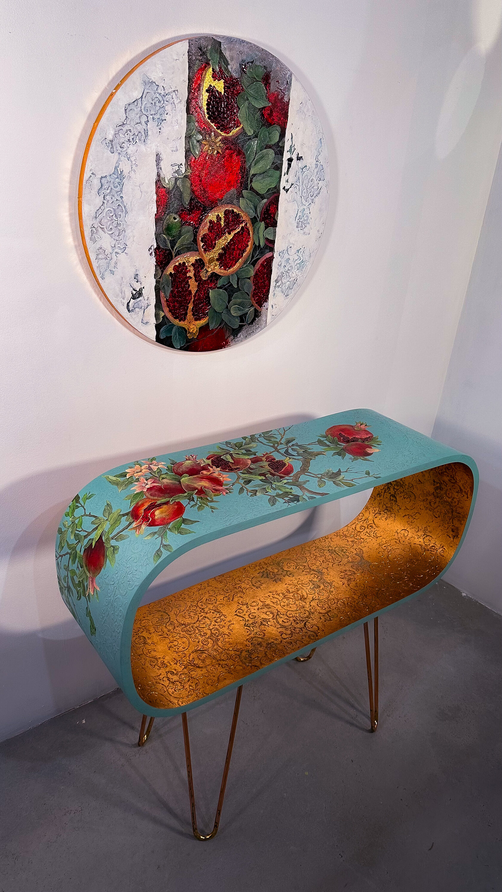 Концепция: Основная концепция проекта — передача символизма граната через многослойность и фактуру. Конструкция из гнуто-клееного шпона березы и дуба формирует основу. Золочение красной и золотой поталью, роспись художественным акрилом с акрил-алкидным финишным покрытием, а также объемная паста и кракелюрный лак создают богатство поверхности. Особое внимание уделено авторской технике исполнения ягод плодов. Металлические ножки, также покрытые поталью, завершают целостный образ.