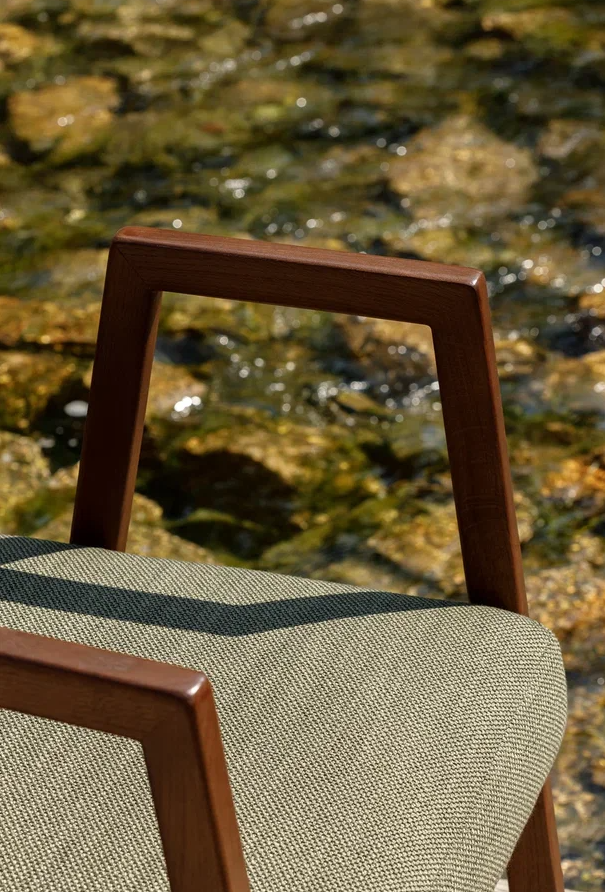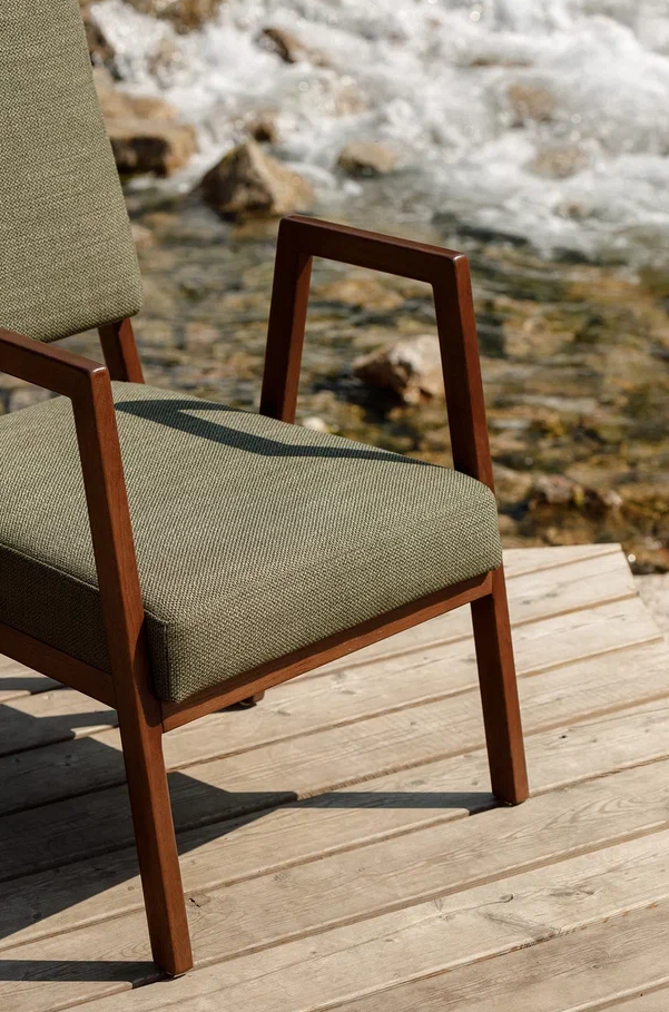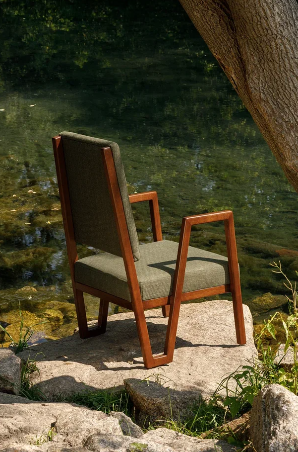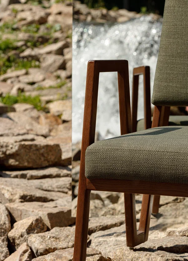 Материалы: массив дуба в оттенке "темный дуб" и акцентная обивка из рогожки насыщенного хвойного цвета.