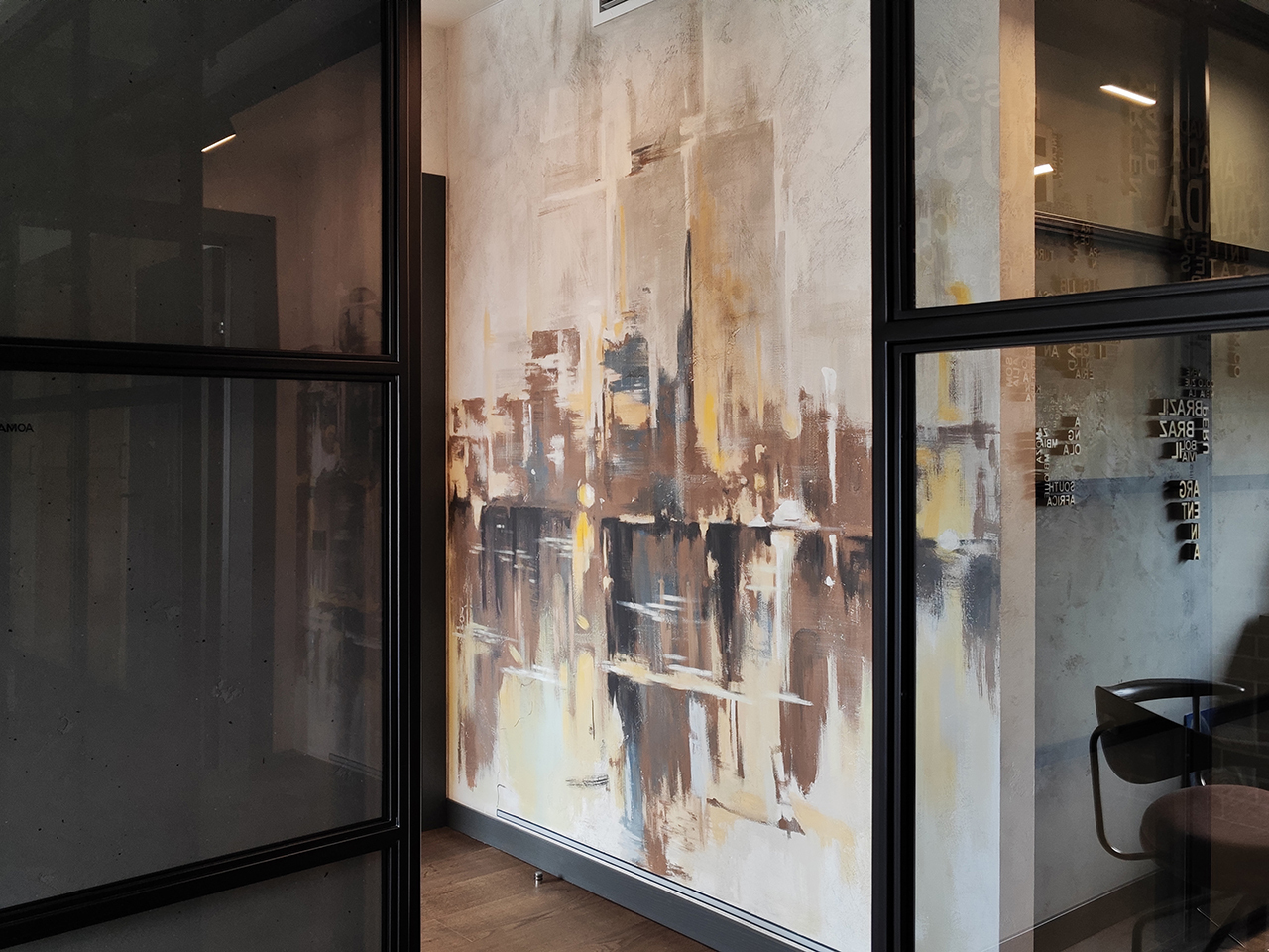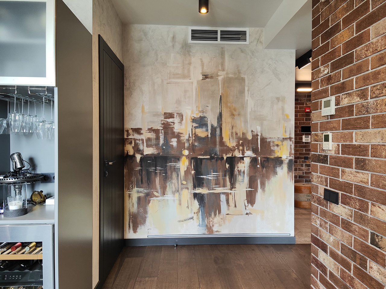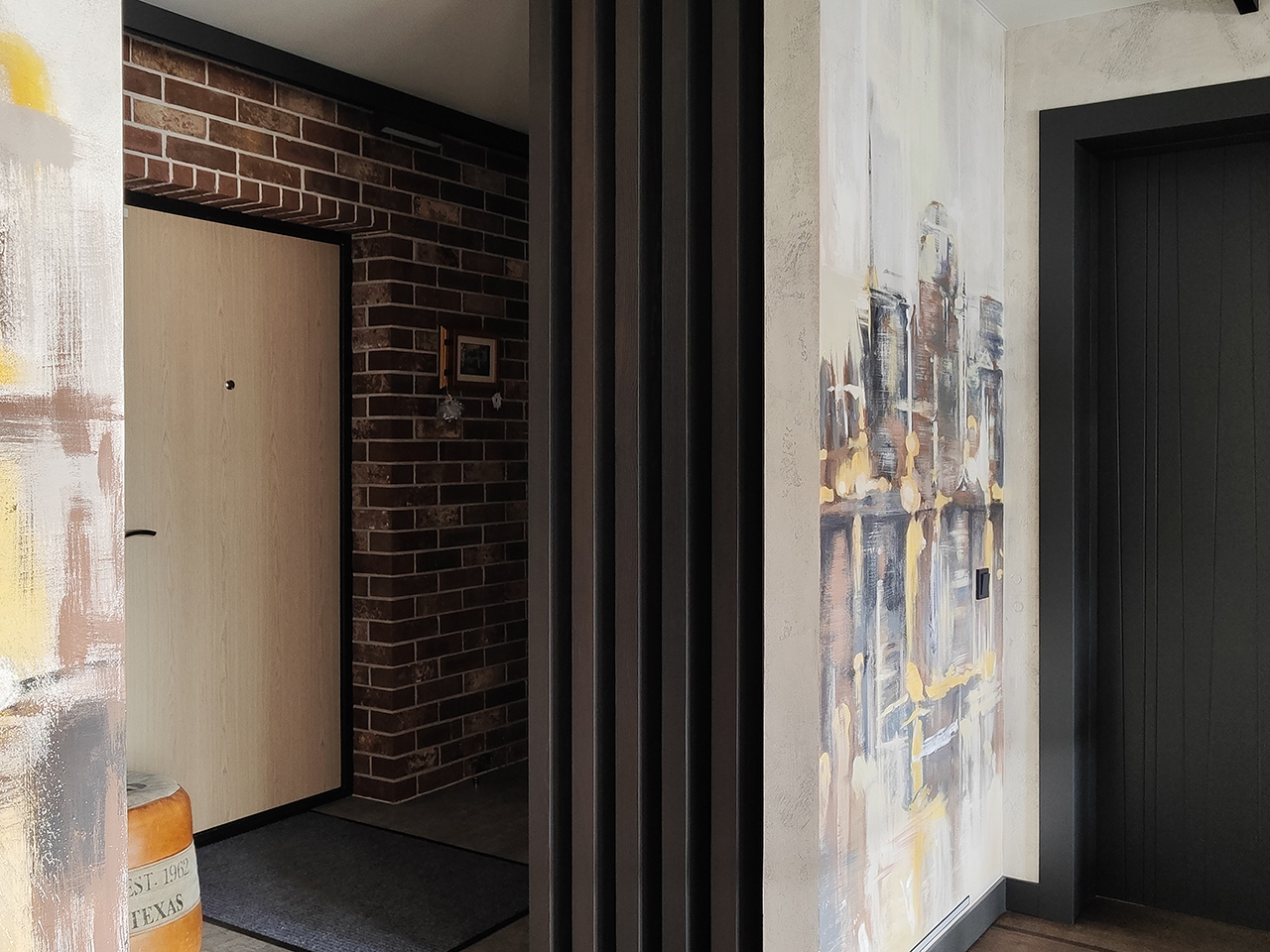 Интерьер квартиры наполнен арт-объектами, объединяющими пространство в единое целое. Холл с росписью в абстрактных мотивах, переходящий в кухню-гостиную, передает динамику городской жизни. Теплые бежевые, коричневые и золотистые оттенки создают уют, а контрастные черные и синие акценты придают глубину и выразительность.