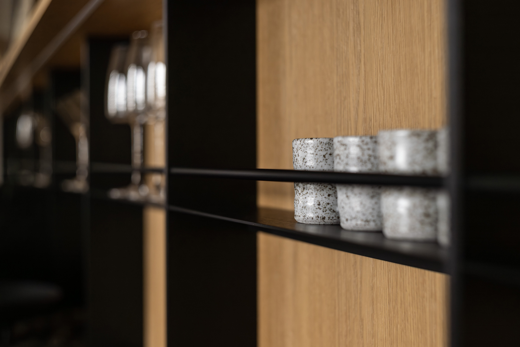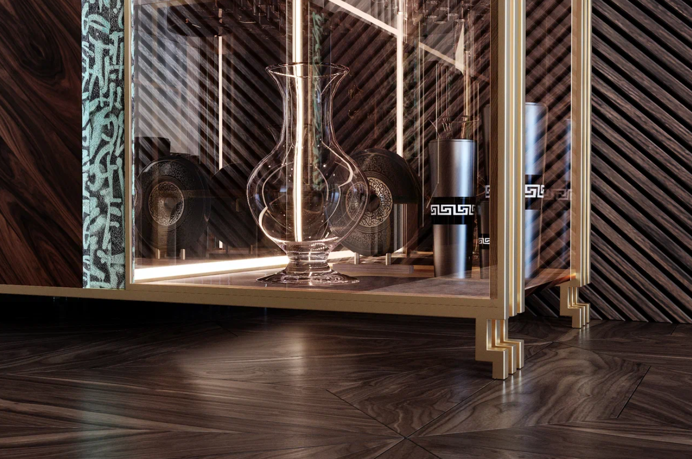 ТВ-зона — встроенная ТВ-панель на фоне чёрного стекла с полками из бронзированного стекла и латунного профиля, где размещены бокалы и декор.