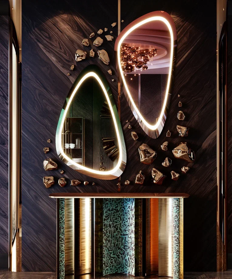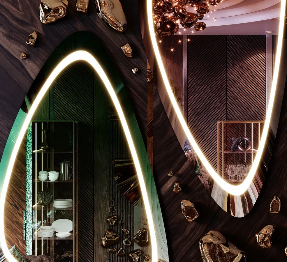 Магия отражения Зеркало «Окно в другой мир» — это необычный предмет интерьера, где каждая деталь продумана до мелочей. Это не просто предмет интерьера, а настоящий портал в параллельную реальность. Архитектурная элегантность Четкие геометричные линии корпуса, напоминающие форму классического окна, создают ощущение гармонии и порядка. Черный металлический профиль, обрамляющий конструкцию, не только подчеркивает её элегантность, но и формирует в центре изящную букву «У» — символ ума и умиротворения. Эффект бесконечности Особую магию зеркалу придает инновационное решение с эффектом «тоннеля». Встроенная подсветка создает завораживающий световой поток, который словно приглашает заглянуть за грань привычного мира. Затемненный оттенок зеркальной поверхности усиливает этот эффект, погружая зрителя в атмосферу таинственности и загадочности. Философия пространства Зеркало «Окно в другой мир» — это больше чем предмет мебели. Это мост между реальностью и воображением, между повседневностью и мечтой, между внешним и внутренним миром. Каждый, кто смотрит в это зеркало, невольно погружается в свои мысли, находя в нем отражение не только внешнего, но и внутреннего мира. Оно становится центром притяжения в интерьере, заставляя задуматься о границах реальности и фантазии и меняет восприятие пространства.
