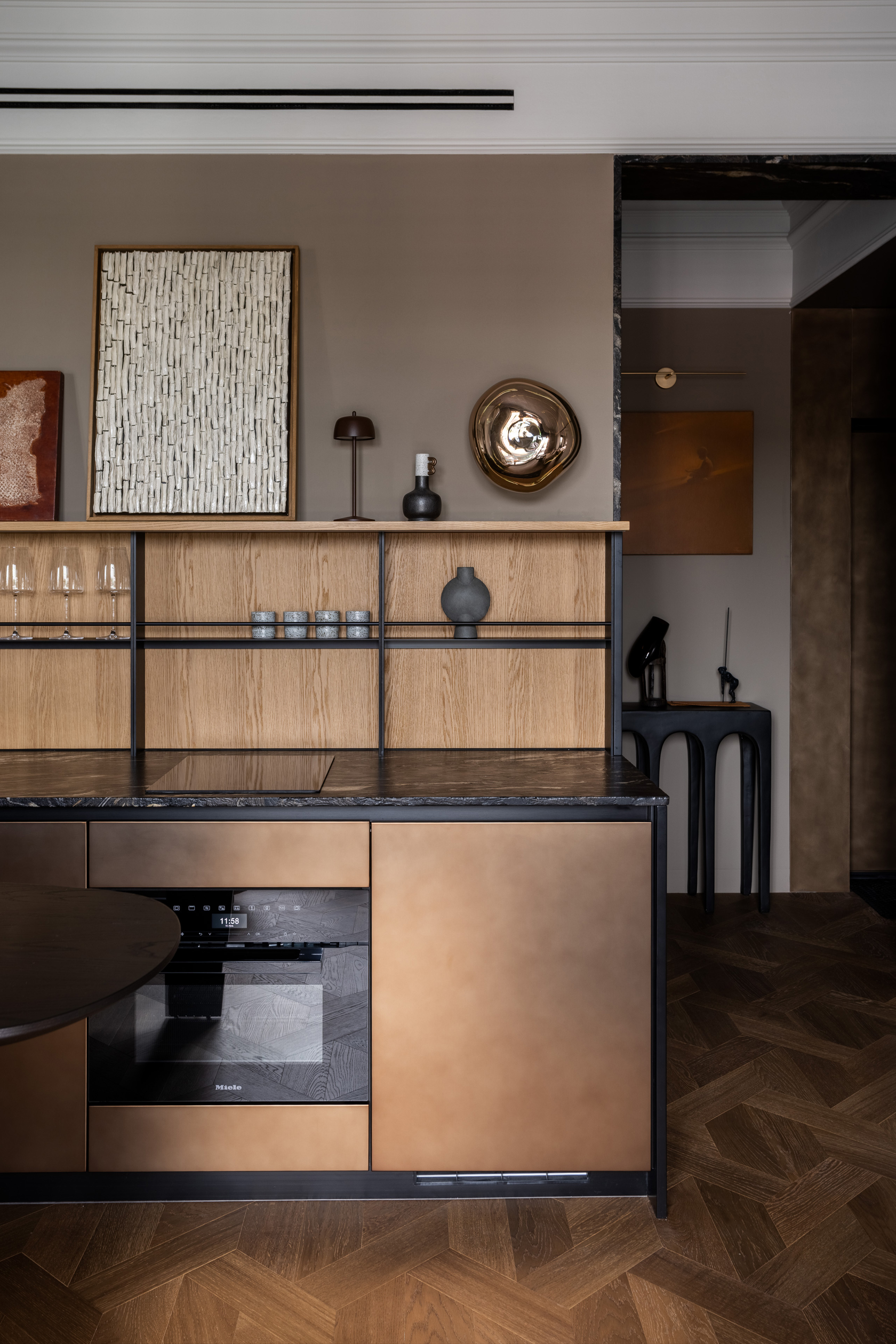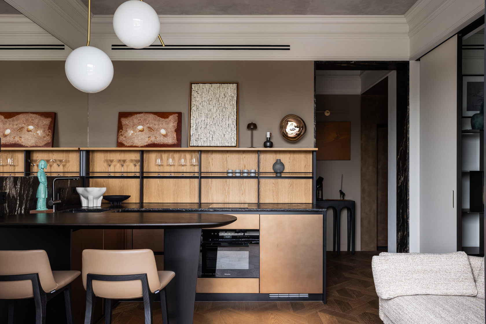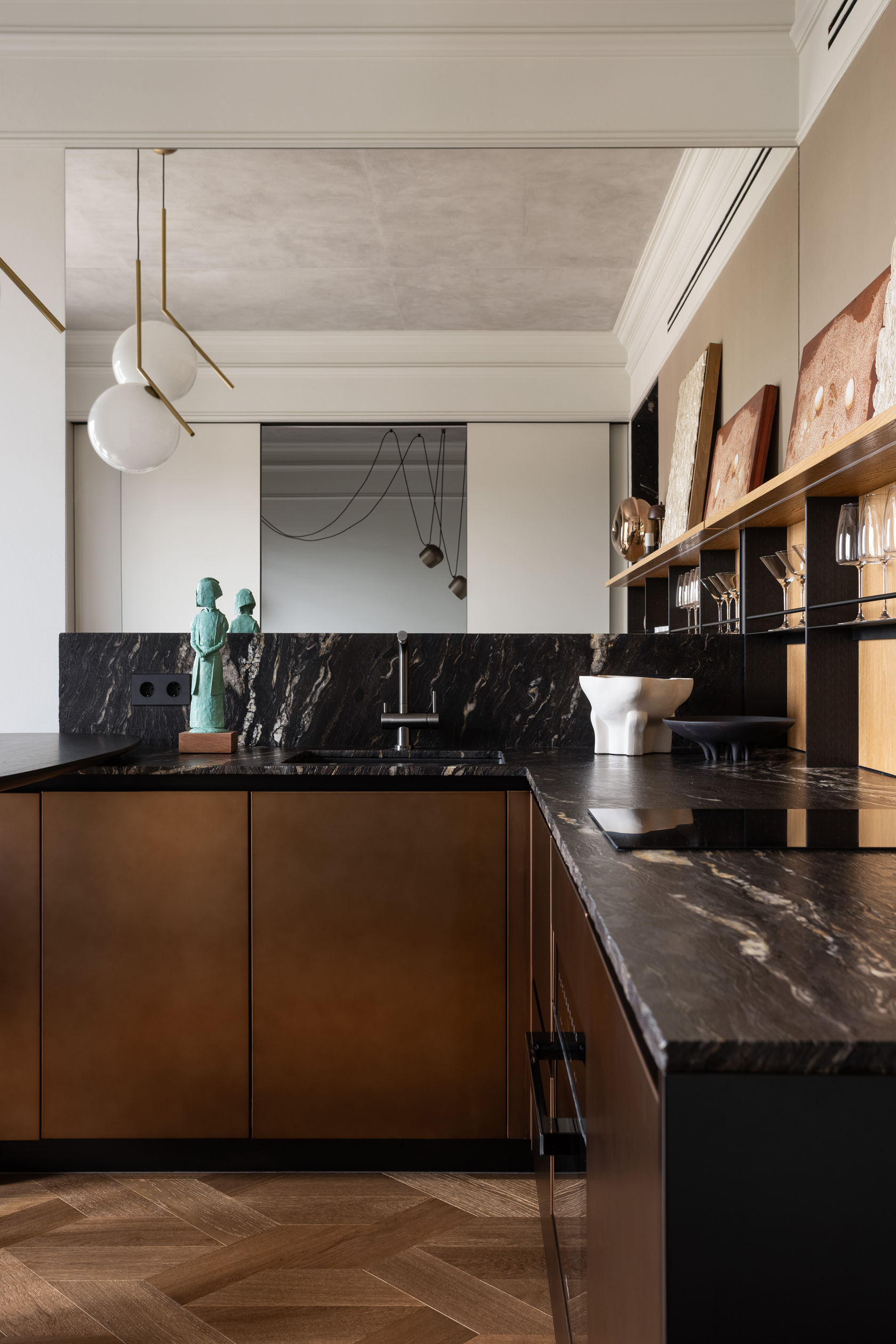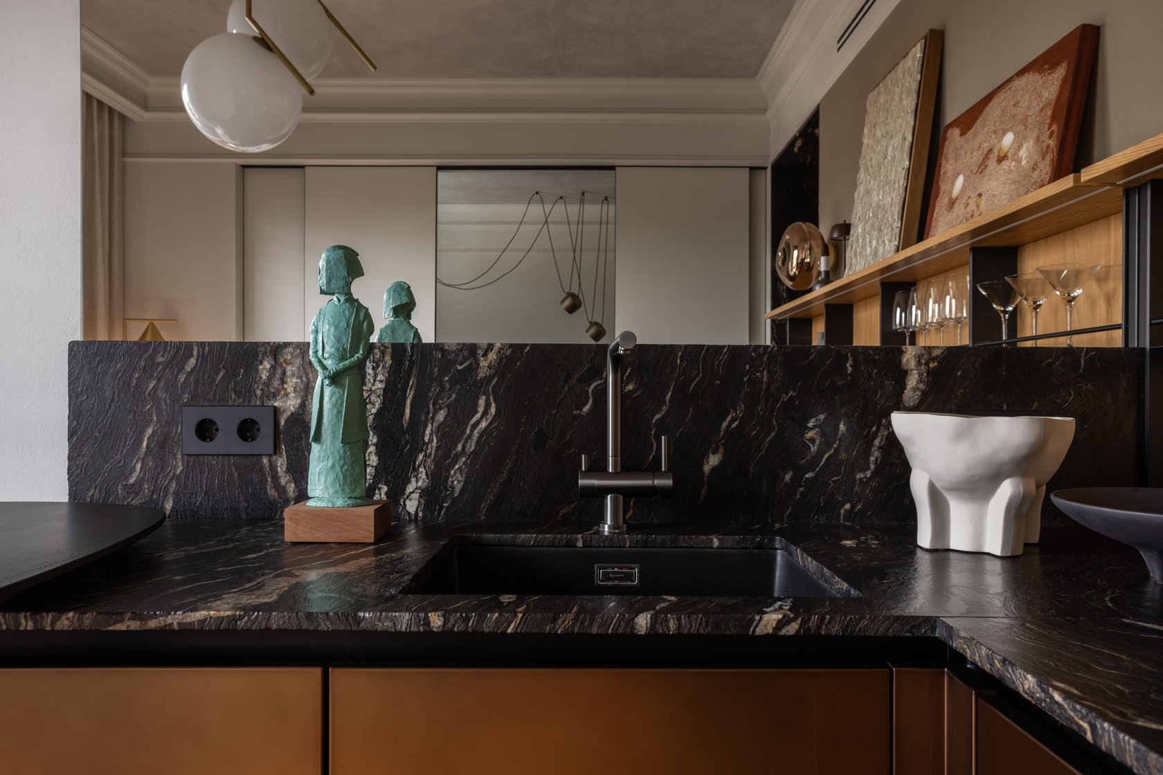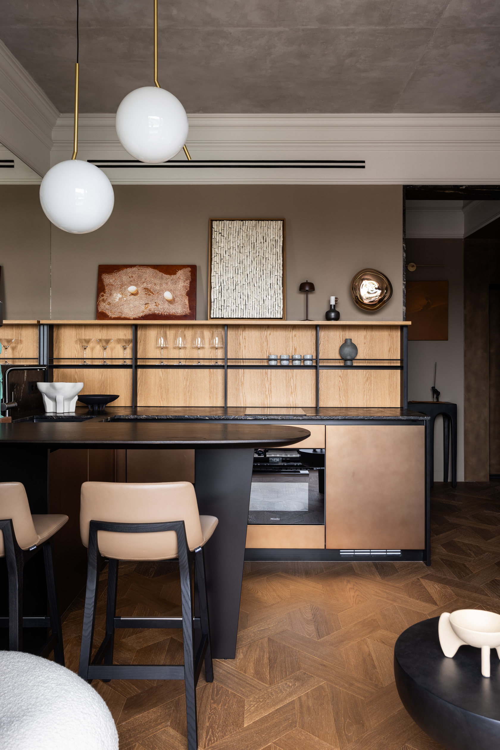 Кухонная зона оформлена в стиле современного арт-деко с элементами неоклассики. U-образная планировка продумана до мелочей: рабочий треугольник (мойка – варочная панель – холодильник) обеспечивает максимальную эргономику и экономию движений. Фасады шкафов выполнены из матового МДФ с мягким сатиновым покрытием, визуально тёплым и тактильно приятным. Рабочие поверхности облицованы чёрным мрамором с белыми прожилками, придающим глубину и статус. Центральный остров акцентирован рифлёными панелями под натуральное дерево и увенчан мраморной столешницей.