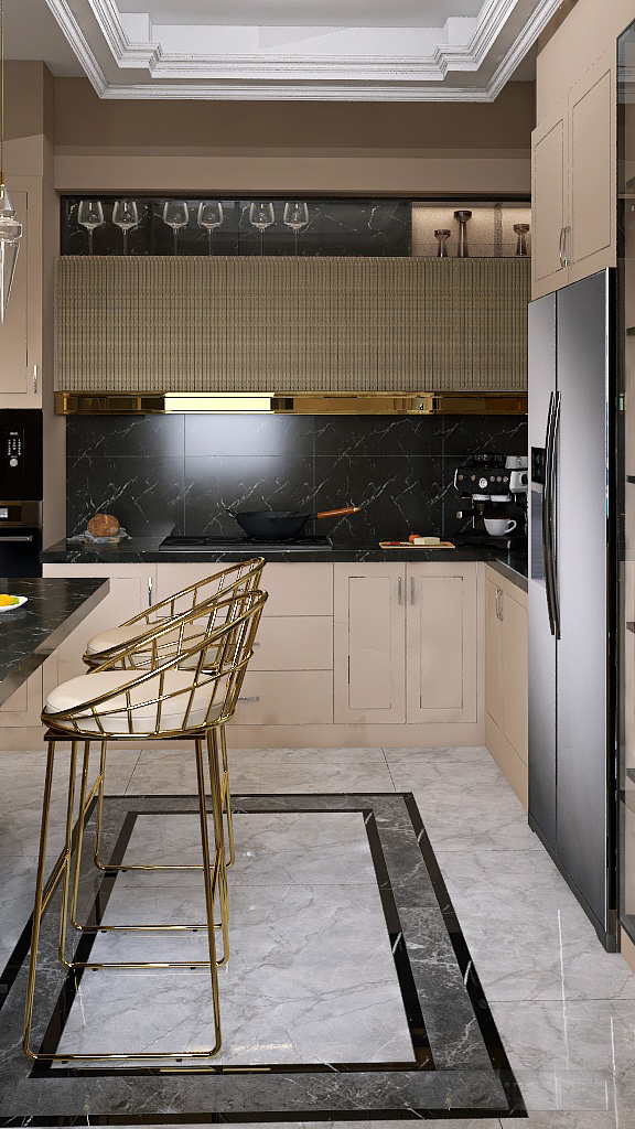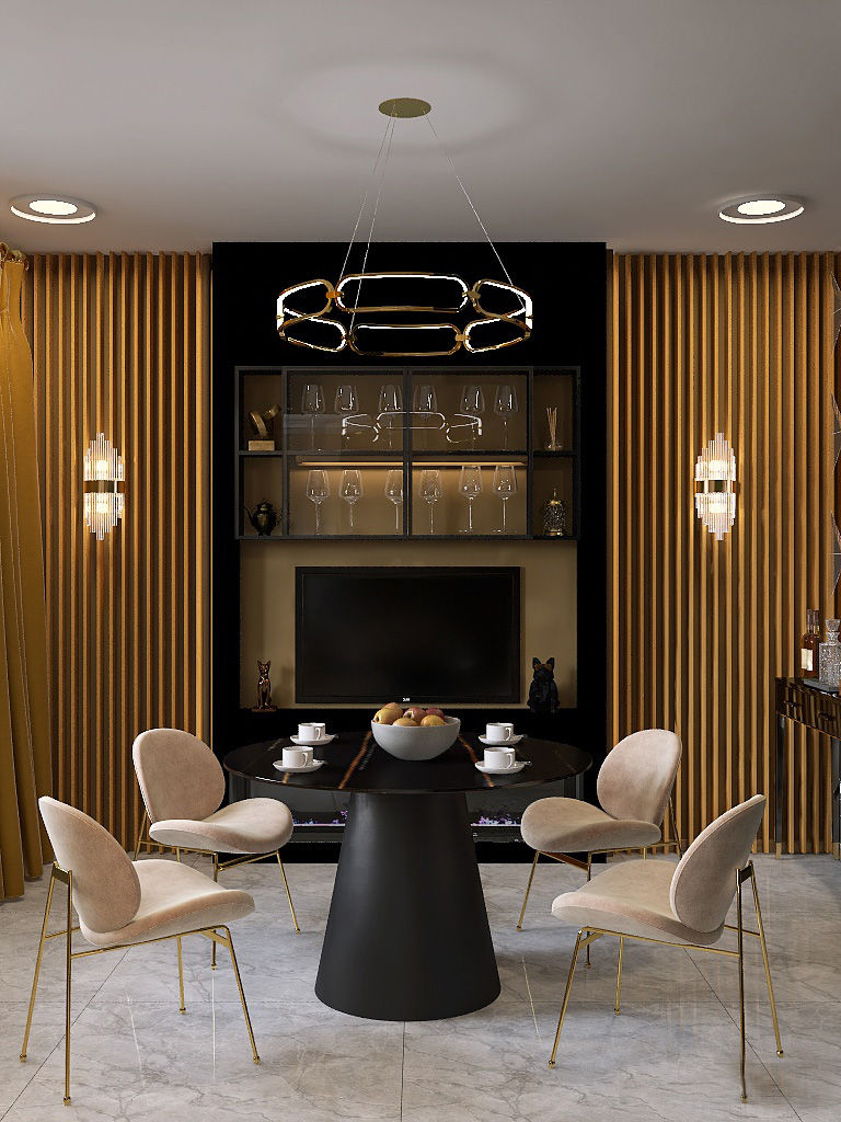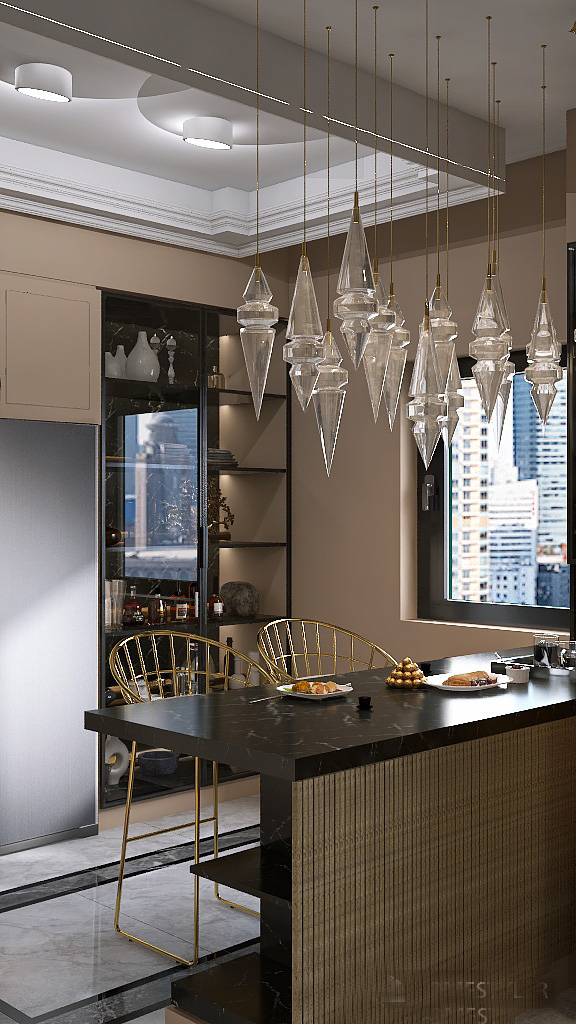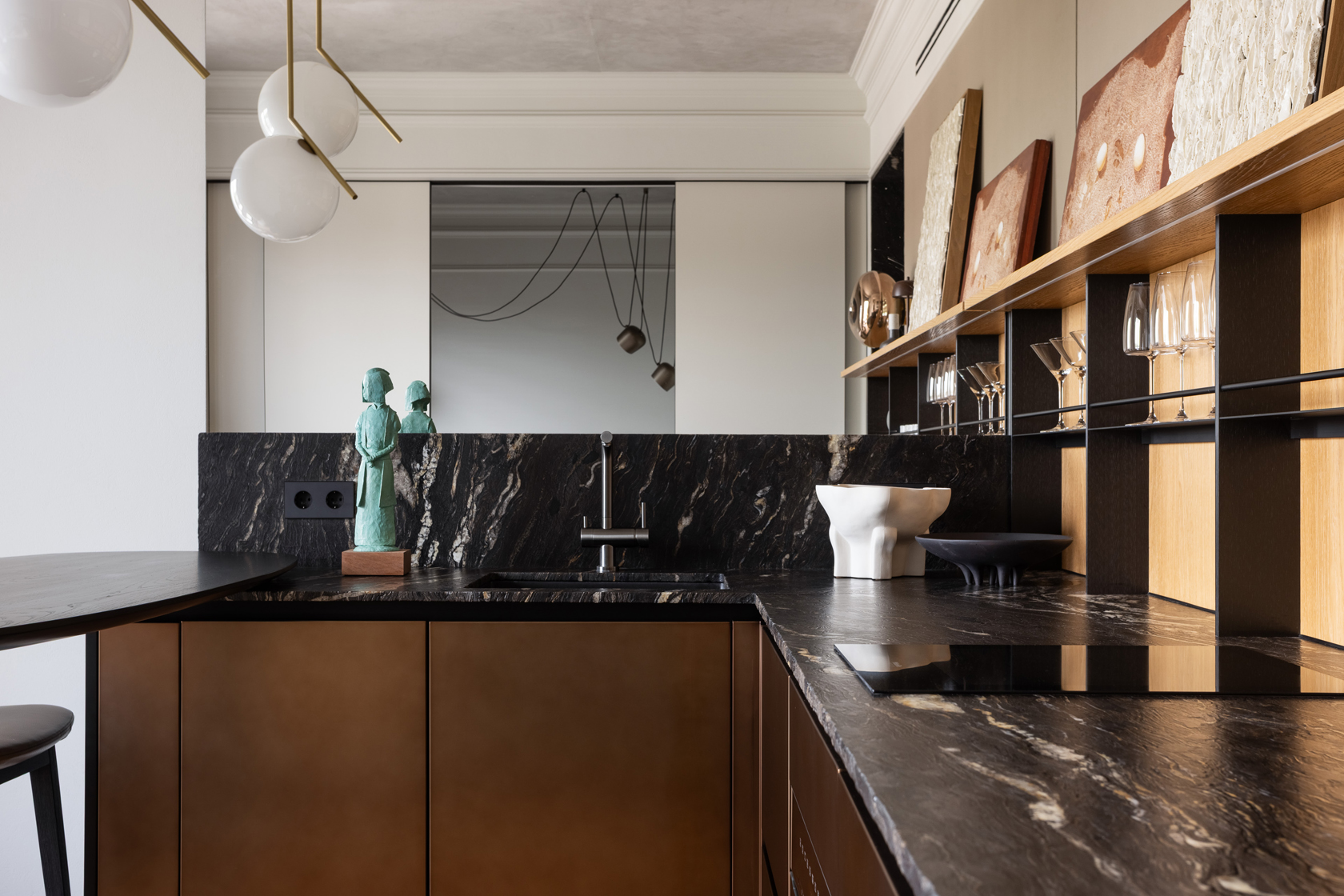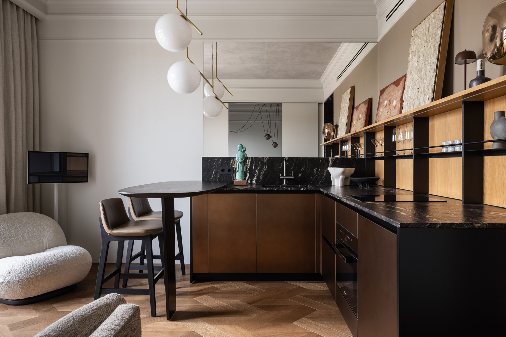 Кухонная зона оформлена в стиле современного арт-деко с элементами неоклассики. U-образная планировка продумана до мелочей: рабочий треугольник (мойка – варочная панель – холодильник) обеспечивает максимальную эргономику и экономию движений. Фасады шкафов выполнены из матового МДФ с мягким сатиновым покрытием, визуально тёплым и тактильно приятным. Рабочие поверхности облицованы чёрным мрамором с белыми прожилками, придающим глубину и статус. Центральный остров акцентирован рифлёными панелями под натуральное дерево и увенчан мраморной столешницей.