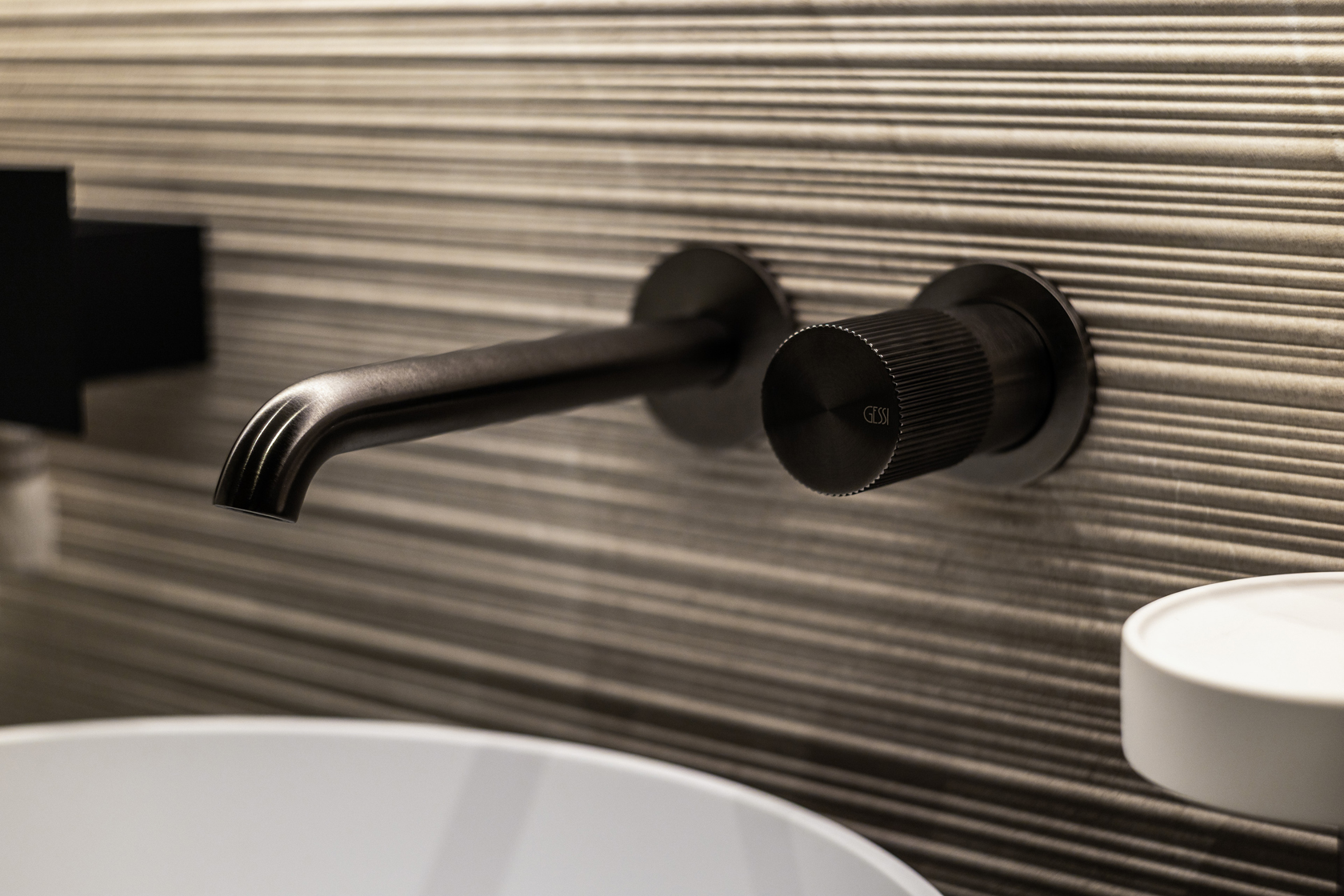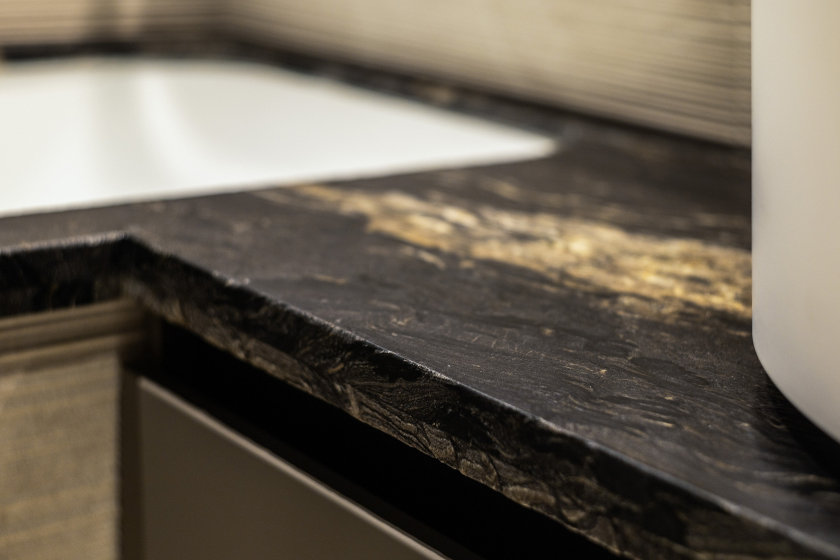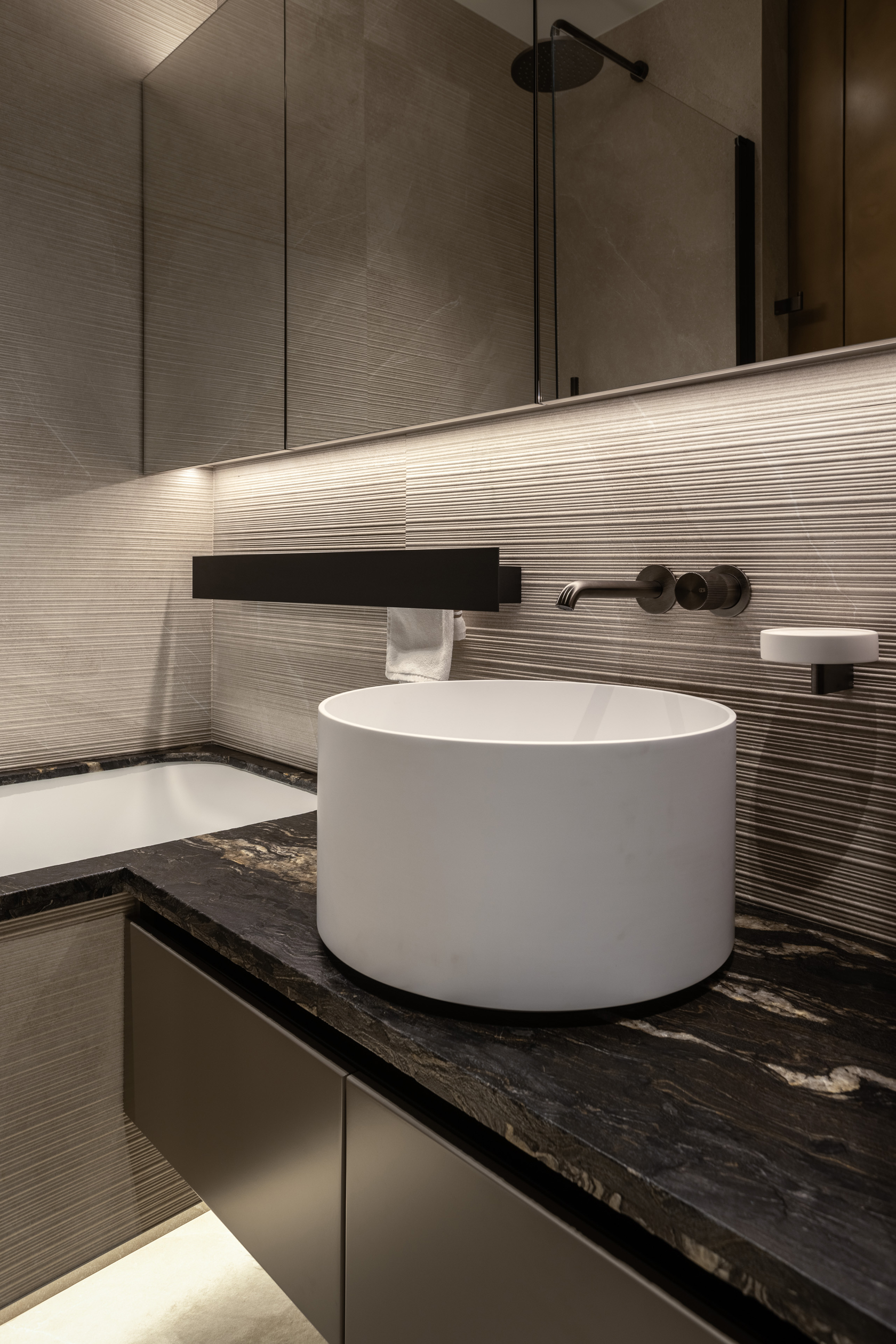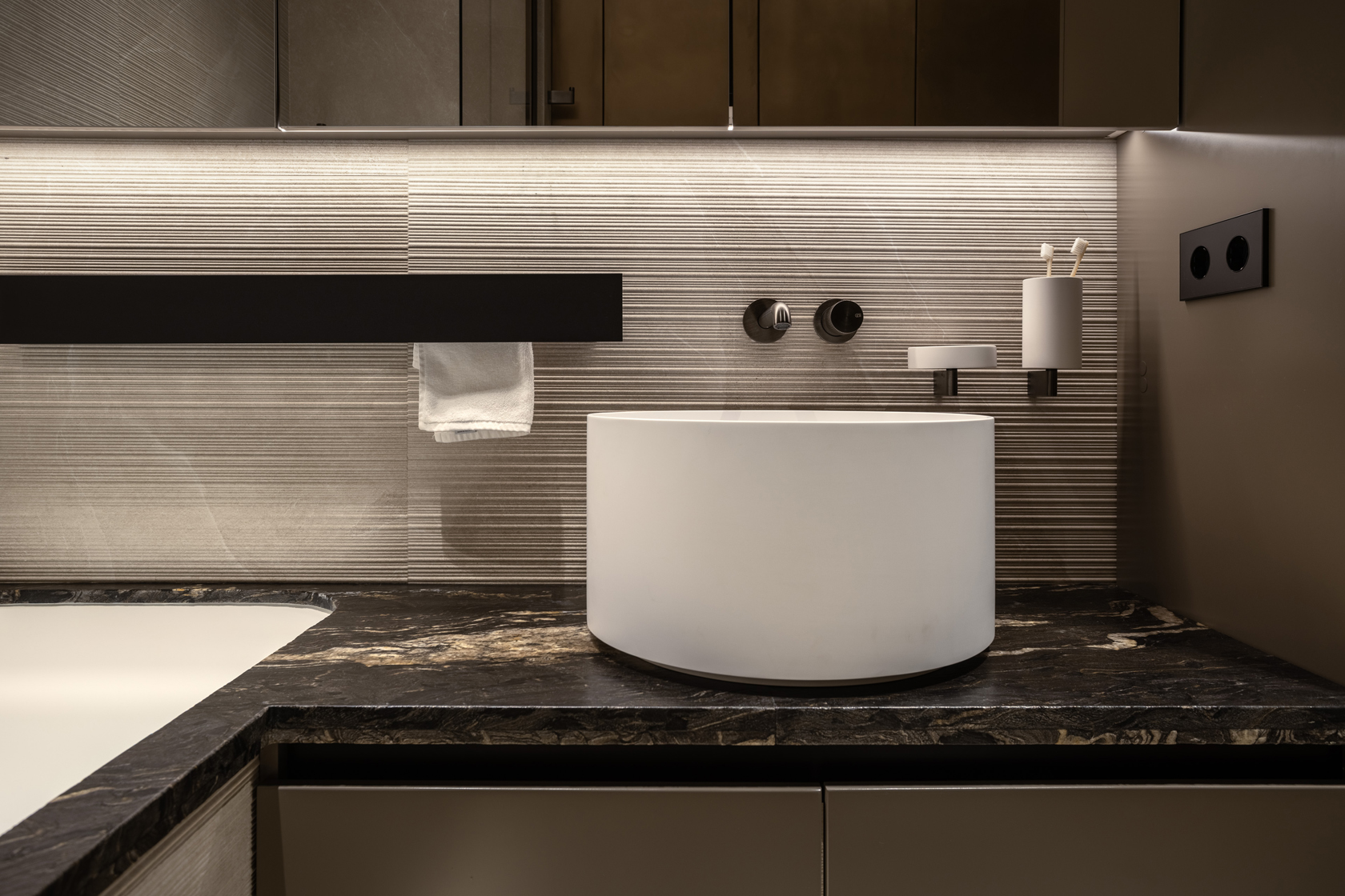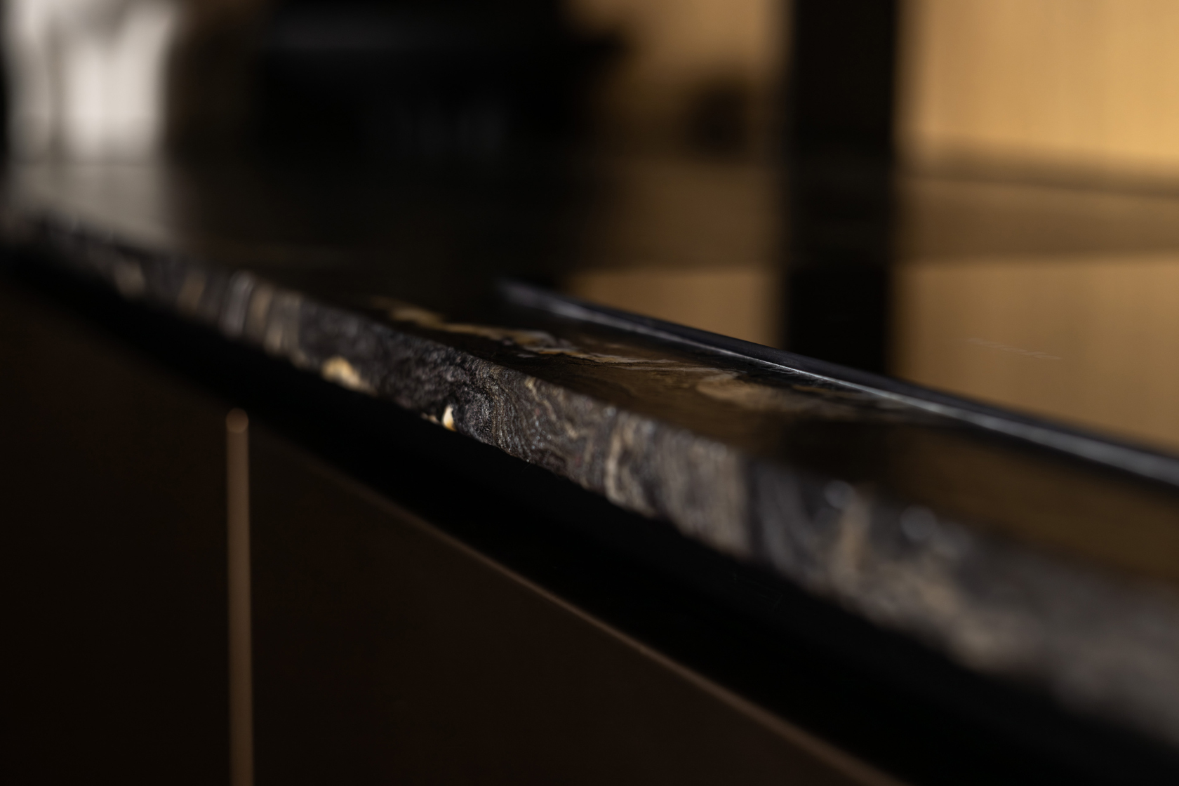Кухонная зона оформлена в стиле современного арт-деко с элементами неоклассики. U-образная планировка продумана до мелочей: рабочий треугольник (мойка – варочная панель – холодильник) обеспечивает максимальную эргономику и экономию движений. Фасады шкафов выполнены из матового МДФ с мягким сатиновым покрытием, визуально тёплым и тактильно приятным. Рабочие поверхности облицованы чёрным мрамором с белыми прожилками, придающим глубину и статус. Центральный остров акцентирован рифлёными панелями под натуральное дерево и увенчан мраморной столешницей.