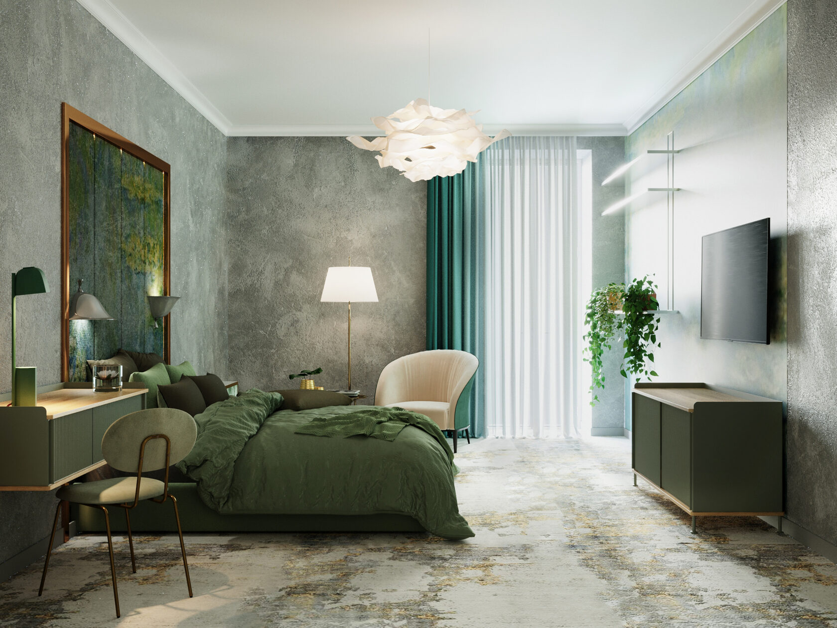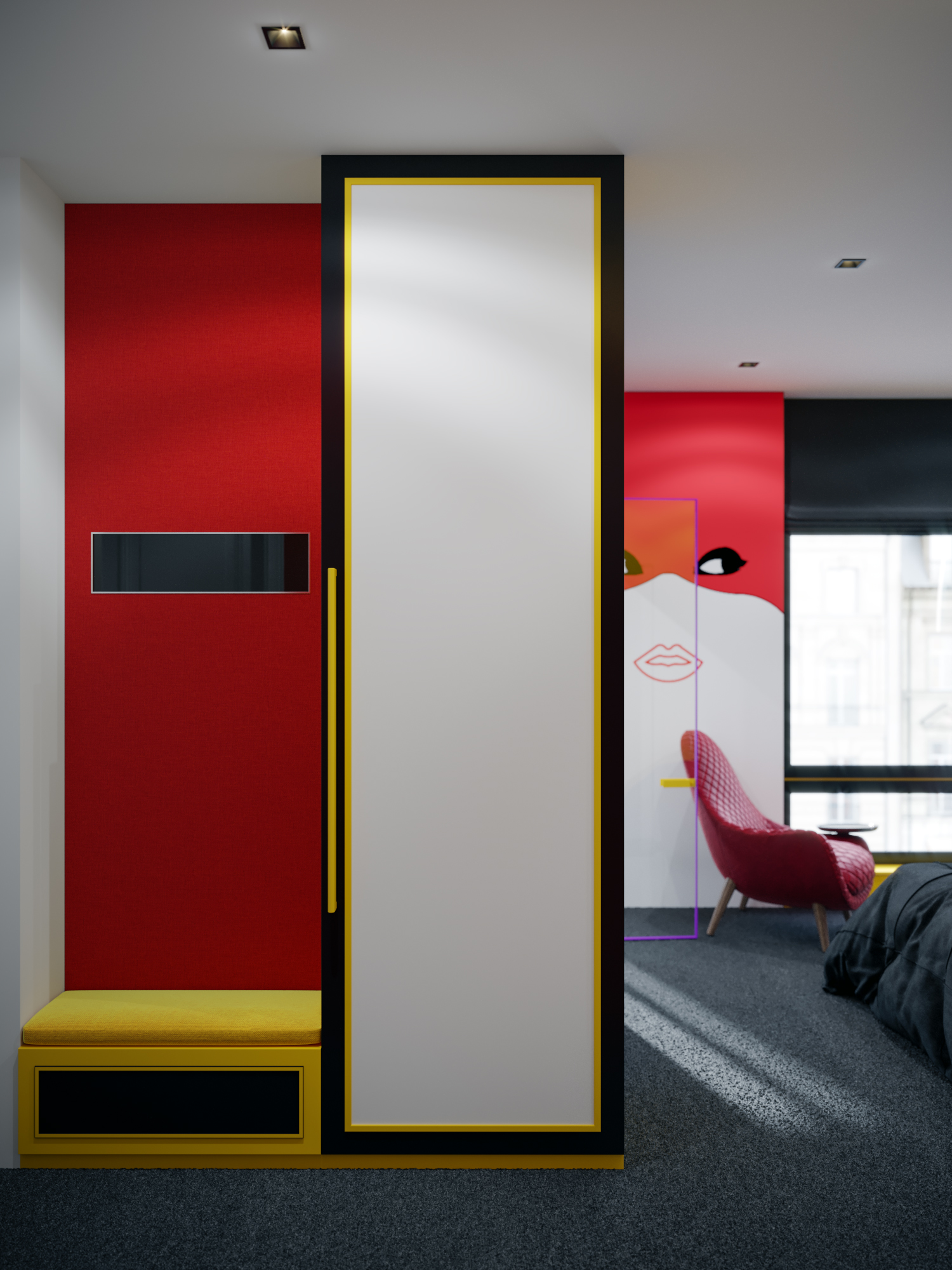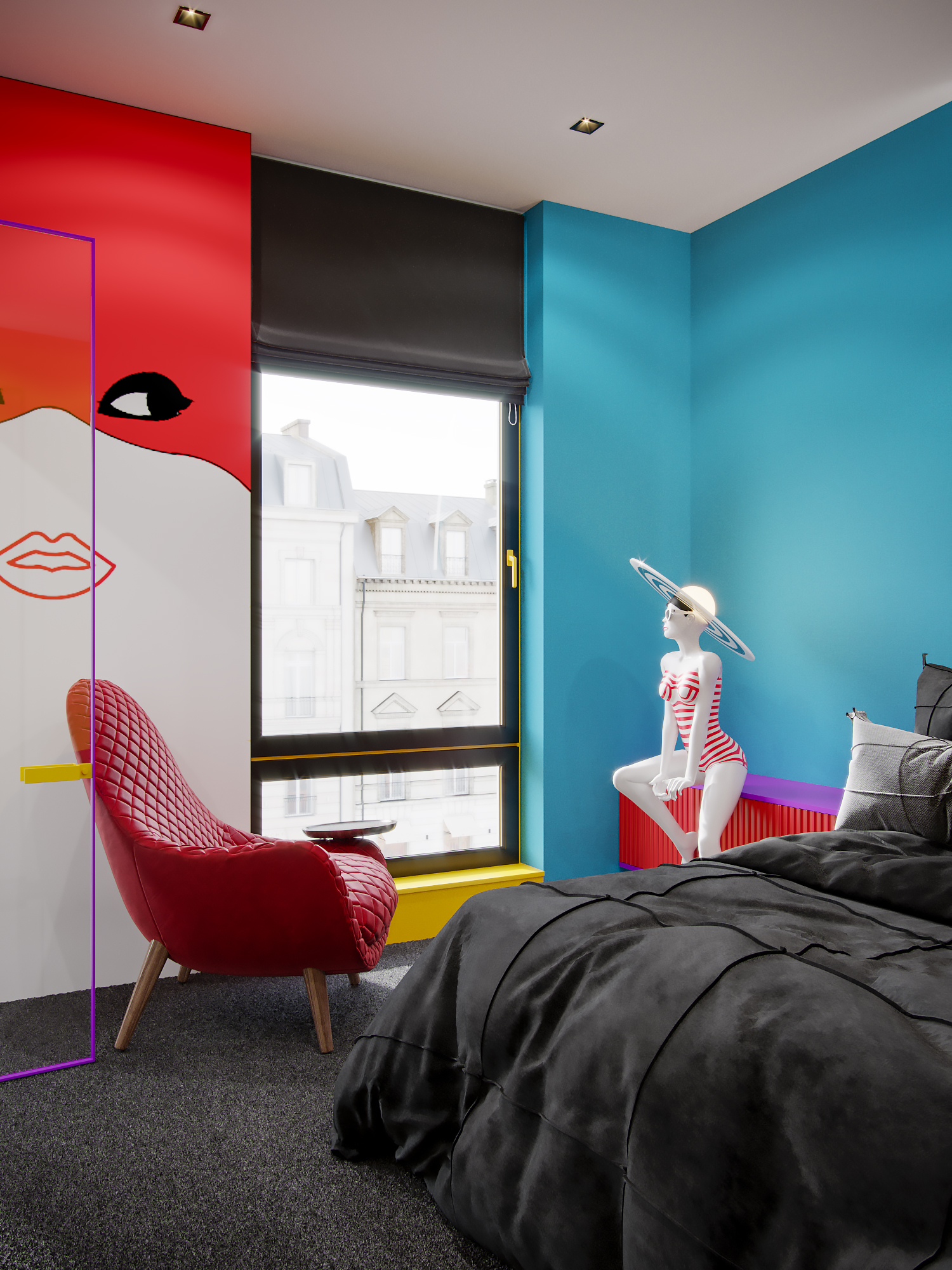 Концепция: Основная концепция проекта — создание архитектурно-художественной среды, где гости не просто проживают, но становятся частью произведения искусства, взаимодействуя с интерьером на глубоком эмоциональном и интеллектуальном уровне. Эта идея реализована через индивидуальную стилизацию каждого пространства под работы конкретных художников, с акцентом на их уникальную палитру, формы и философию: