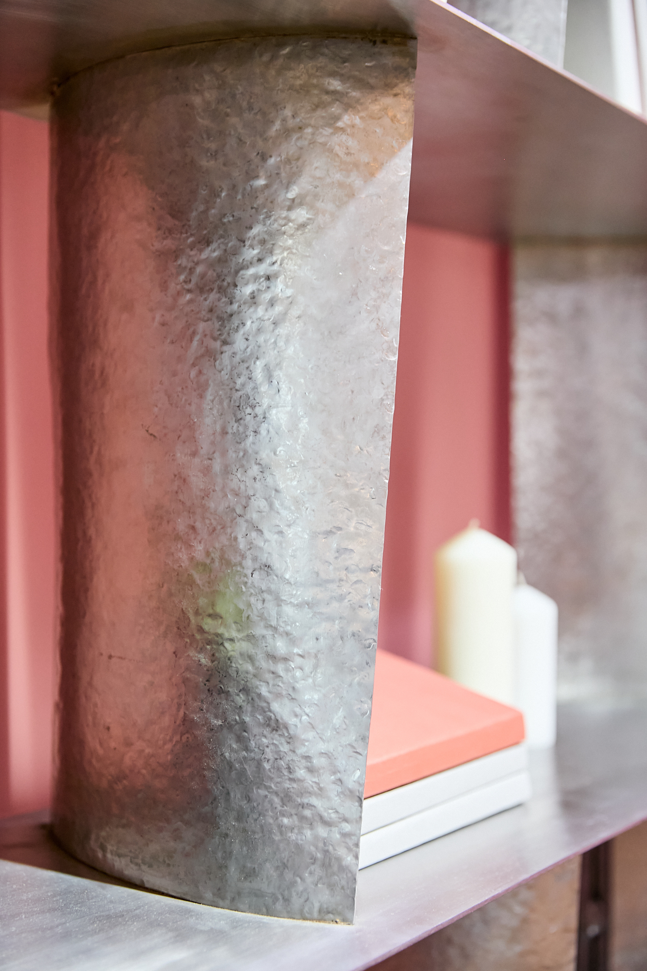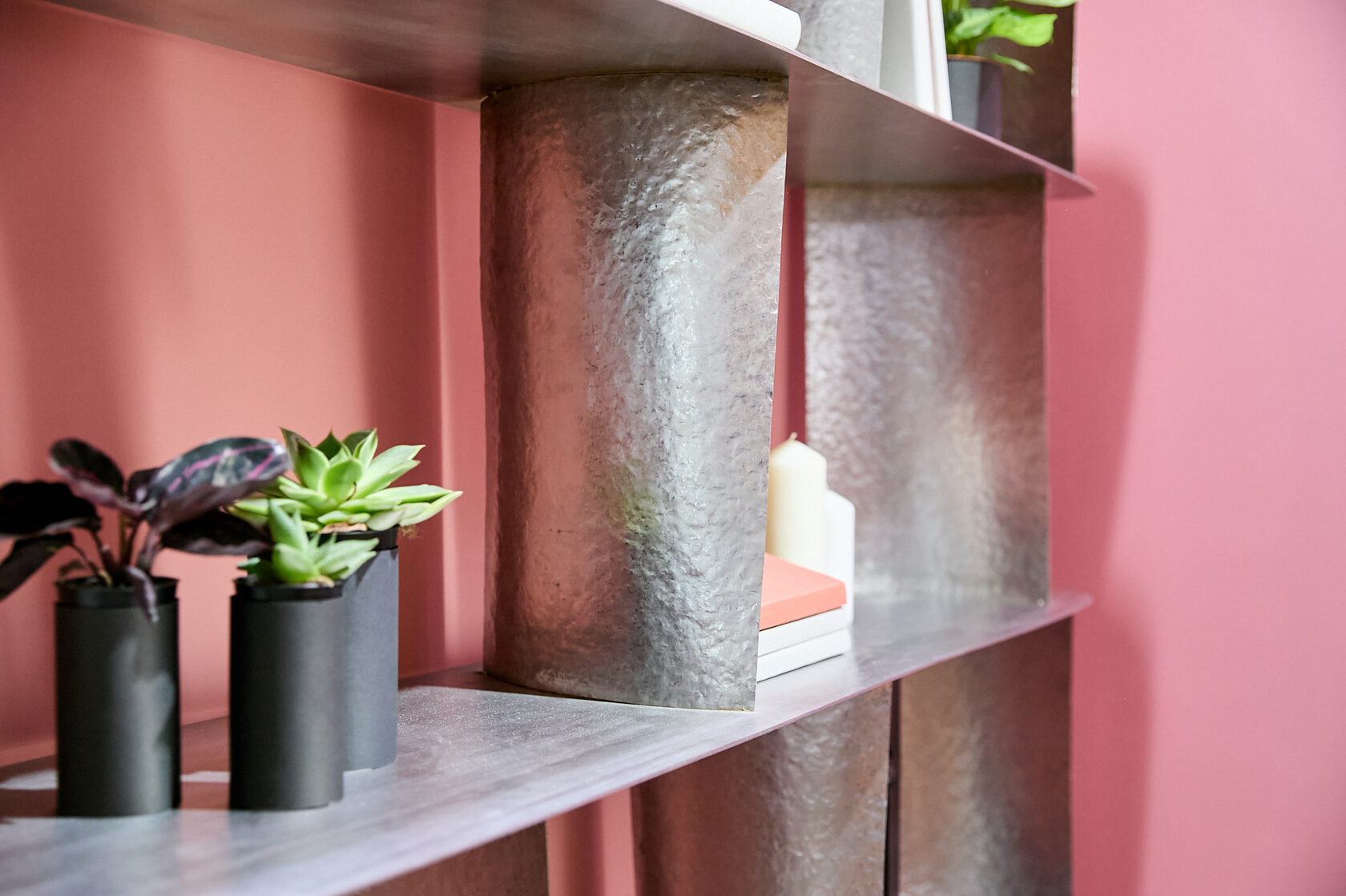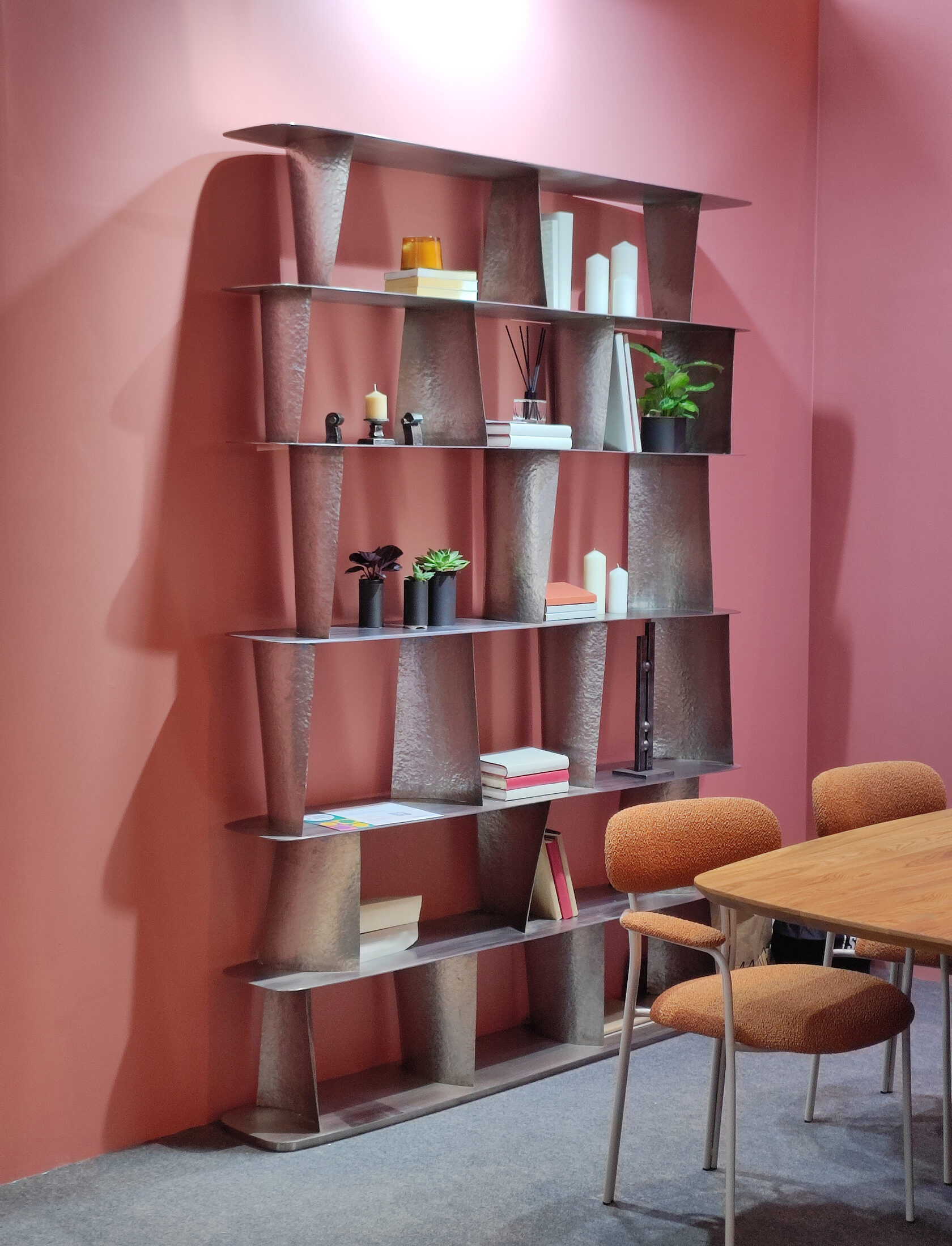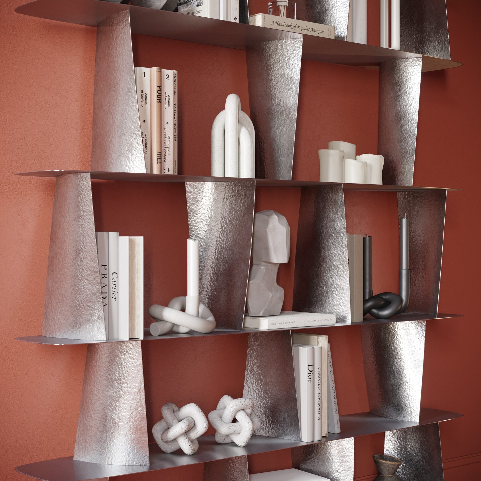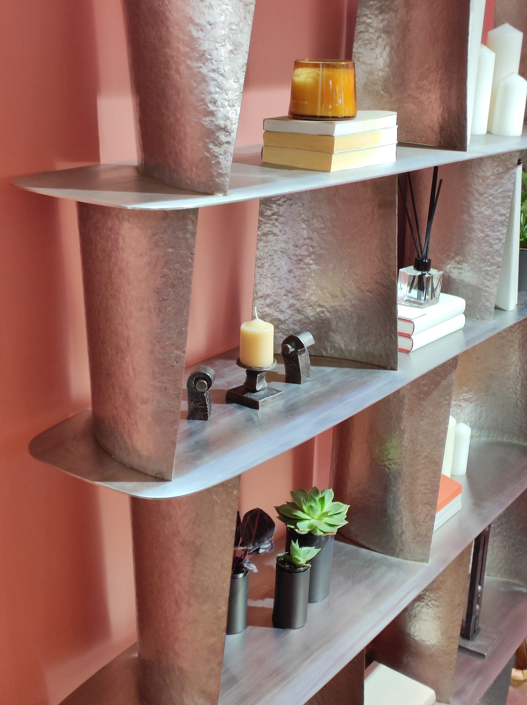 Концепция: Ключевая идея — трансформация функциональной системы хранения в выразительное украшение стены. В основе лежит визуальная метафора волны, воплощенная в металлических воланах, переходящих в полки. Особое внимание уделено фактуре: состаренный металл подчеркивает брутальность, а внутреннее наполнение с 'цветом пламени' добавляет глубину, идеально соответствуя атмосфере кабинета сильного мужчины.