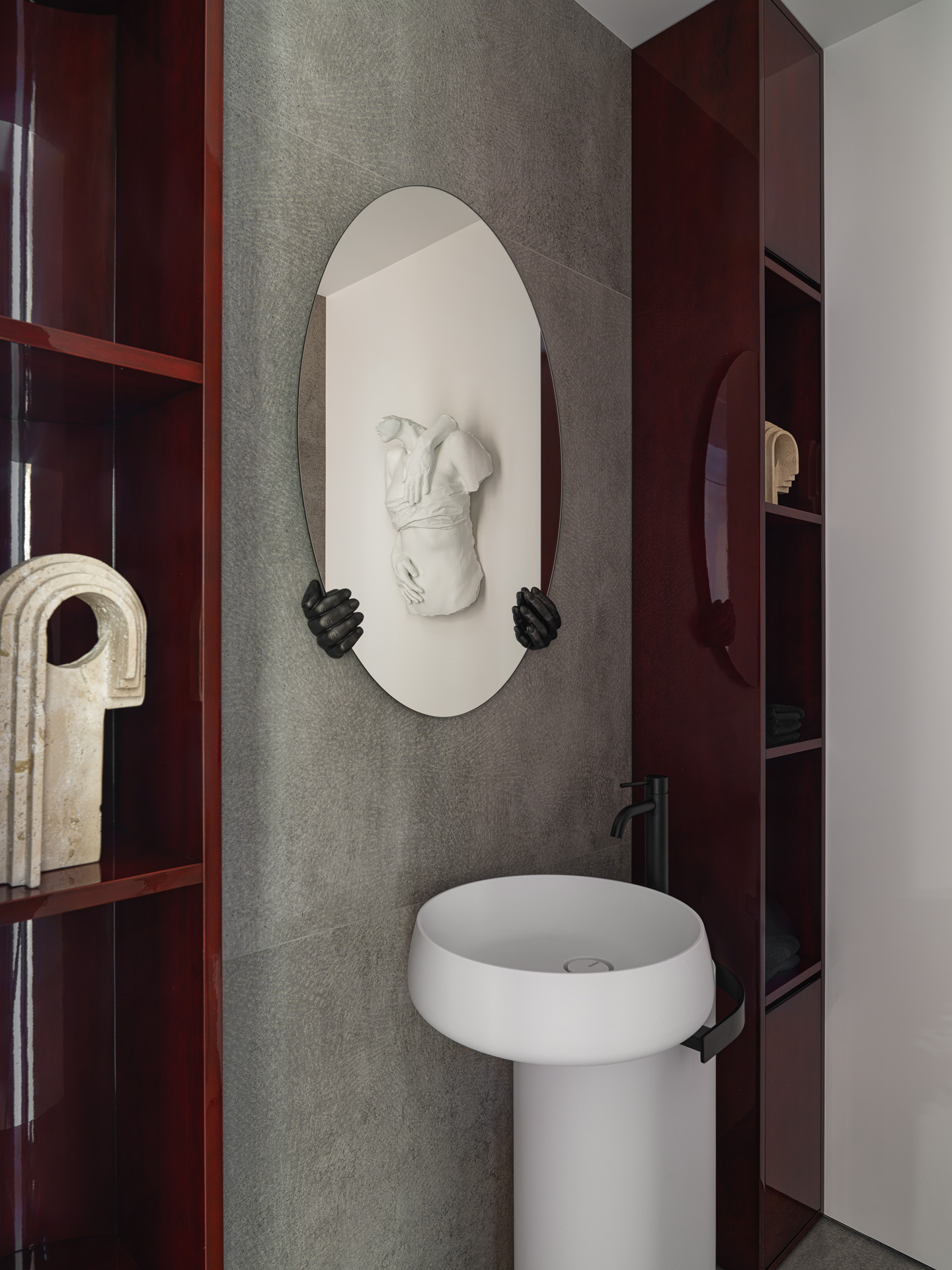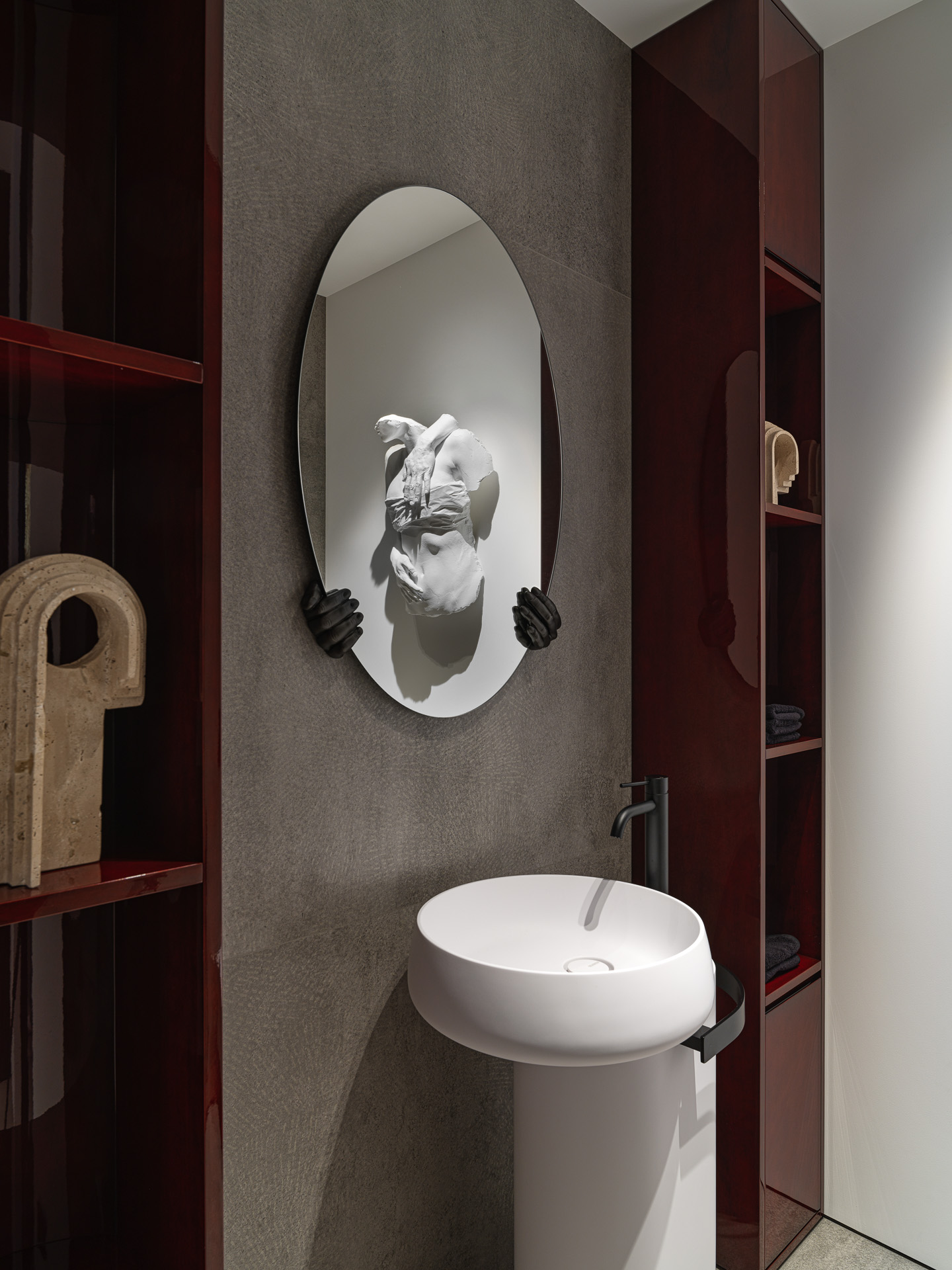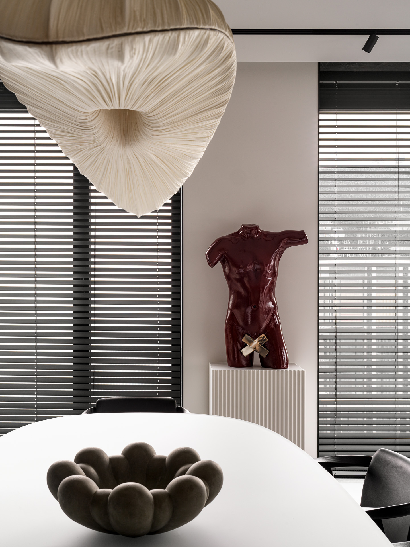 Особое внимание привлекает мужской торс в гостиной — слепок с реального человека, который задал тон всей концепции.