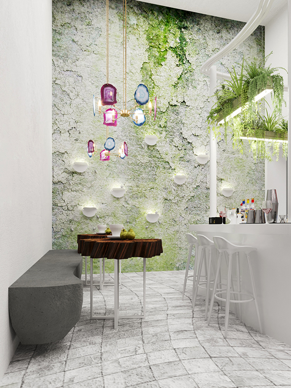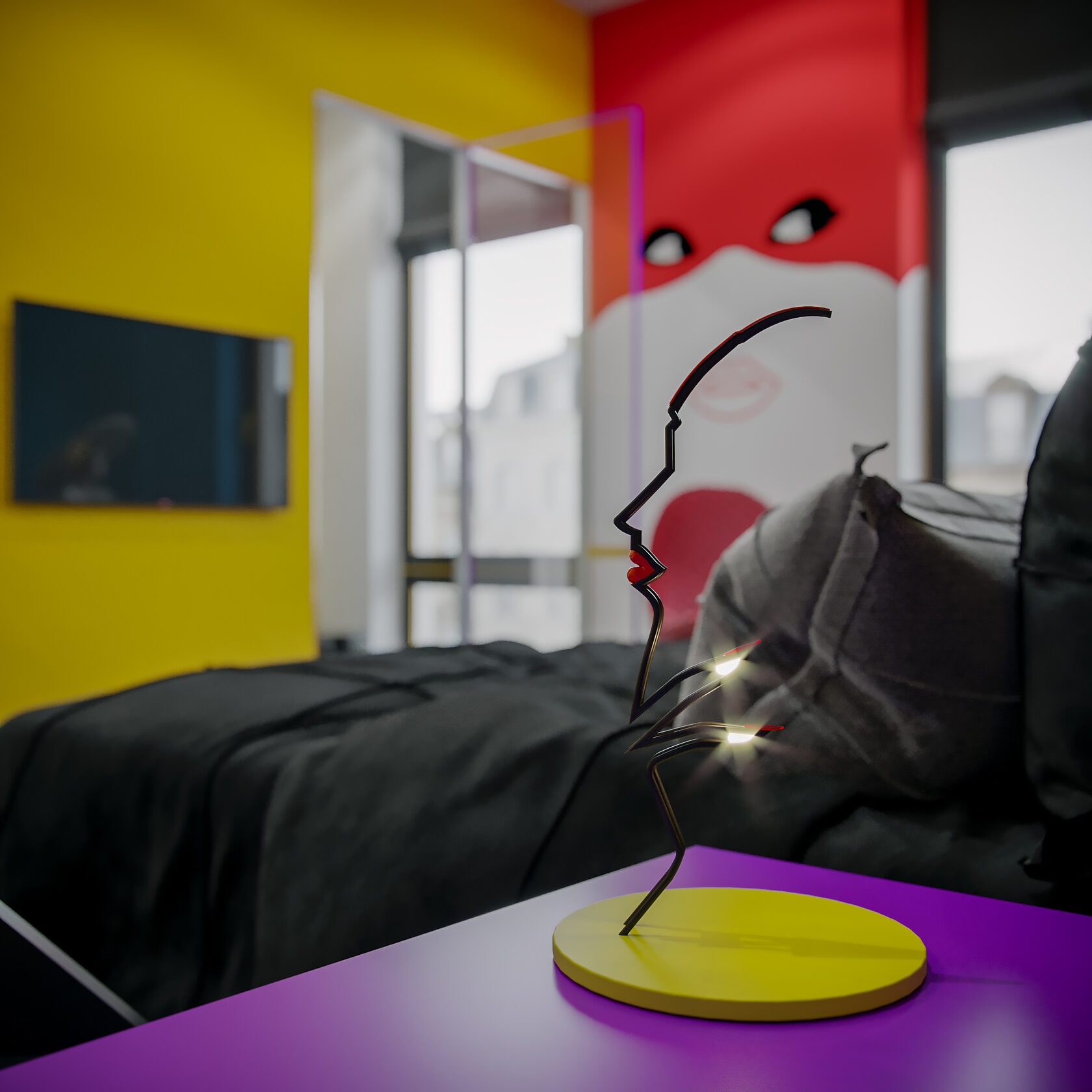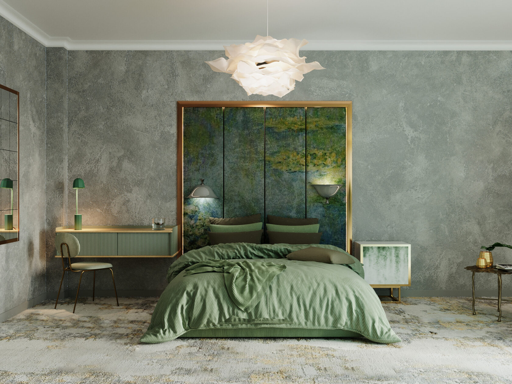* **Номер "Клод Моне":** Отражает импрессионистическую эстетику картины "Кувшинки". Дизайн создает ощущение полного погружения в водную гладь и прибрежную растительность через болотно-травяную цветовую гамму, использование микроцемента, имитирующего холст, и аффрески. Световые инсталляции в виде парящих бутонов FJER, мебель в природной стилистике (кресло Liz Expormim, кровать Restoration Hardware) и живые растения на "мостиках-полках" завершают образ единства с природой. * **Номер "Малика Фавр":** Посвящен графическому минимализму и яркой эксцентричности французской художницы. Интерьер отличают индивидуально разработанные элементы, где каждый предмет мебели и декора — от торшера с LED-пальцами до шкафа с ручками в виде рук — является отсылкой к ее работам с оптическими иллюзиями и негативным пространством. Цветовая палитра яркая и контрастная, в духе "поп-арта с опт-артом", подчеркивает ее принцип "меньше — значит больше". * **Бар "Хундертвассер":** Пространство, пронизанное идеями эксцентричного австрийского архитектора и художника. Дизайн бара полностью отрицает прямые линии, используя органические формы и яркие цвета, характерные для его "лесных тропинок" и асимметричных фасадов. Барная стойка с нишами из оргстекла и акцентная стена из арт-бетона с зелеными вкраплениями, украшенная световыми бра Karman, вдохновлены его знаменитым домом в Вене и философским отношением к экологии и спиральным формам.