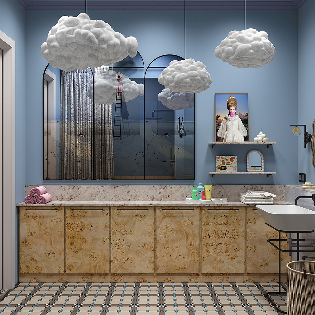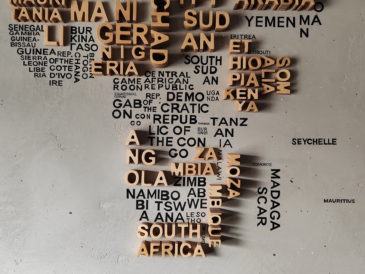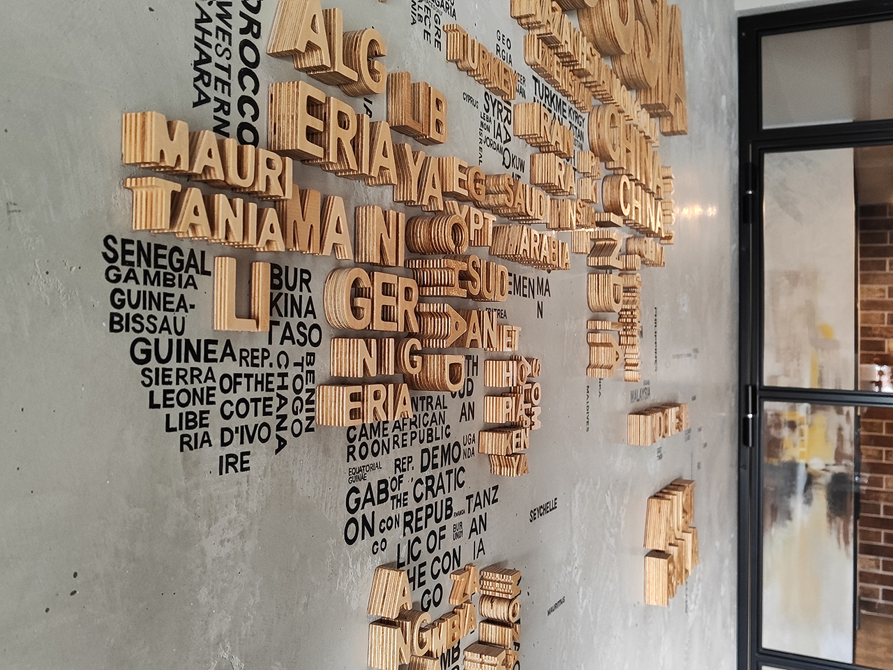 Концепция: Арт-объекты выполняют не только декоративную функцию, но и формируют эмоциональную и интеллектуальную среду. Абстрактные линии и формы создают ощущение движения, а деревянная «карта мира» в кабинете из букв разных размеров сочетает визуальный ритм, тактильность и образовательный аспект, органично дополняя общий интерьер.