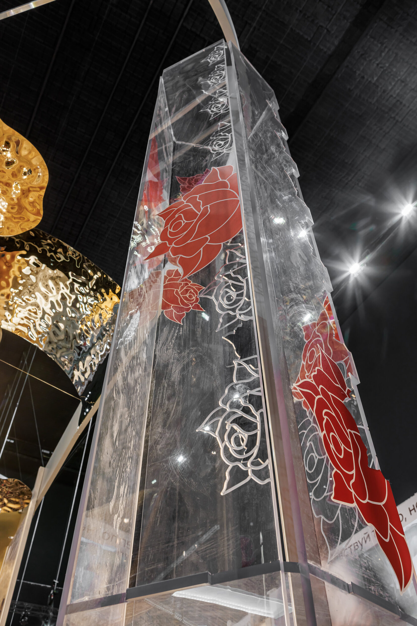 Концепция: Основная концепция проекта заключается в создании диалога между прошлым и будущим через форму и материал. Правильное пятигранное основание задает ритмичную структуру, а прозрачные ламели формируют легкий, постоянно меняющийся силуэт, взаимодействующий со светом и взглядом. Декоративный элемент в виде цветка, выполненный с применением вырубки, фрезеровки и ламинирования, демонстрирует передовые технологии обработки материала, обеспечивая уникальные световые эффекты и игру цвета. Монолитный поликарбонат, как основной материал, подчеркивает современность, безопасность, высокую прочность и отличную светопропускную способность решения.