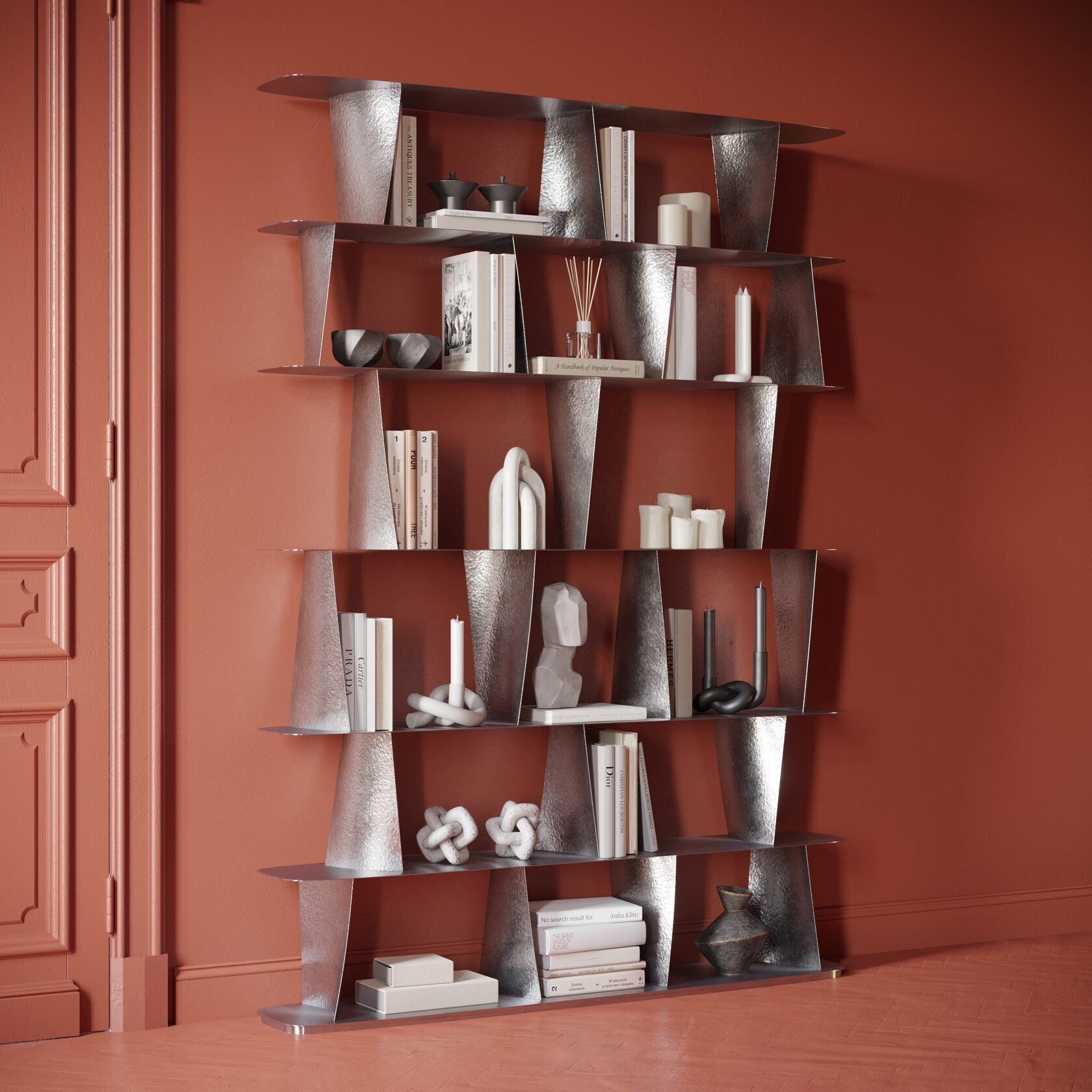 Концепция: Основная идея проекта — синтез функциональности и выразительной формы, черпающей вдохновение в высоких технологиях. Изогнутые вертикальные элементы, выполненные с использованием горячей ручной ковки, не только формируют узнаваемый силуэт, но и демонстрируют безупречное мастерство обработки металла. Проект предусматривает возможность изготовления стеллажа из различных металлов, что позволяет индивидуализировать изделие под конкретные интерьерные задачи и предпочтения заказчика.