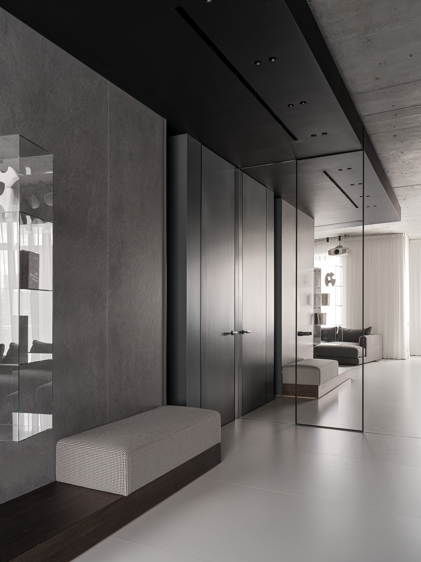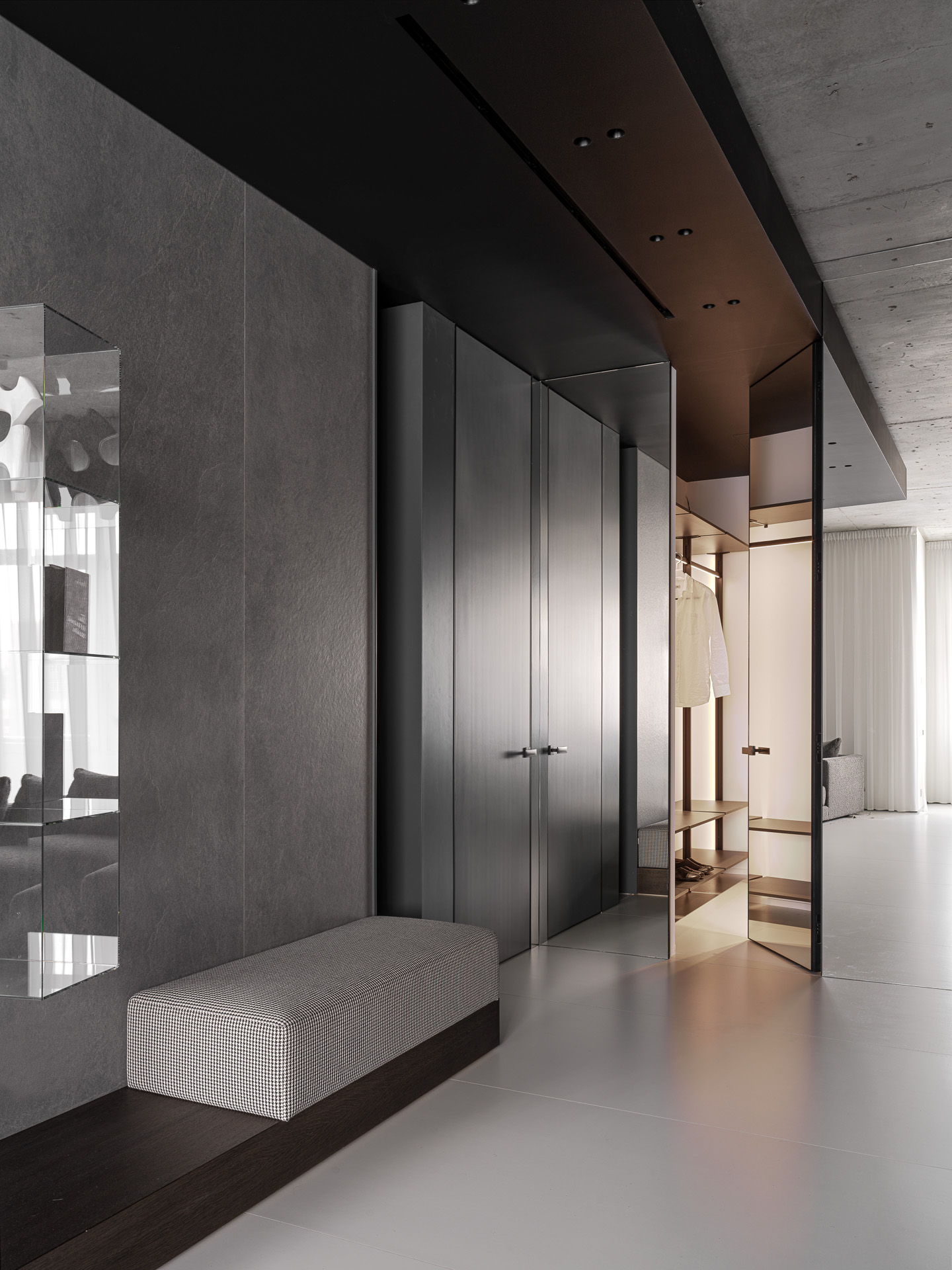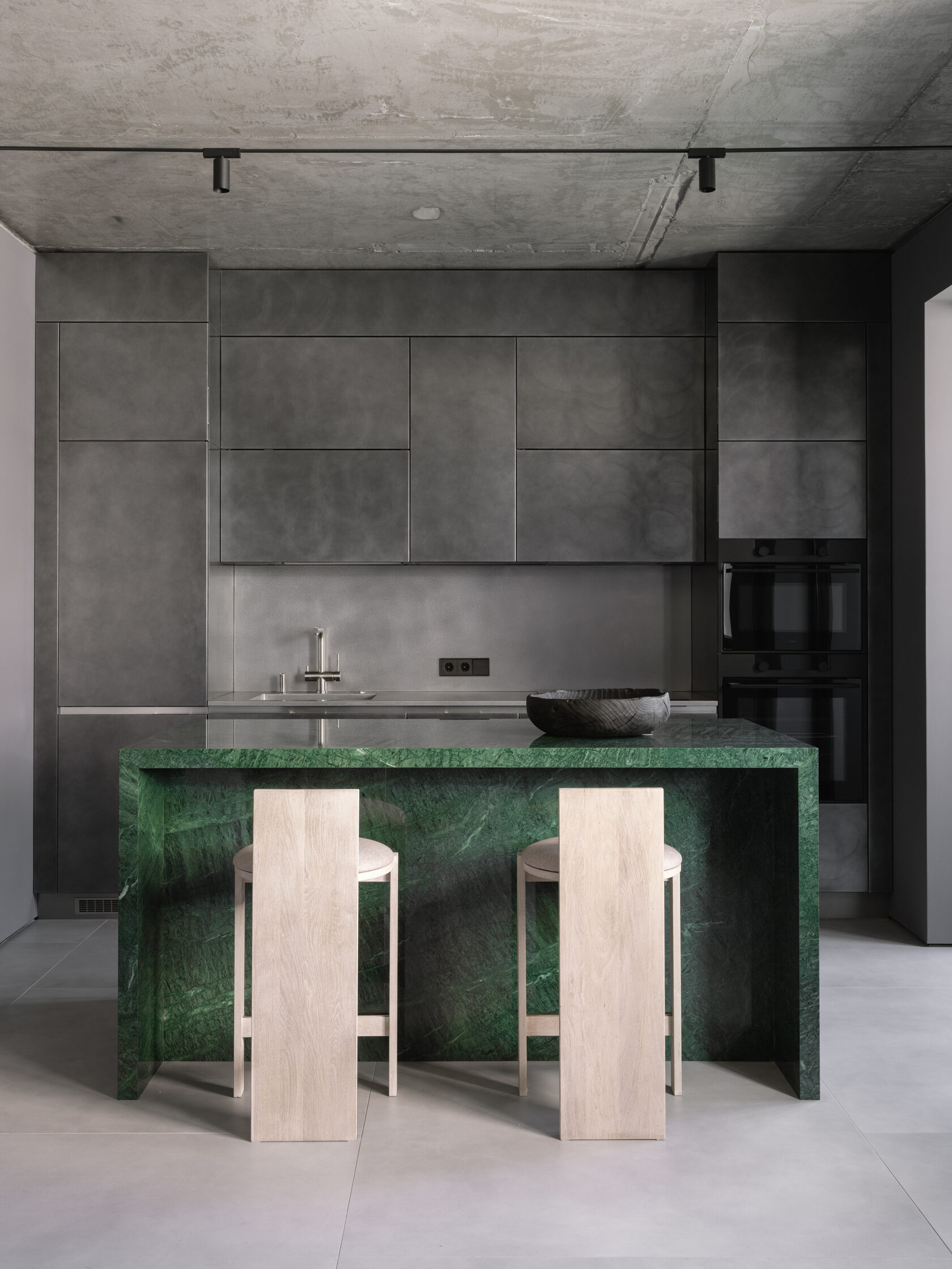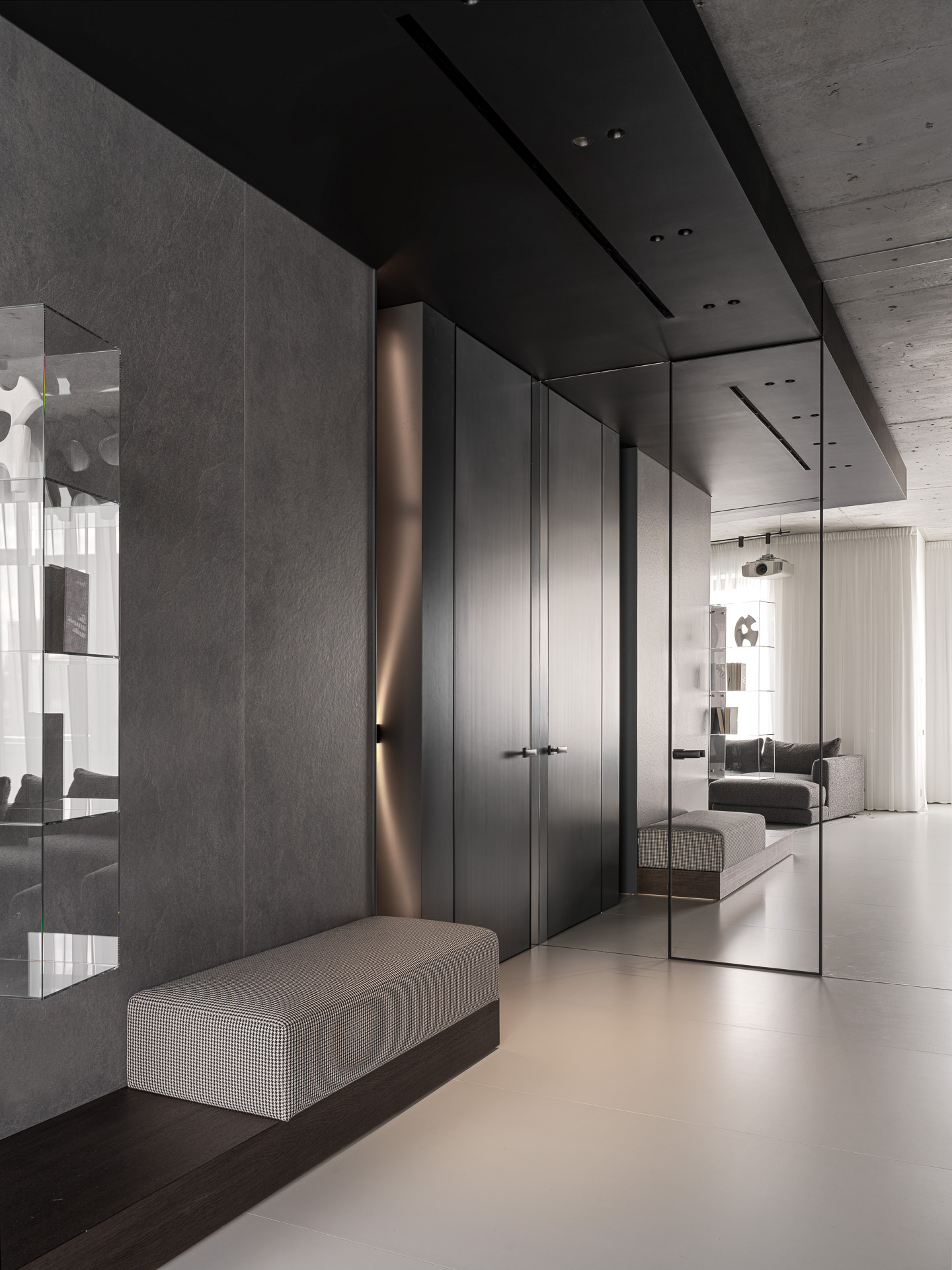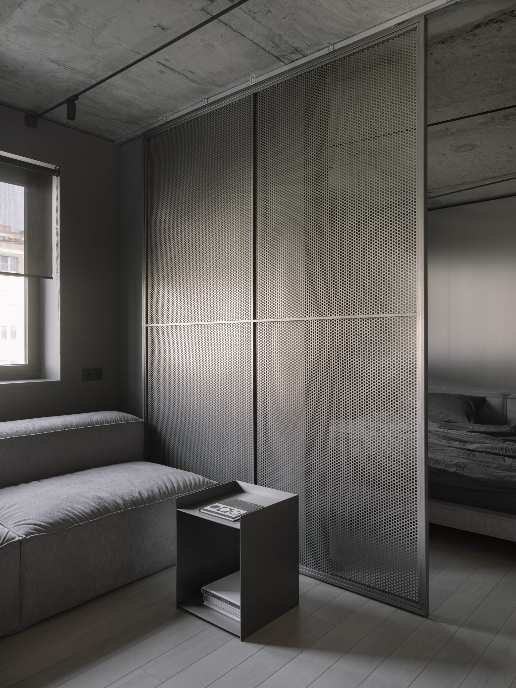 Концепция: Основная концепция — создание динамичного и функционального пространства, открытого к трансформации. Ключевыми элементами стали необычная гардеробная из прозрачного силикатного кирпича со световым потолком, создающим уникальные рефлексы, и смелое решение оставить потолочные плиты в их естественном, фактурном состоянии. Интерьер строится на гармонии сложных серых оттенков, дополненных акцентами малахитового зеленого мрамора. Пространство оптимизировано за счет скрытых систем хранения в ванной комнате, естественного освещения через матовое стекло и раздвижных перегородок из перфорированного металла, обеспечивающих гибкость планировки и визуальную легкость, перекликаясь с прозрачностью силикатного кирпича.