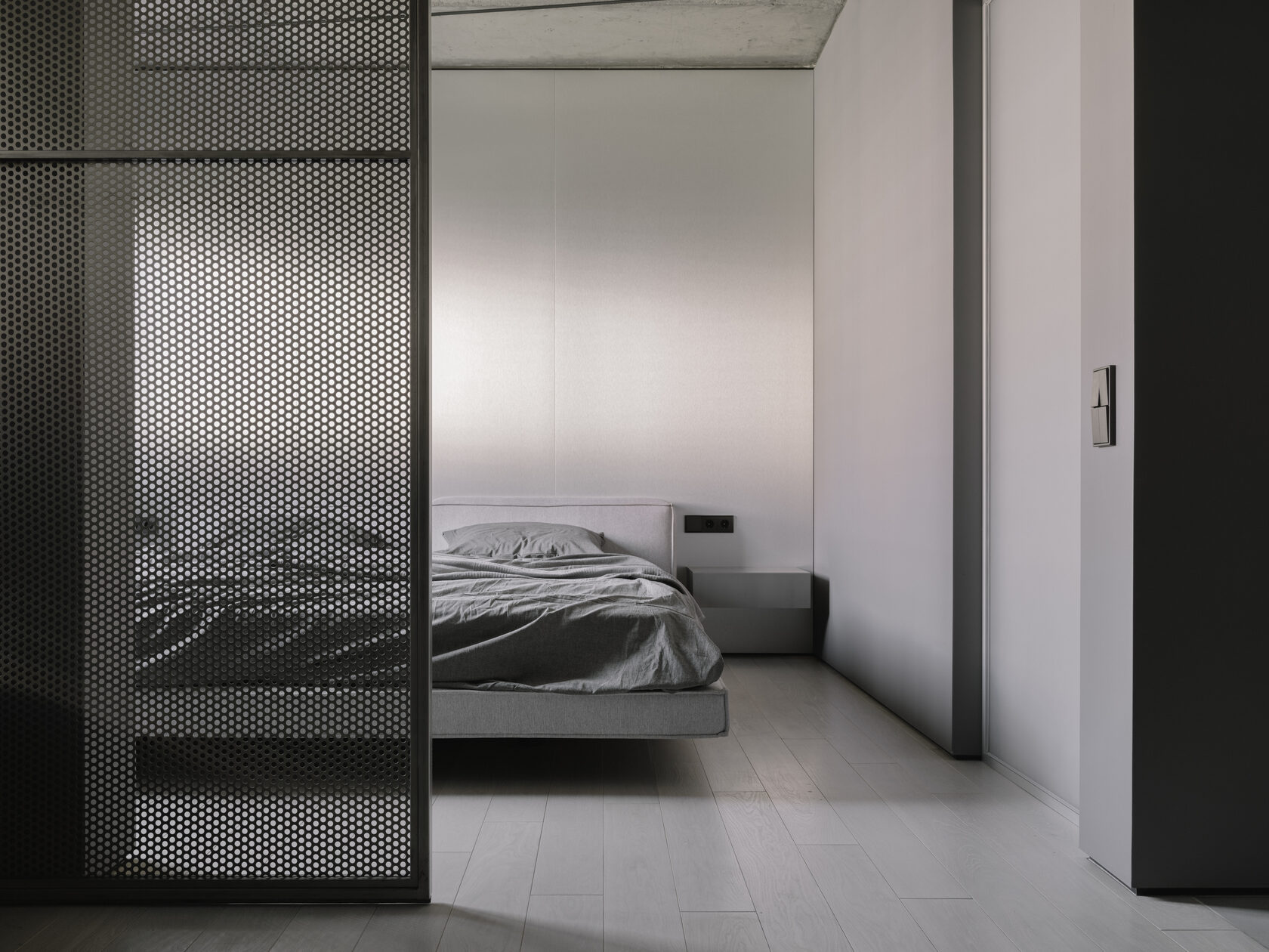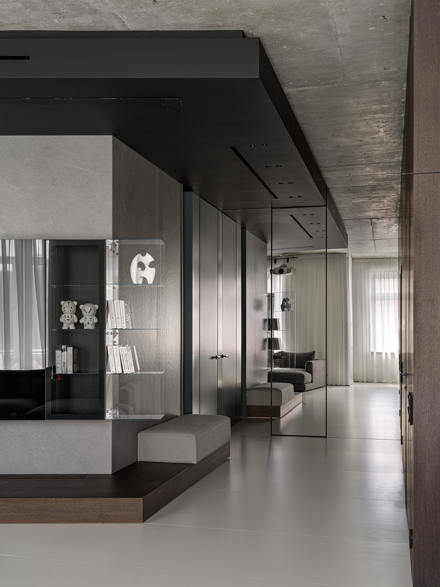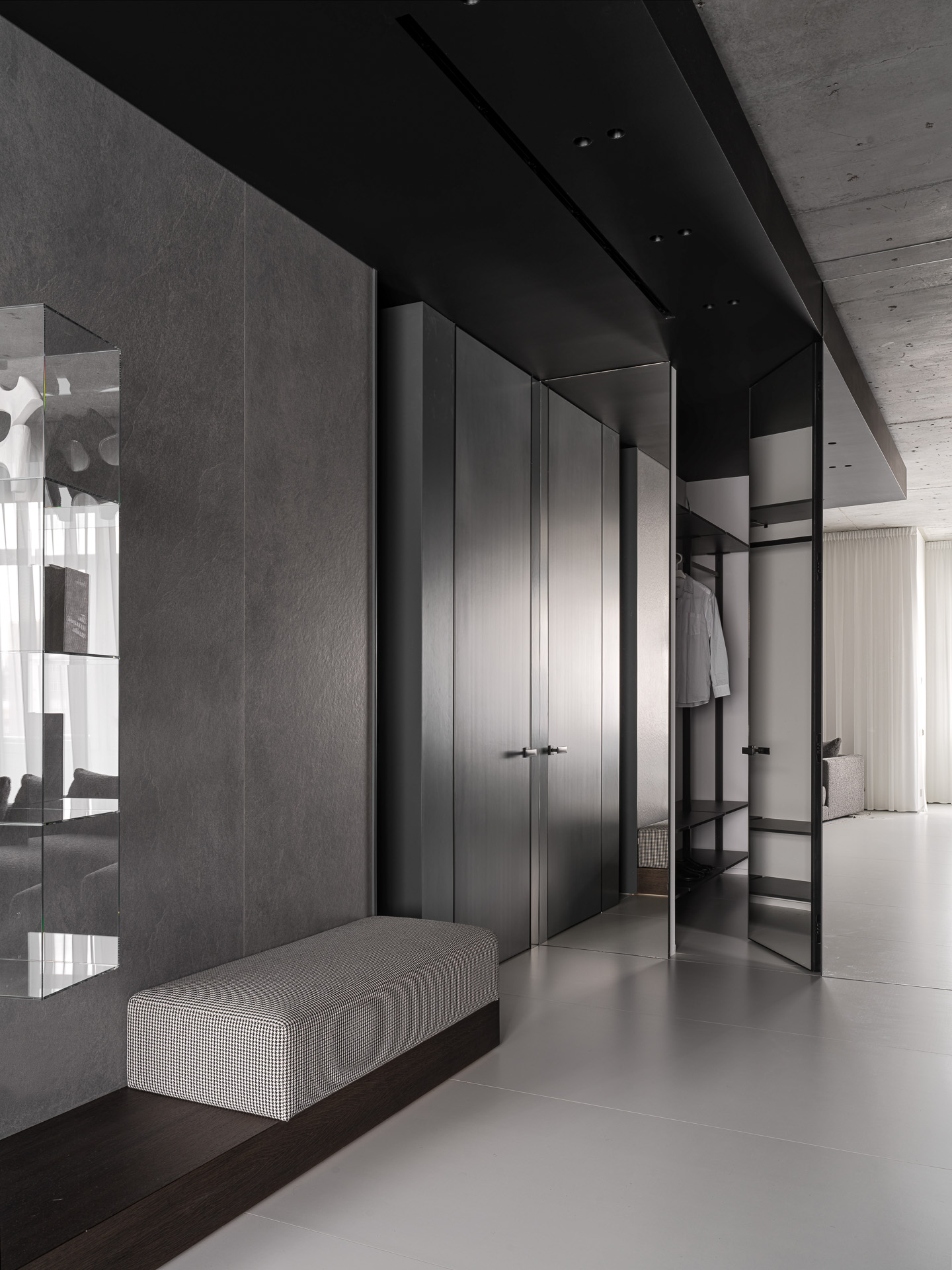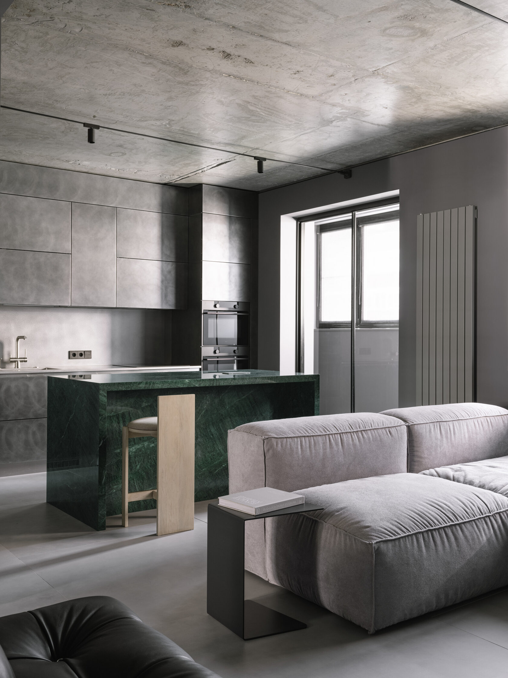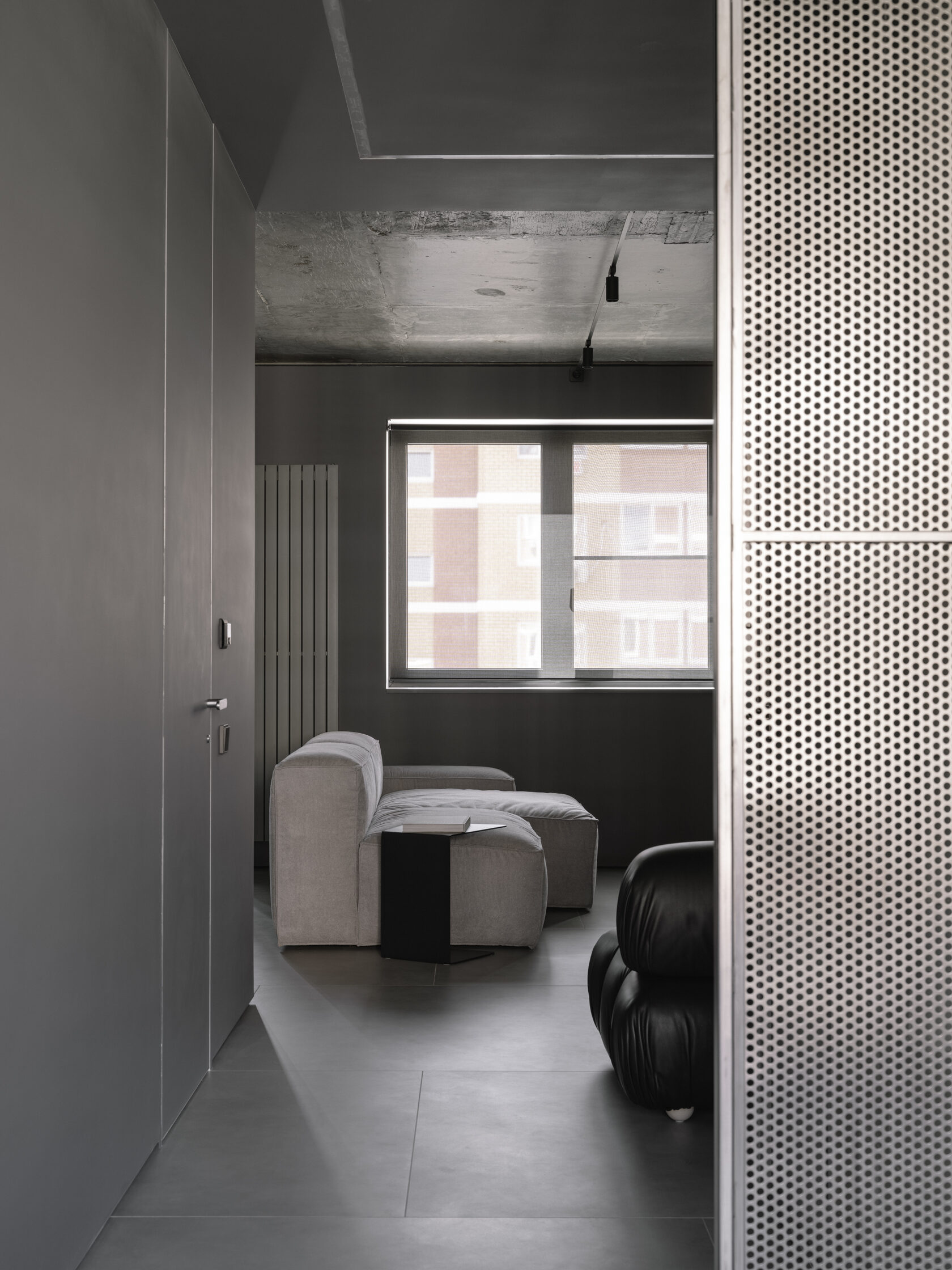 Концепция: Основная концепция — создание динамичного и функционального пространства, открытого к трансформации. Ключевыми элементами стали необычная гардеробная из прозрачного силикатного кирпича со световым потолком, создающим уникальные рефлексы, и смелое решение оставить потолочные плиты в их естественном, фактурном состоянии. Интерьер строится на гармонии сложных серых оттенков, дополненных акцентами малахитового зеленого мрамора. Пространство оптимизировано за счет скрытых систем хранения в ванной комнате, естественного освещения через матовое стекло и раздвижных перегородок из перфорированного металла, обеспечивающих гибкость планировки и визуальную легкость, перекликаясь с прозрачностью силикатного кирпича.
