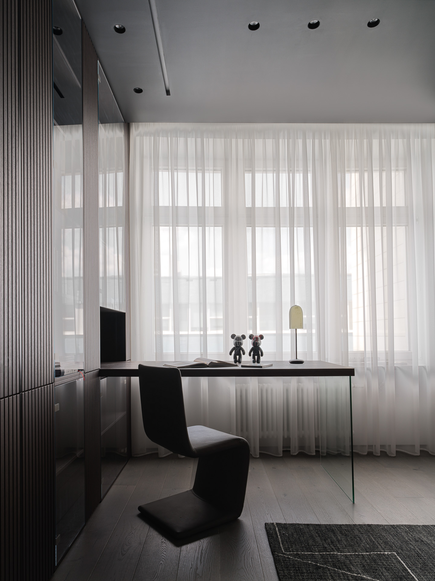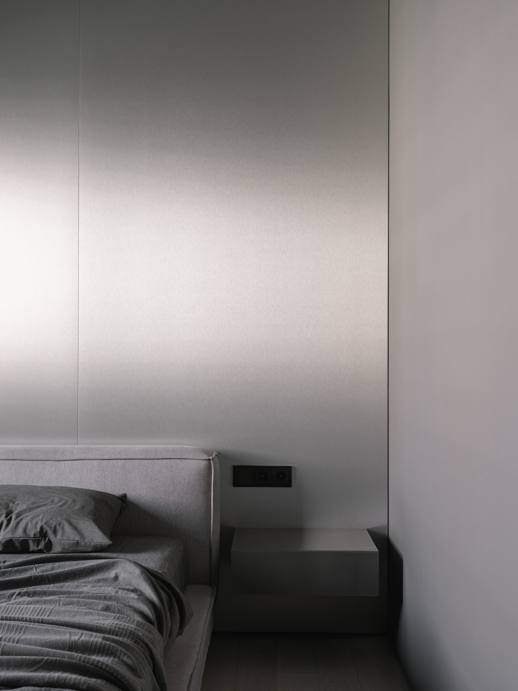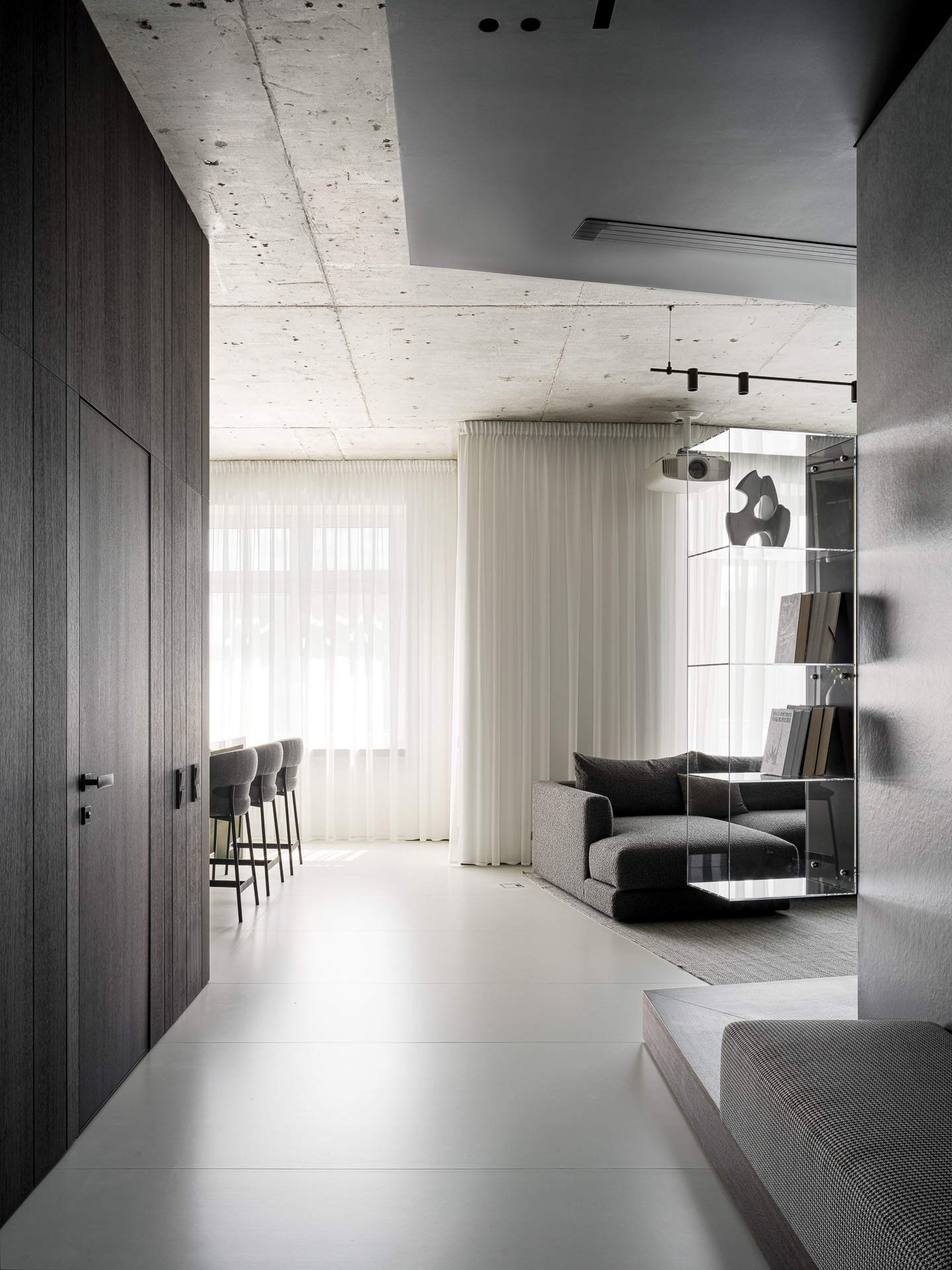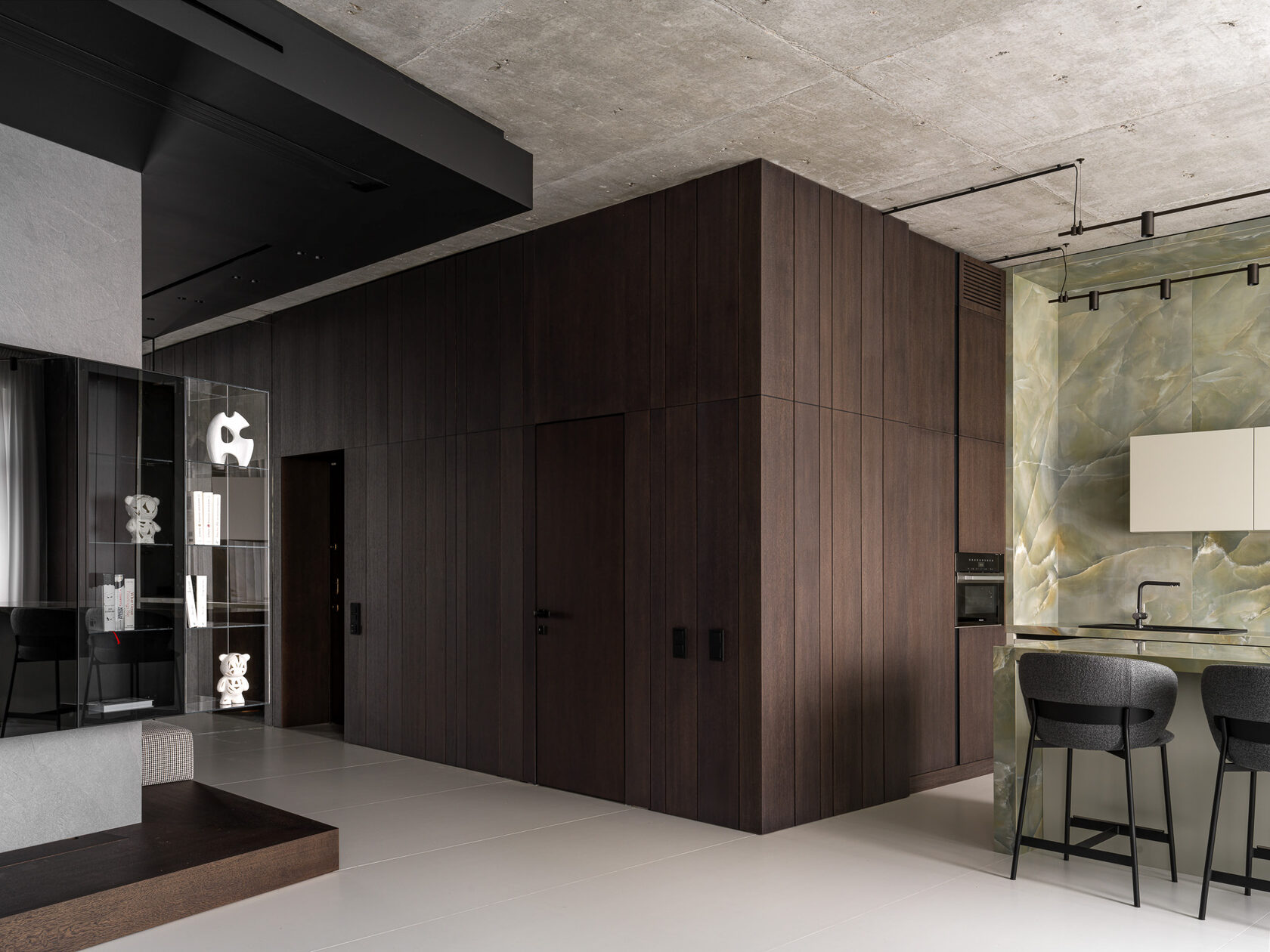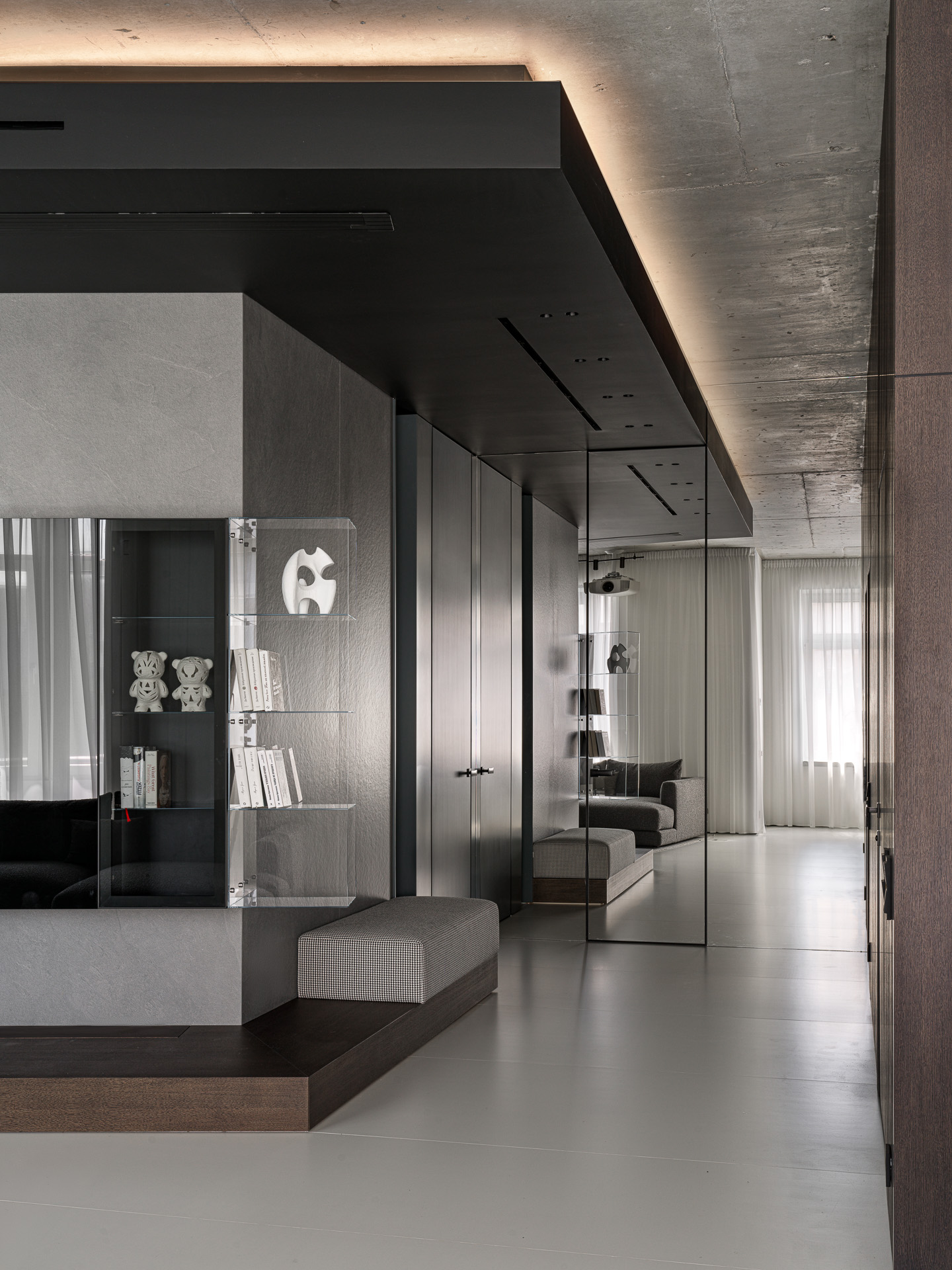 Концепция: Основная концепция — создание динамичного и функционального пространства, открытого к трансформации. Ключевыми элементами стали необычная гардеробная из прозрачного силикатного кирпича со световым потолком, создающим уникальные рефлексы, и смелое решение оставить потолочные плиты в их естественном, фактурном состоянии. Интерьер строится на гармонии сложных серых оттенков, дополненных акцентами малахитового зеленого мрамора. Пространство оптимизировано за счет скрытых систем хранения в ванной комнате, естественного освещения через матовое стекло и раздвижных перегородок из перфорированного металла, обеспечивающих гибкость планировки и визуальную легкость, перекликаясь с прозрачностью силикатного кирпича.