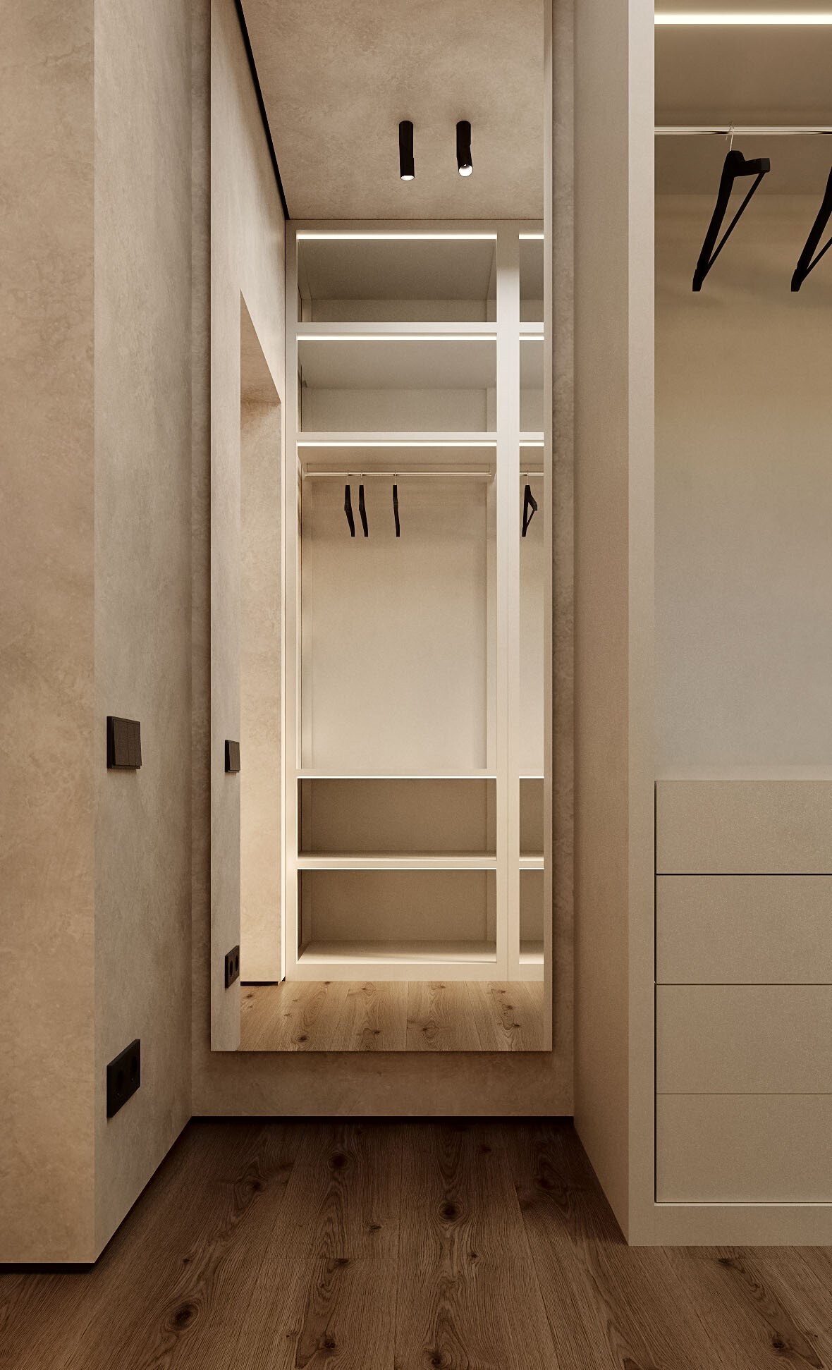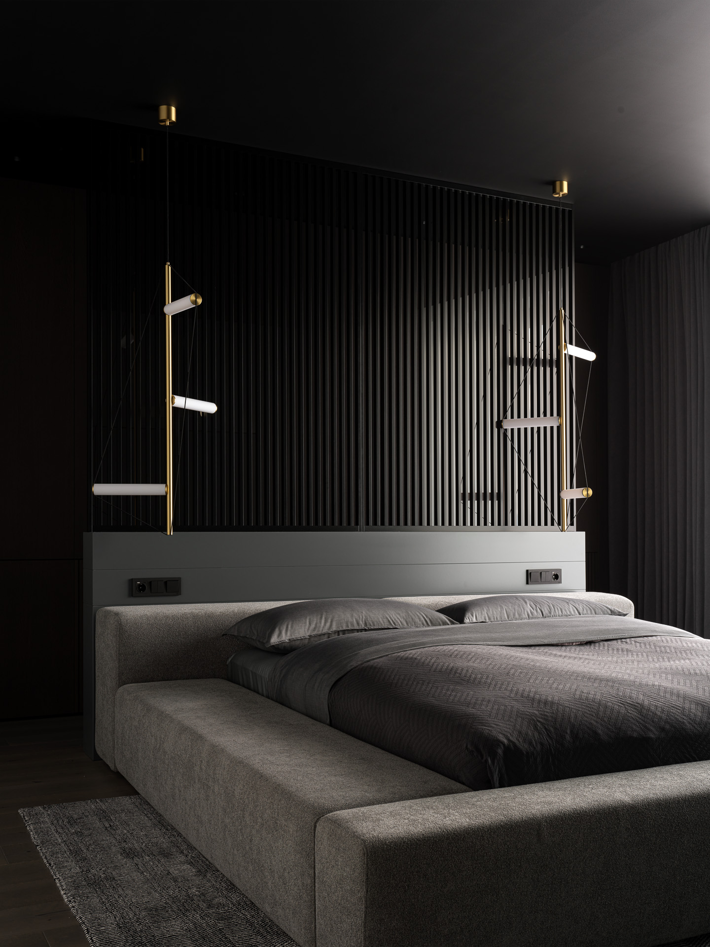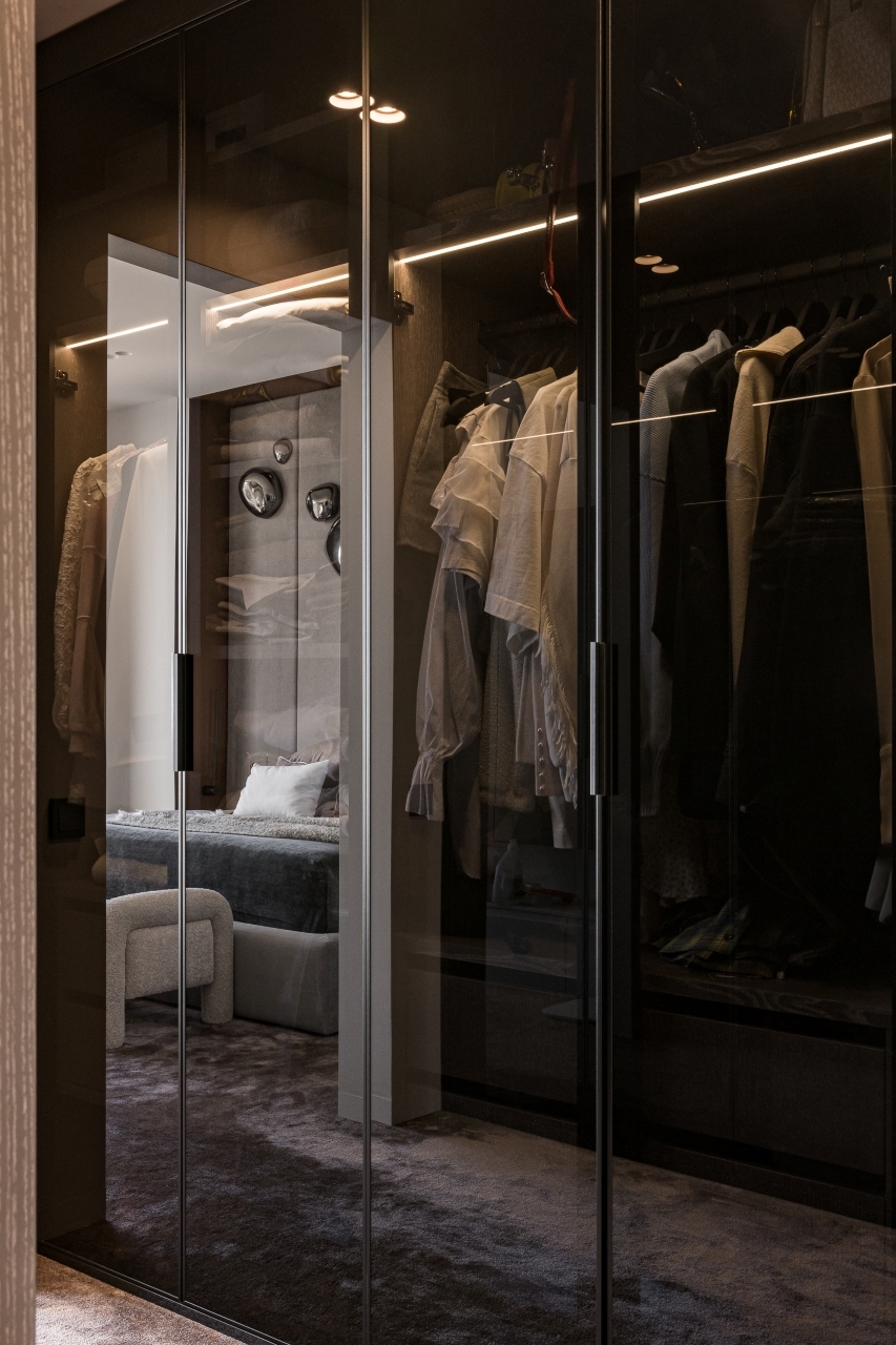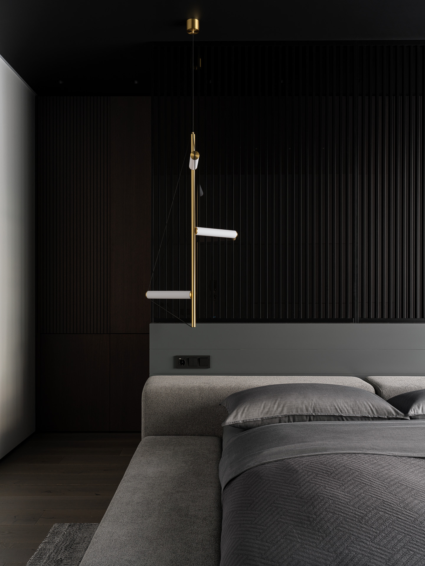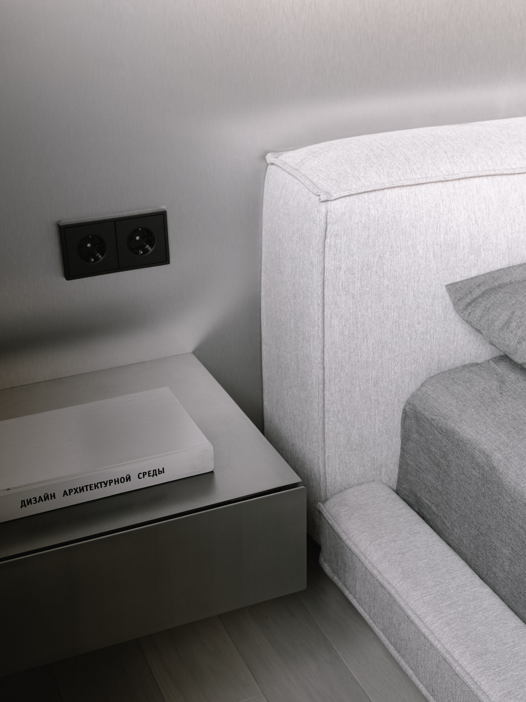 Концепция: Основная концепция — создание динамичного и функционального пространства, открытого к трансформации. Ключевыми элементами стали необычная гардеробная из прозрачного силикатного кирпича со световым потолком, создающим уникальные рефлексы, и смелое решение оставить потолочные плиты в их естественном, фактурном состоянии. Интерьер строится на гармонии сложных серых оттенков, дополненных акцентами малахитового зеленого мрамора. Пространство оптимизировано за счет скрытых систем хранения в ванной комнате, естественного освещения через матовое стекло и раздвижных перегородок из перфорированного металла, обеспечивающих гибкость планировки и визуальную легкость, перекликаясь с прозрачностью силикатного кирпича.