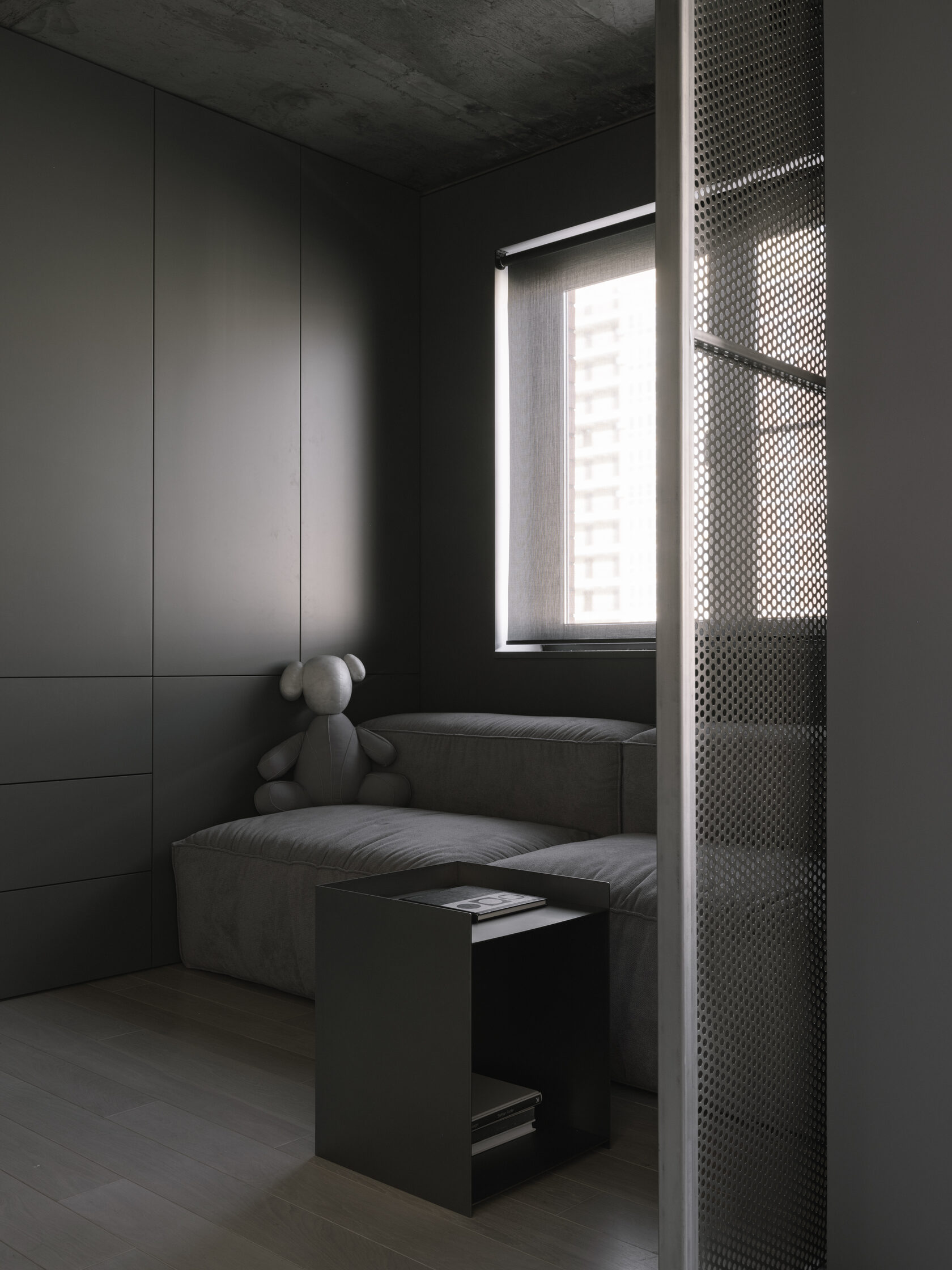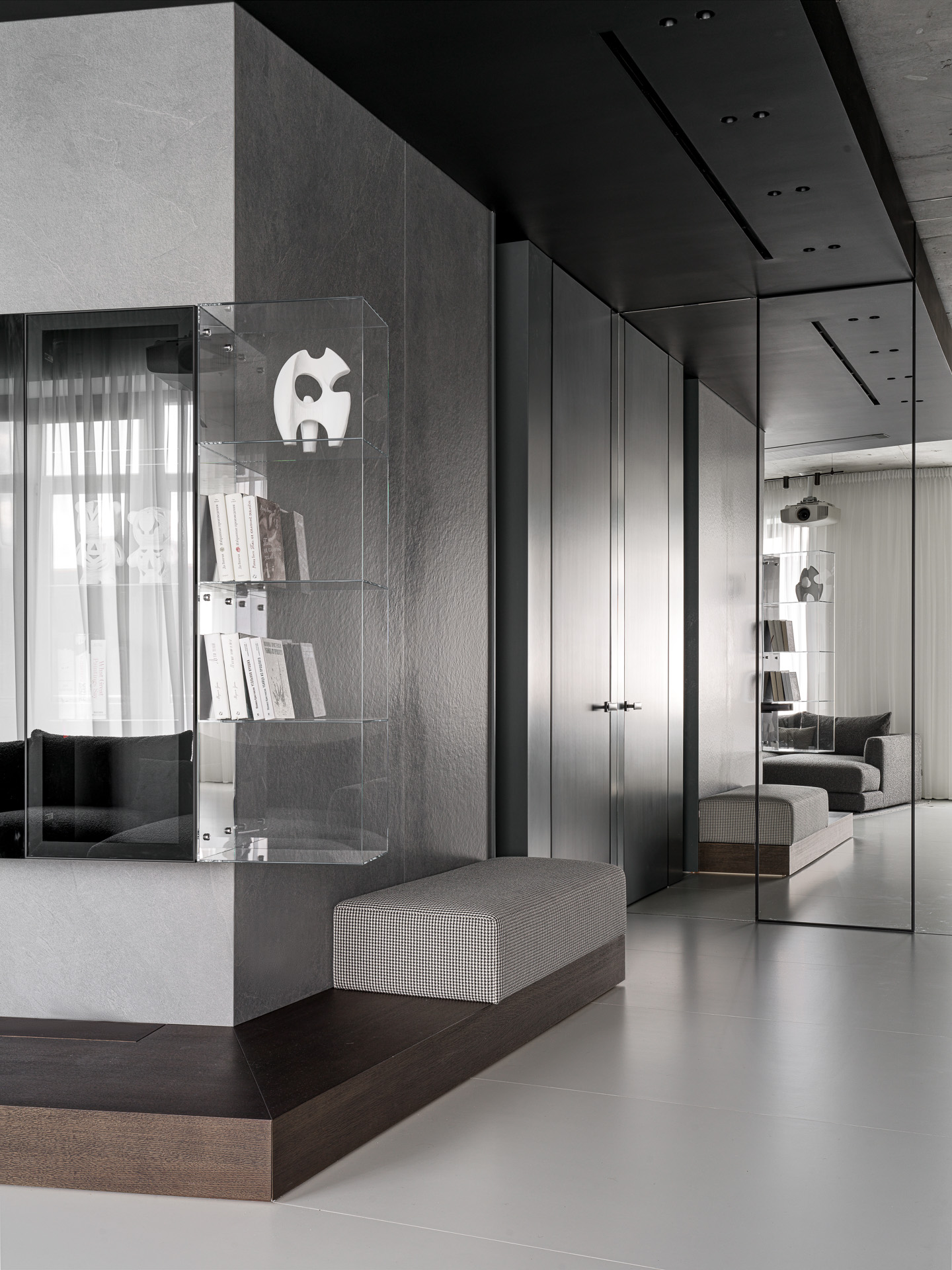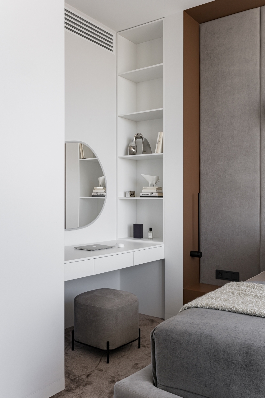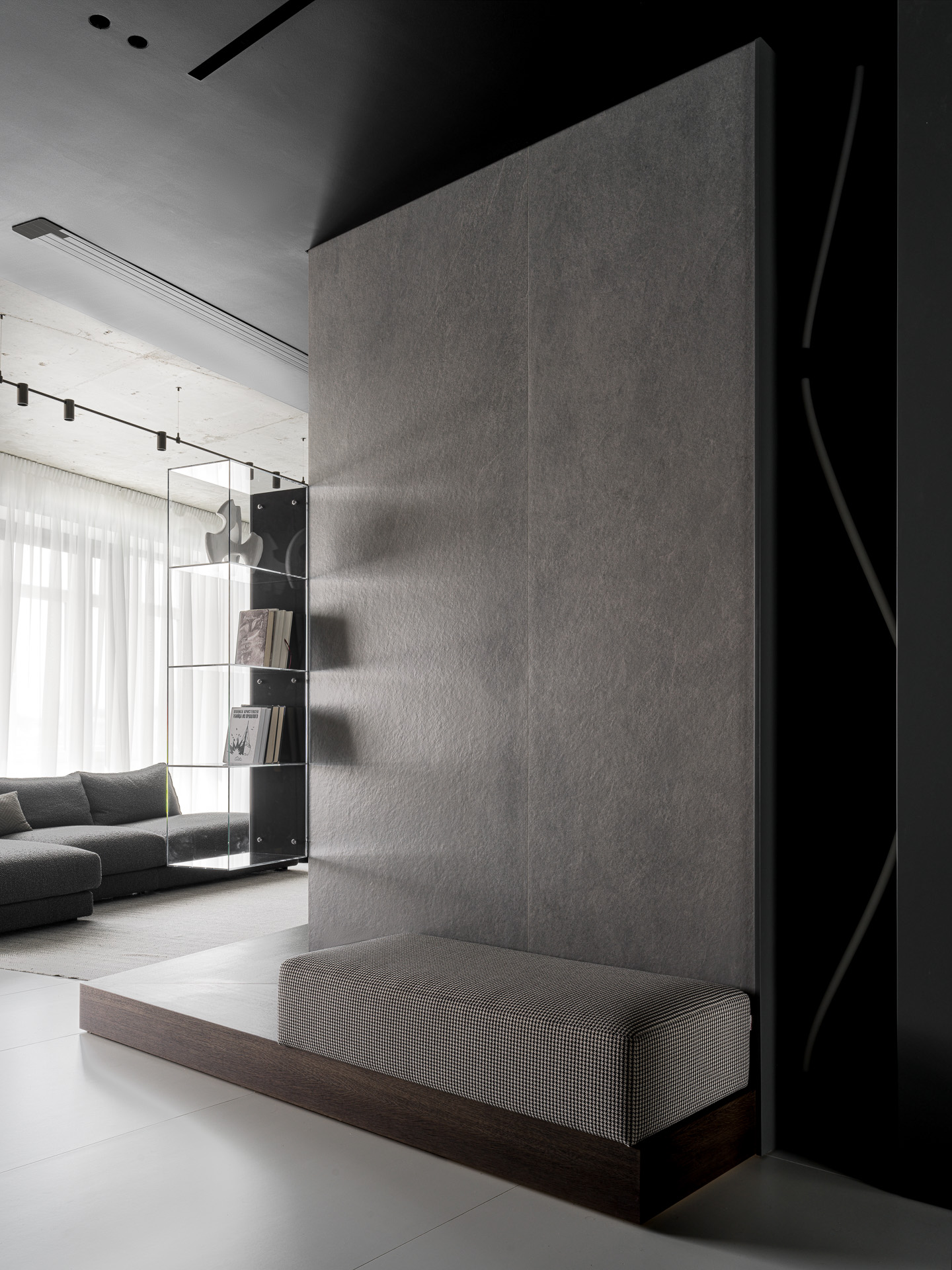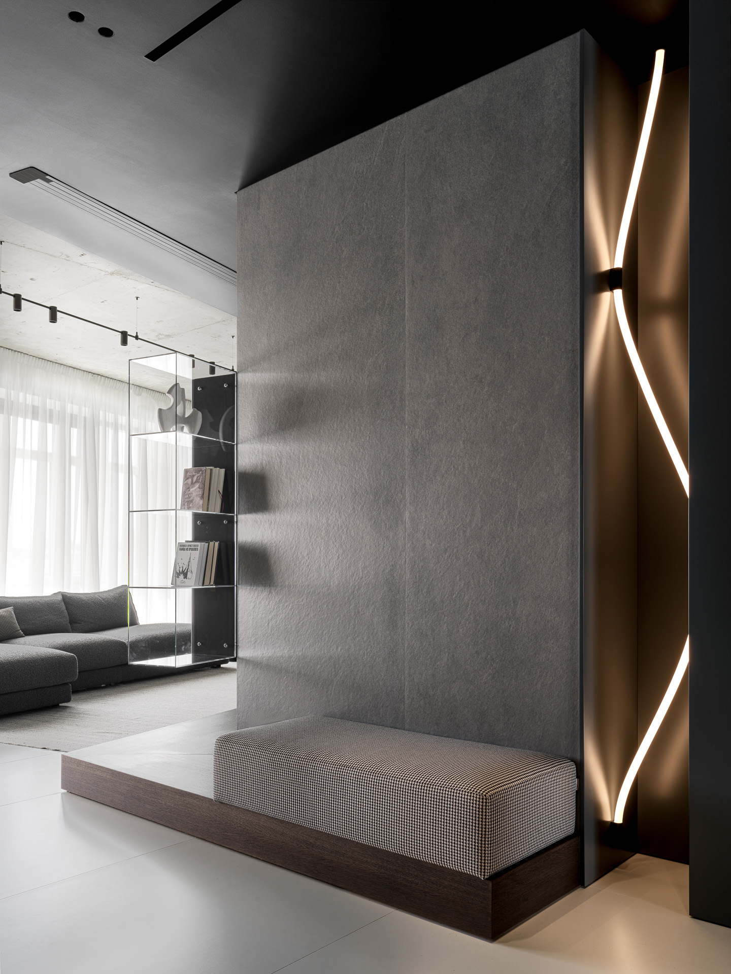 Концепция: Основная концепция — создание динамичного и функционального пространства, открытого к трансформации. Ключевыми элементами стали необычная гардеробная из прозрачного силикатного кирпича со световым потолком, создающим уникальные рефлексы, и смелое решение оставить потолочные плиты в их естественном, фактурном состоянии. Интерьер строится на гармонии сложных серых оттенков, дополненных акцентами малахитового зеленого мрамора. Пространство оптимизировано за счет скрытых систем хранения в ванной комнате, естественного освещения через матовое стекло и раздвижных перегородок из перфорированного металла, обеспечивающих гибкость планировки и визуальную легкость, перекликаясь с прозрачностью силикатного кирпича.