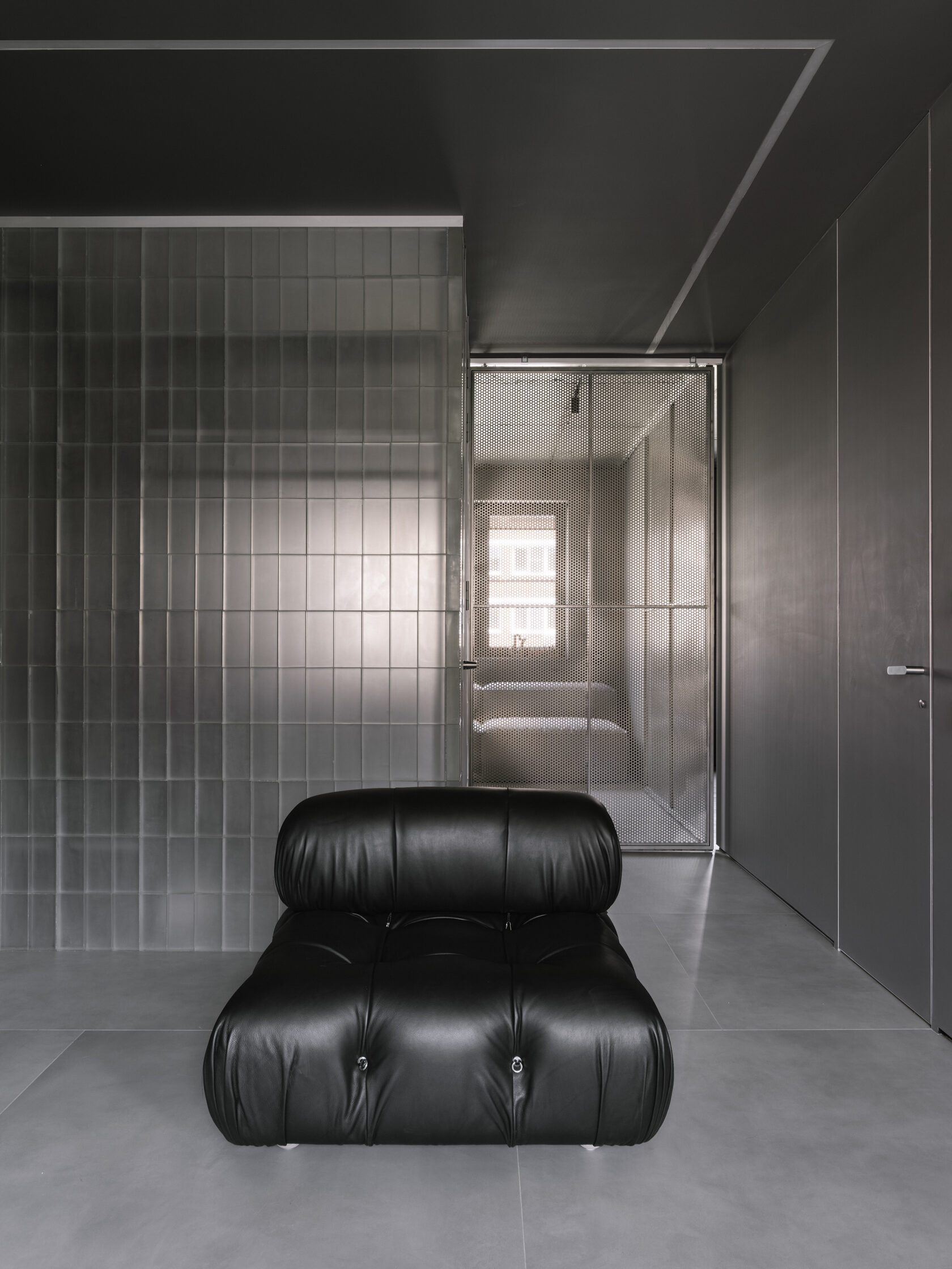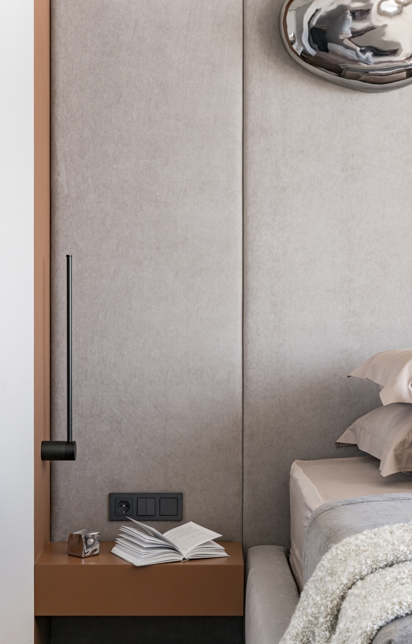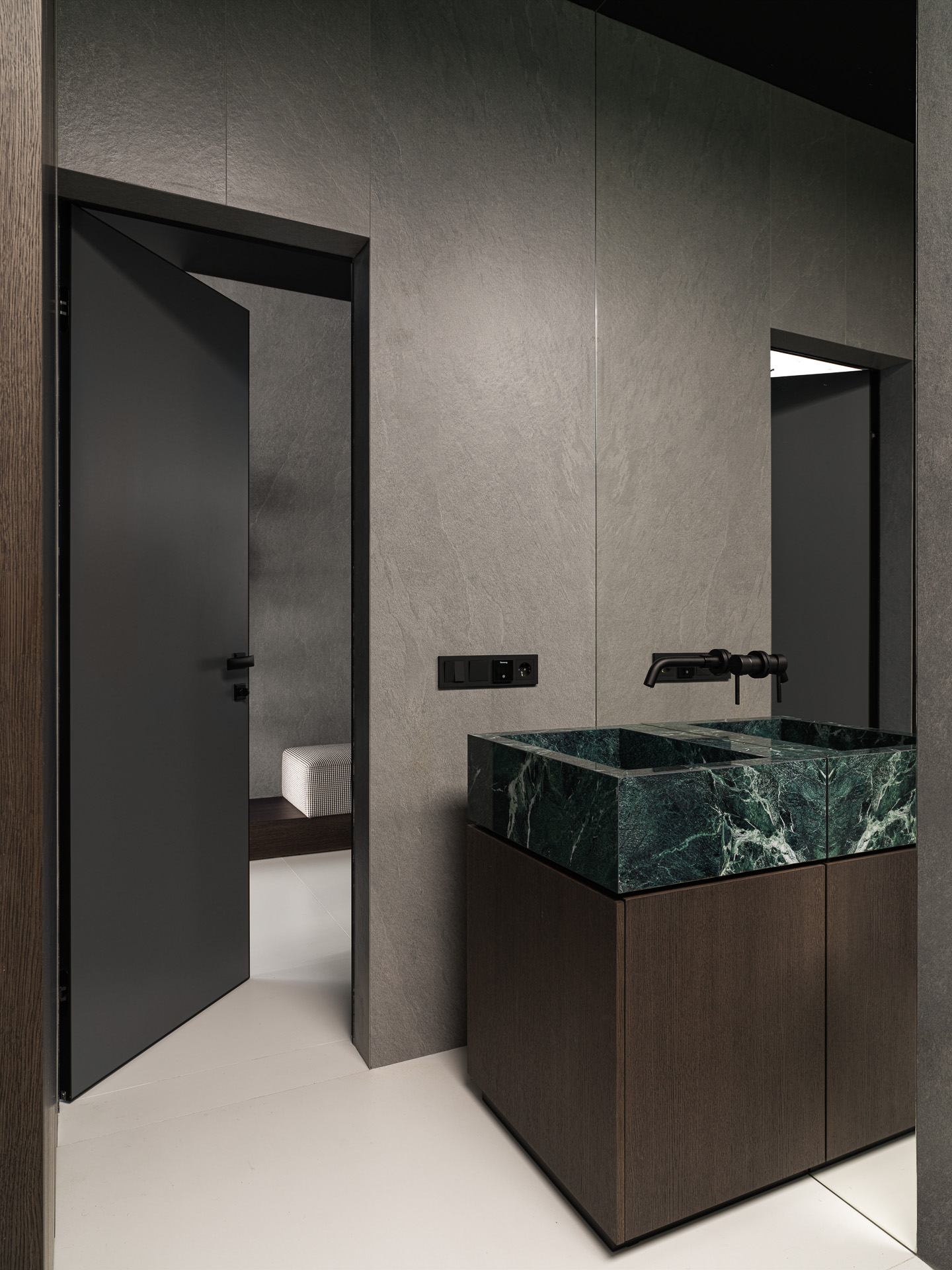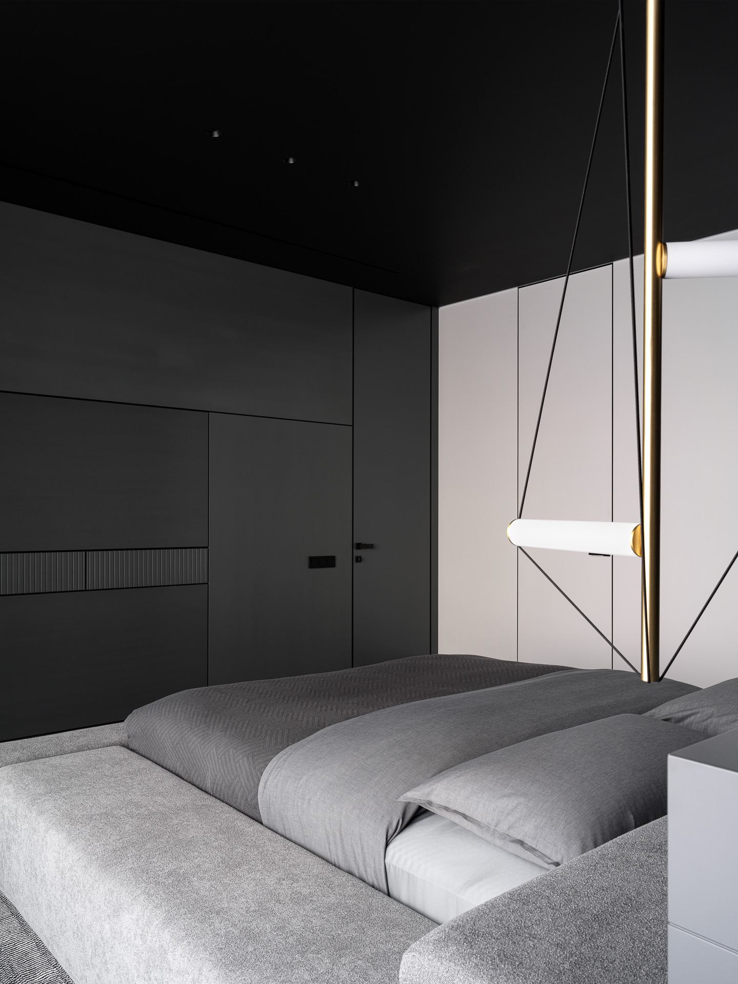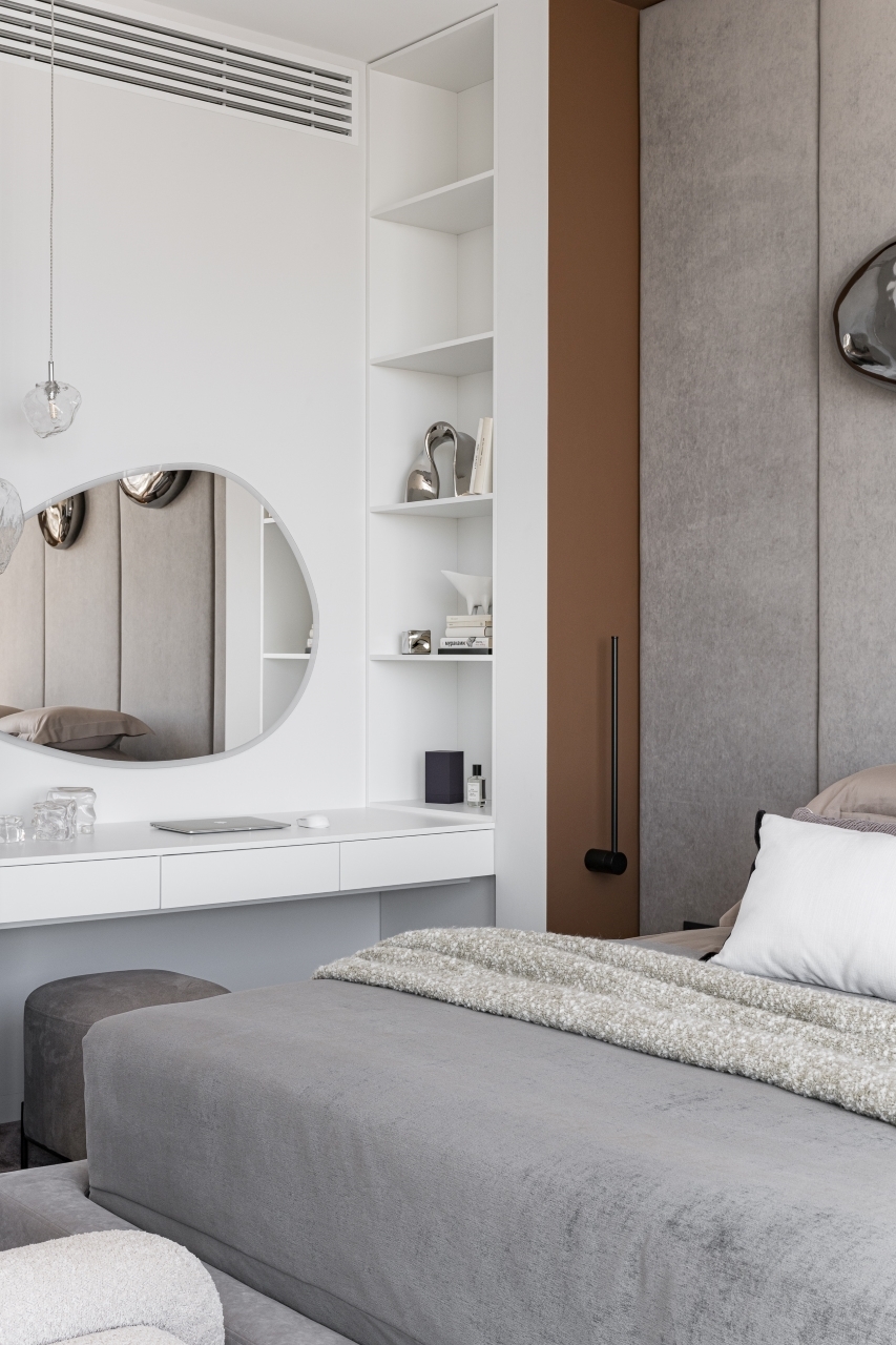 Концепция: Основная концепция — создание динамичного и функционального пространства, открытого к трансформации. Ключевыми элементами стали необычная гардеробная из прозрачного силикатного кирпича со световым потолком, создающим уникальные рефлексы, и смелое решение оставить потолочные плиты в их естественном, фактурном состоянии. Интерьер строится на гармонии сложных серых оттенков, дополненных акцентами малахитового зеленого мрамора. Пространство оптимизировано за счет скрытых систем хранения в ванной комнате, естественного освещения через матовое стекло и раздвижных перегородок из перфорированного металла, обеспечивающих гибкость планировки и визуальную легкость, перекликаясь с прозрачностью силикатного кирпича.