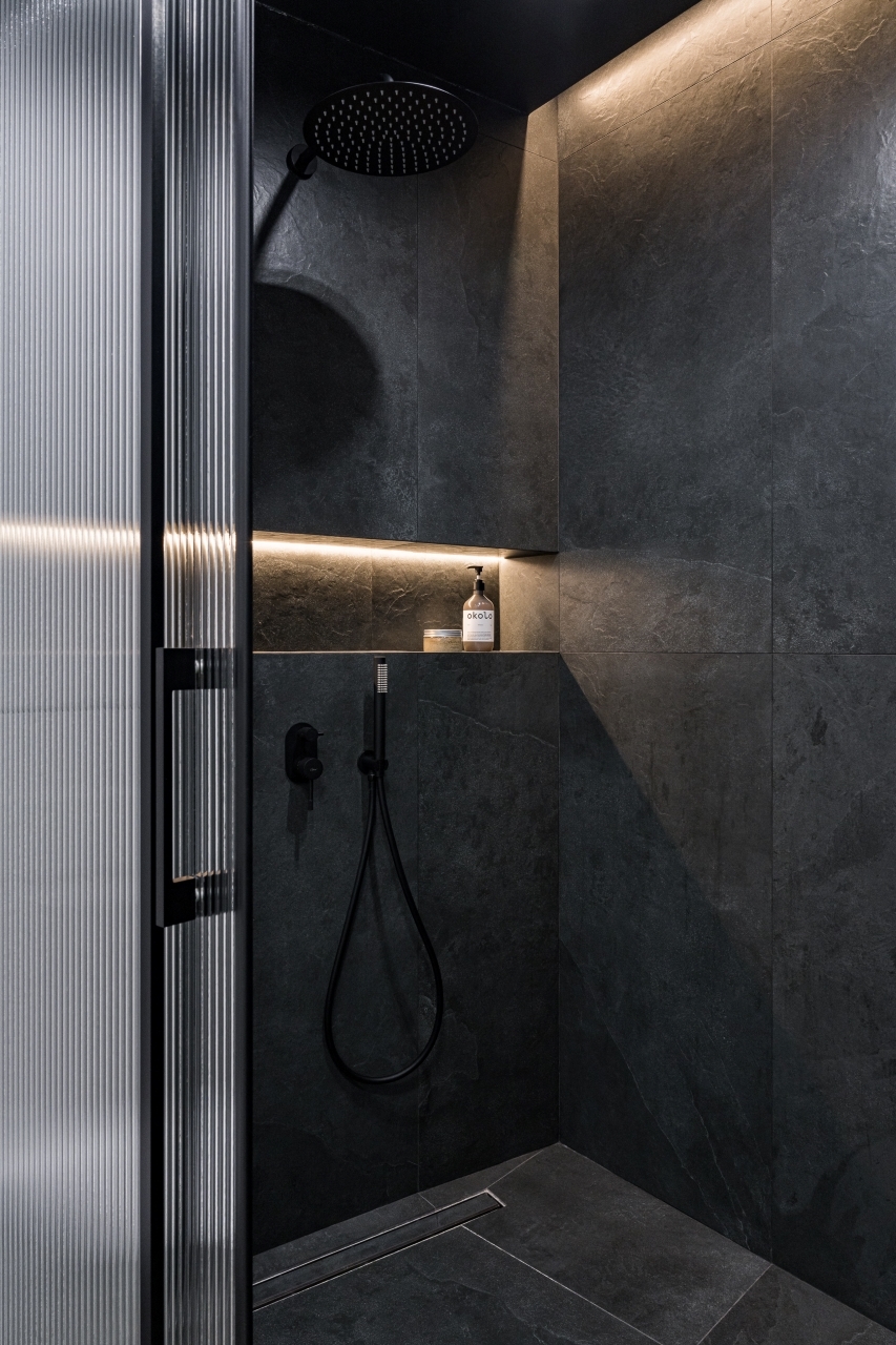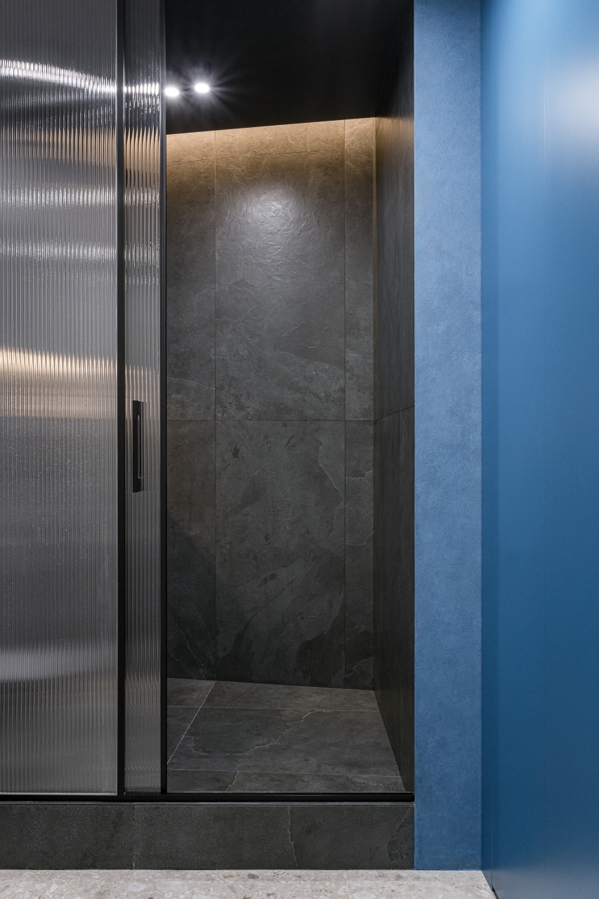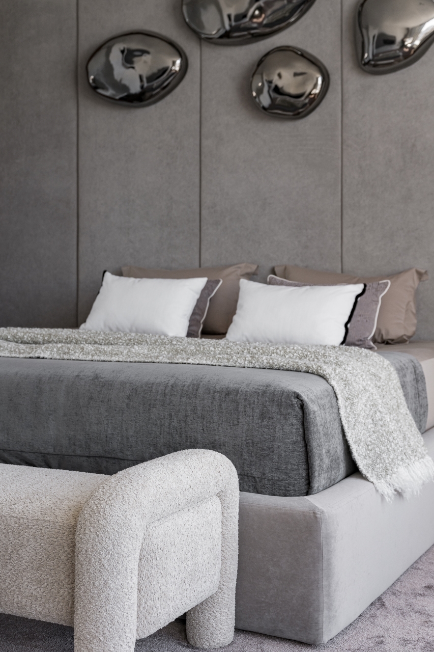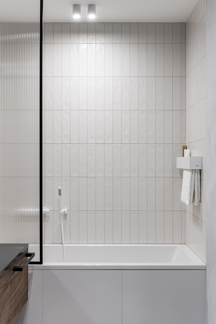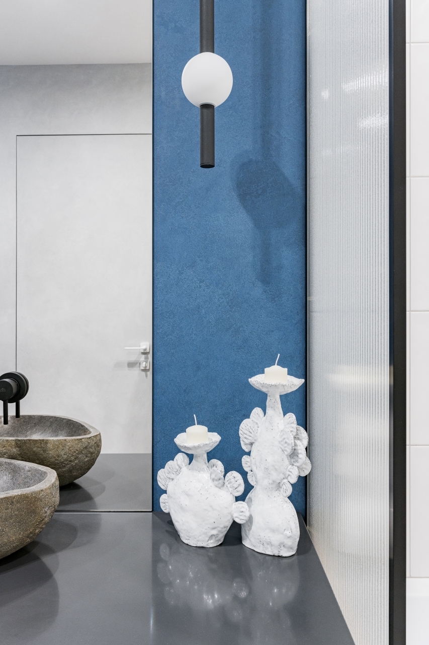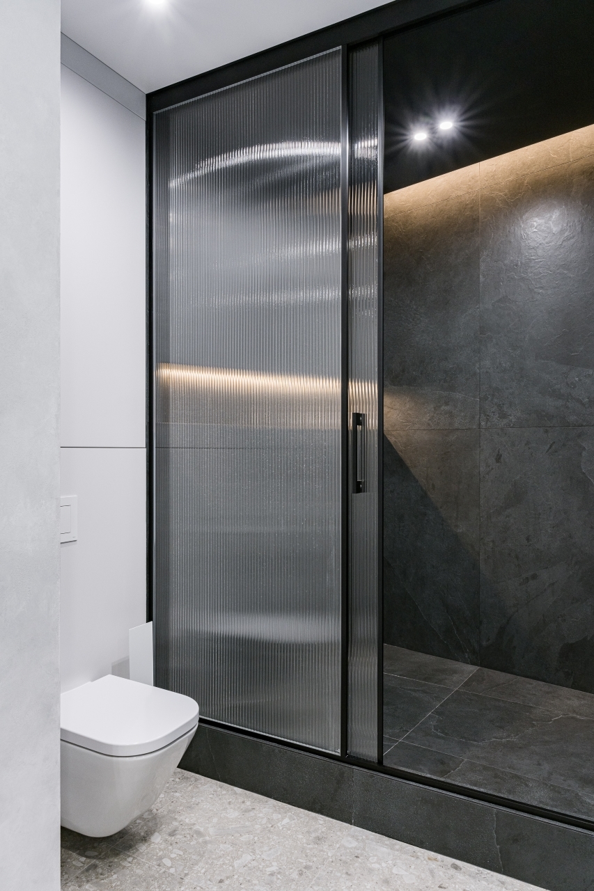 Концепция: Основная концепция — создание динамичного и функционального пространства, открытого к трансформации. Ключевыми элементами стали необычная гардеробная из прозрачного силикатного кирпича со световым потолком, создающим уникальные рефлексы, и смелое решение оставить потолочные плиты в их естественном, фактурном состоянии. Интерьер строится на гармонии сложных серых оттенков, дополненных акцентами малахитового зеленого мрамора. Пространство оптимизировано за счет скрытых систем хранения в ванной комнате, естественного освещения через матовое стекло и раздвижных перегородок из перфорированного металла, обеспечивающих гибкость планировки и визуальную легкость, перекликаясь с прозрачностью силикатного кирпича.