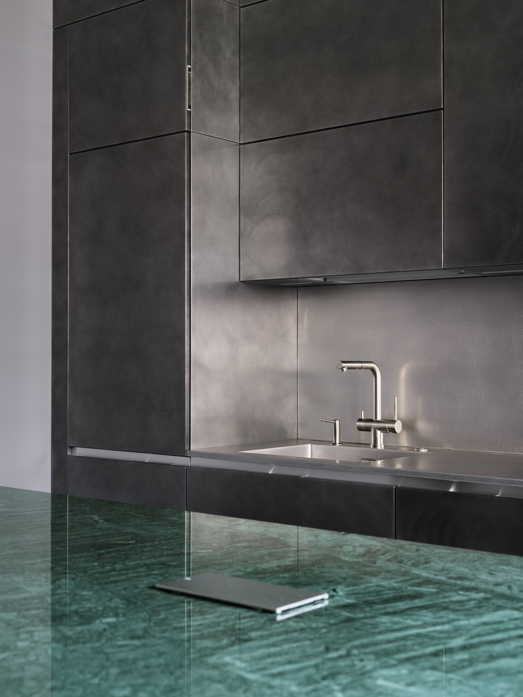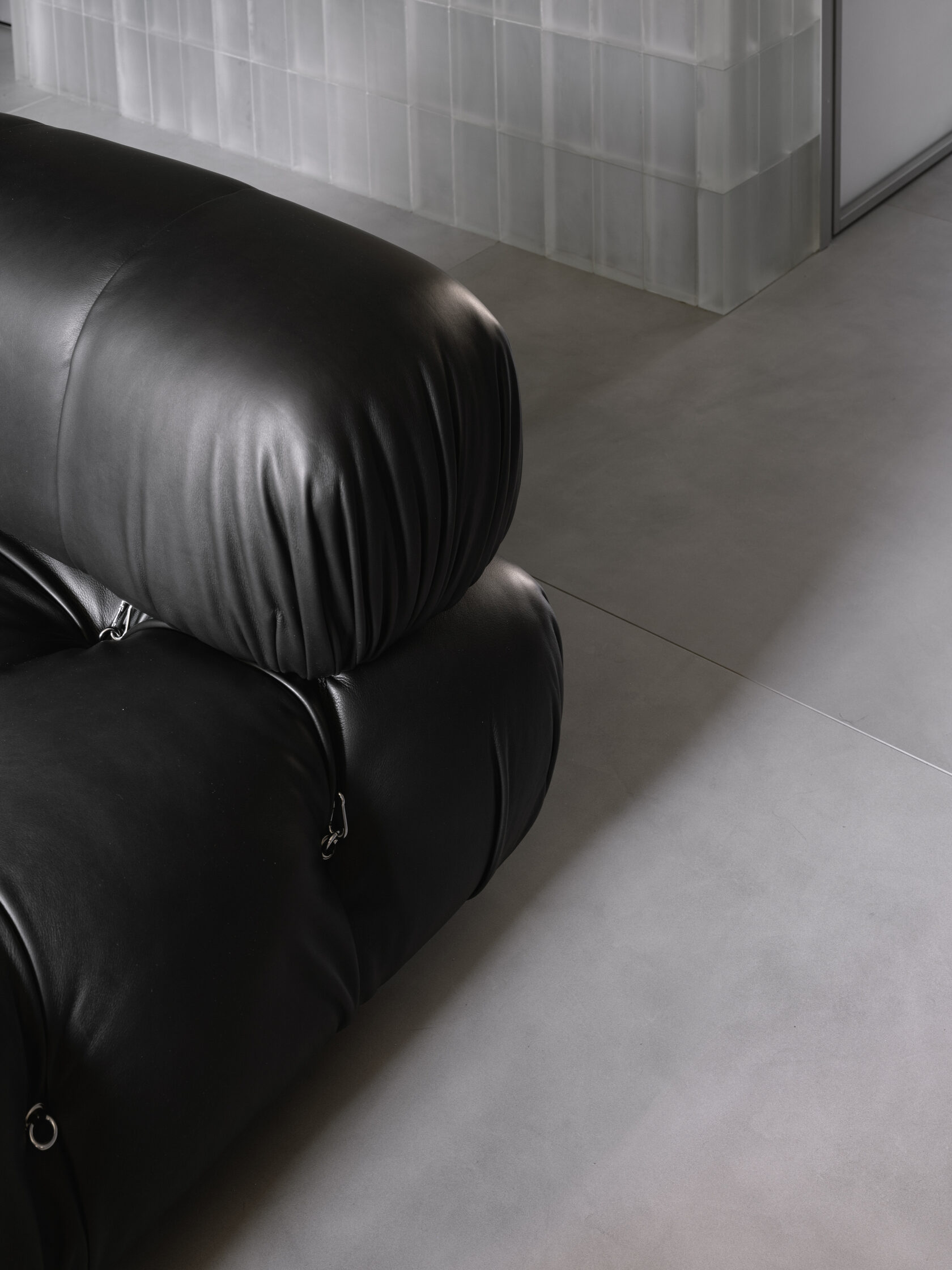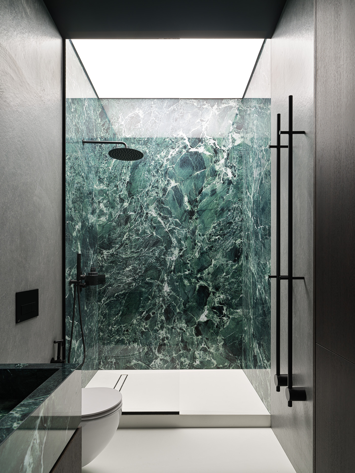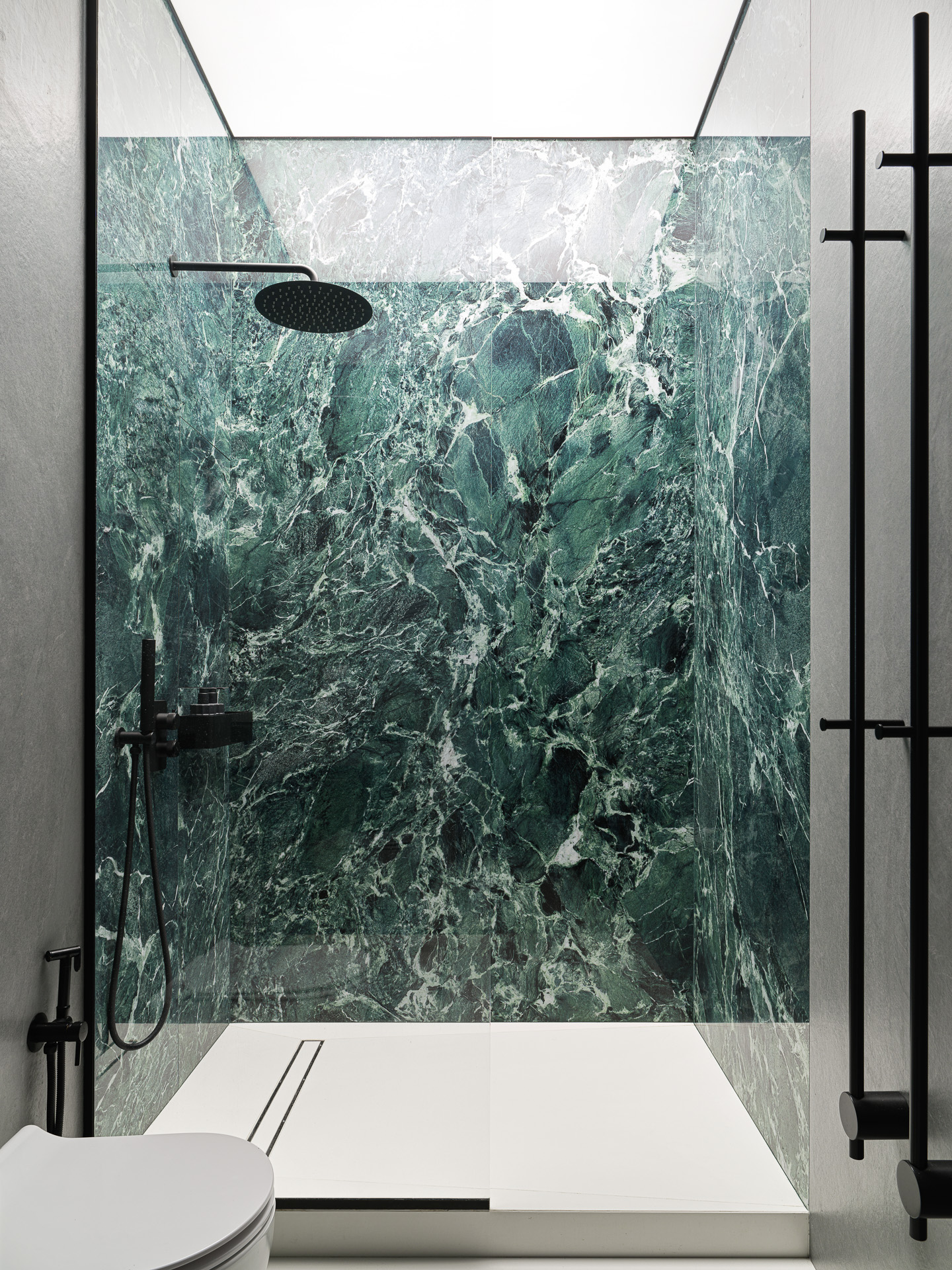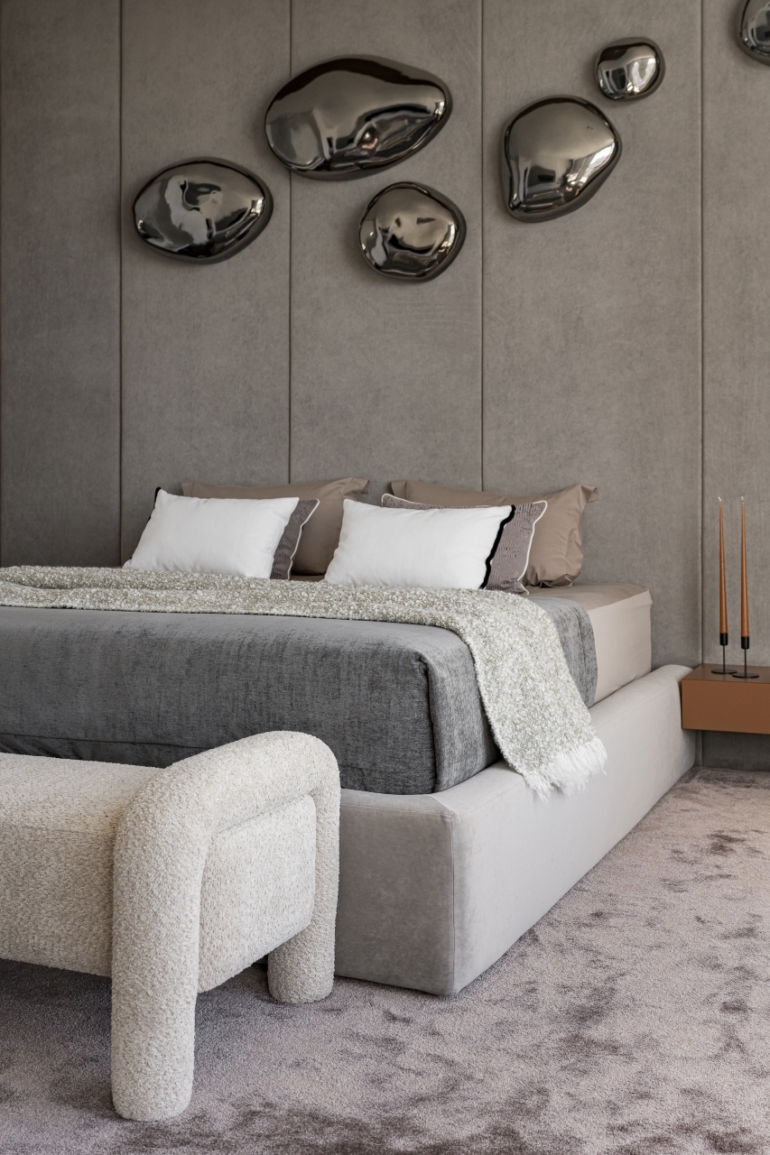 Концепция: Основная концепция — создание динамичного и функционального пространства, открытого к трансформации. Ключевыми элементами стали необычная гардеробная из прозрачного силикатного кирпича со световым потолком, создающим уникальные рефлексы, и смелое решение оставить потолочные плиты в их естественном, фактурном состоянии. Интерьер строится на гармонии сложных серых оттенков, дополненных акцентами малахитового зеленого мрамора. Пространство оптимизировано за счет скрытых систем хранения в ванной комнате, естественного освещения через матовое стекло и раздвижных перегородок из перфорированного металла, обеспечивающих гибкость планировки и визуальную легкость, перекликаясь с прозрачностью силикатного кирпича.
